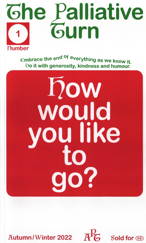 Le premier numéro du magazine The Palliative Turn a été conçu et produit dans le contexte de l'exposition et du programme d'événements The Palliative Turn au Künstlerhaus de Brême. Il documente l'ensemble des activités de l'APT à ce jour et présente des contributions individuelles de membres de l'APT. Les contributions ont été recueillies par un appel ouvert aux membres et associés de l'APT et sélectionnées par une équipe éditoriale composée de Simon Blanck, Kasia Fudakowski, Teal Griffin, Harry Haddon, Dafna Maimon, Marit Neeb, Nadja Quante et Olav Westphalen.