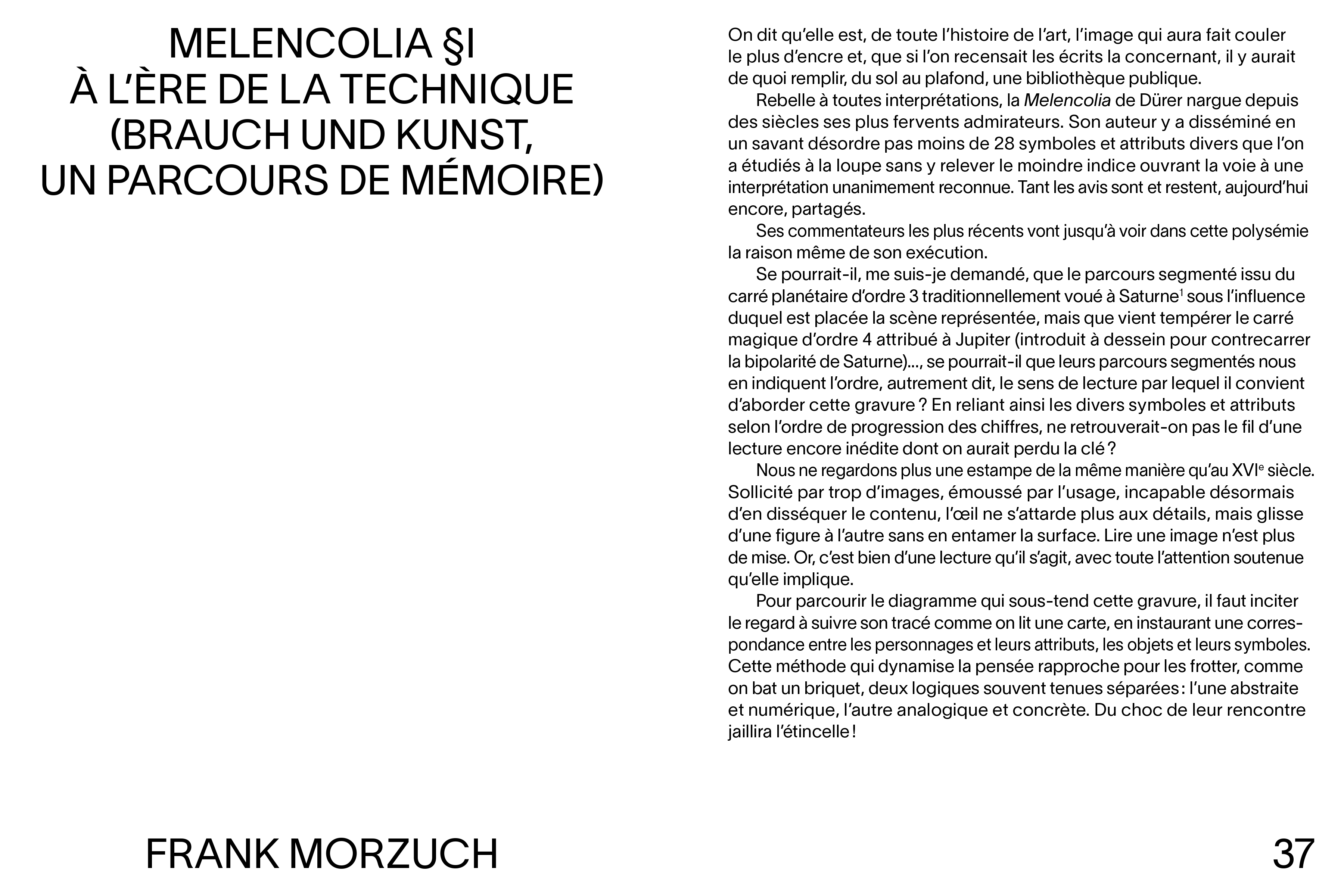 Une des prémisses principales de l'appel, aux accents heideggeriens implicites – « Mélancolie à l'ère de la Technique » – portait autour de l'actualisation du burin d'Albrecht Dürer Melencholia I (1514). On trouve donc dans le présent numéro de nombreuses références à cette gravure, y compris un article de fond, celui de Frank Morzuch, ajoutant une pierre à l'imposant édifice de la critique d'art qui a fait de cette œuvre son objet.