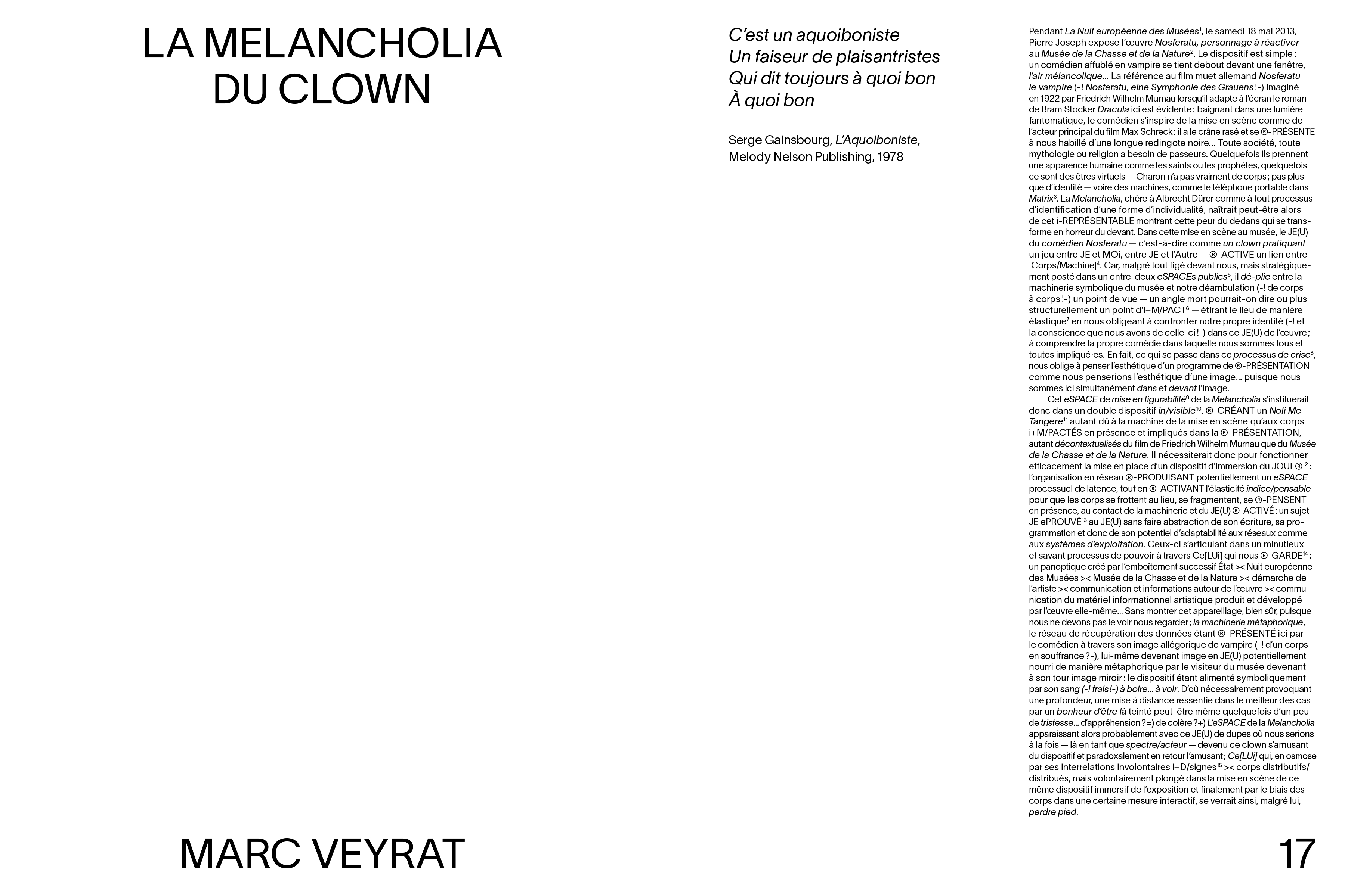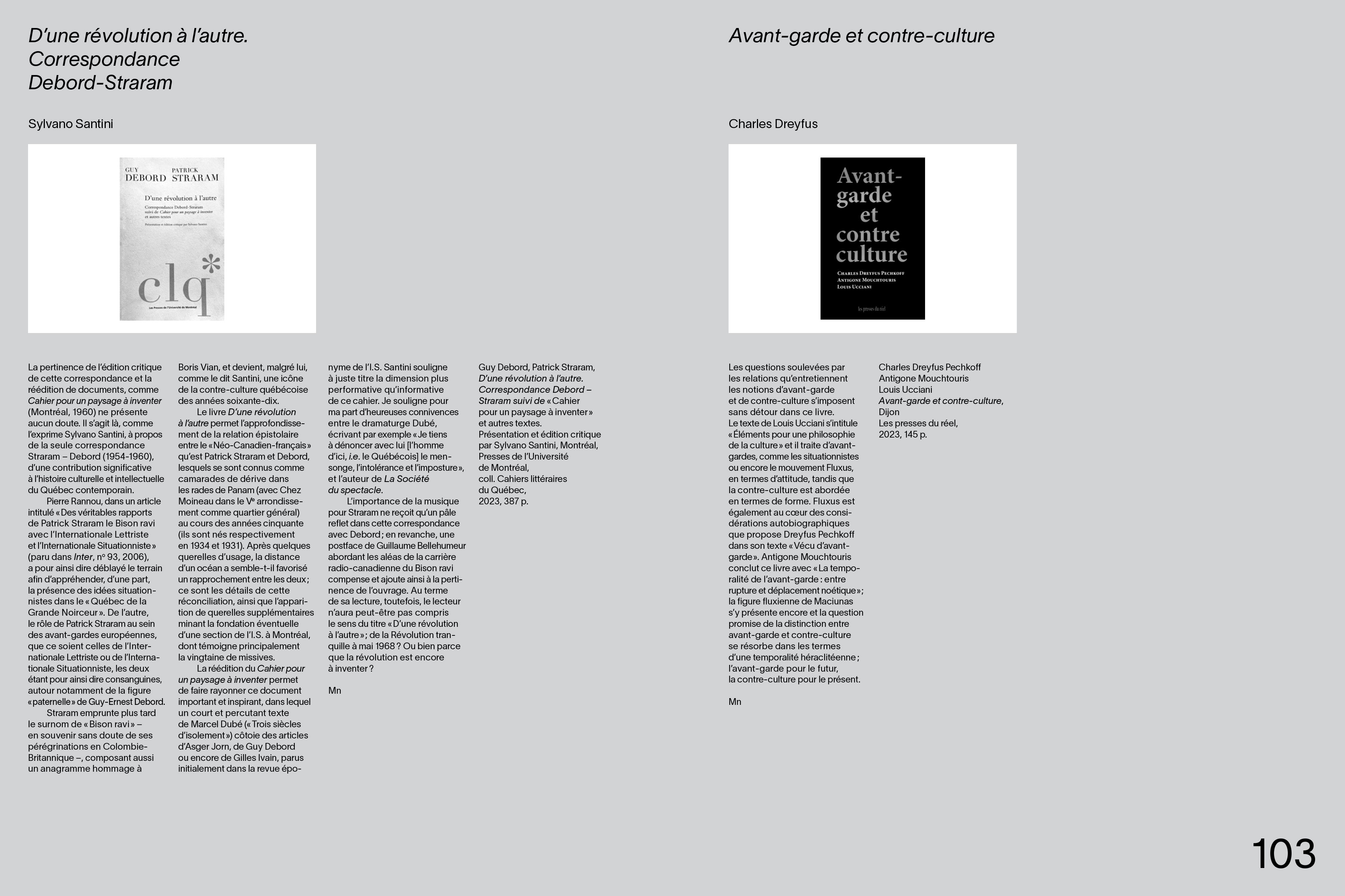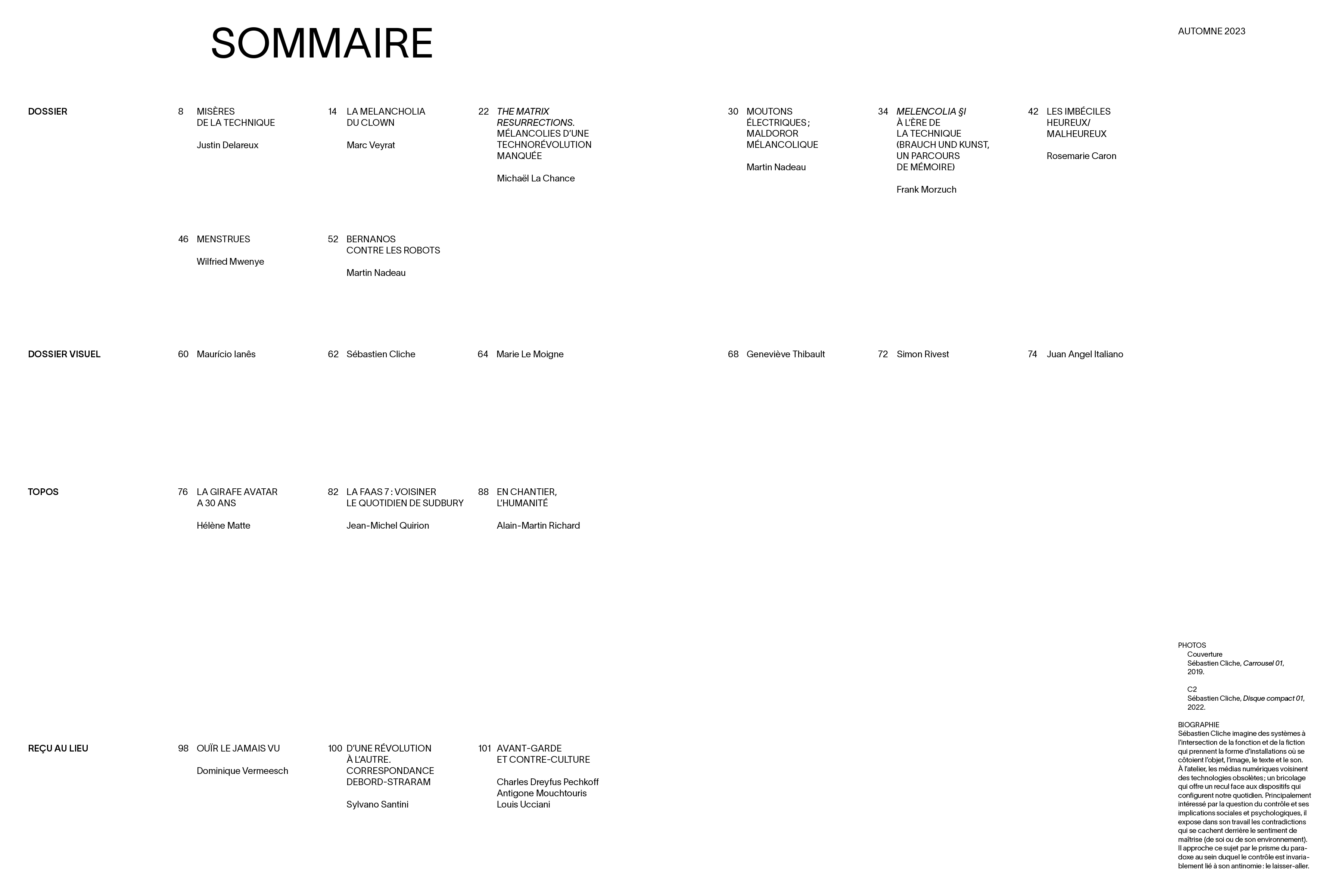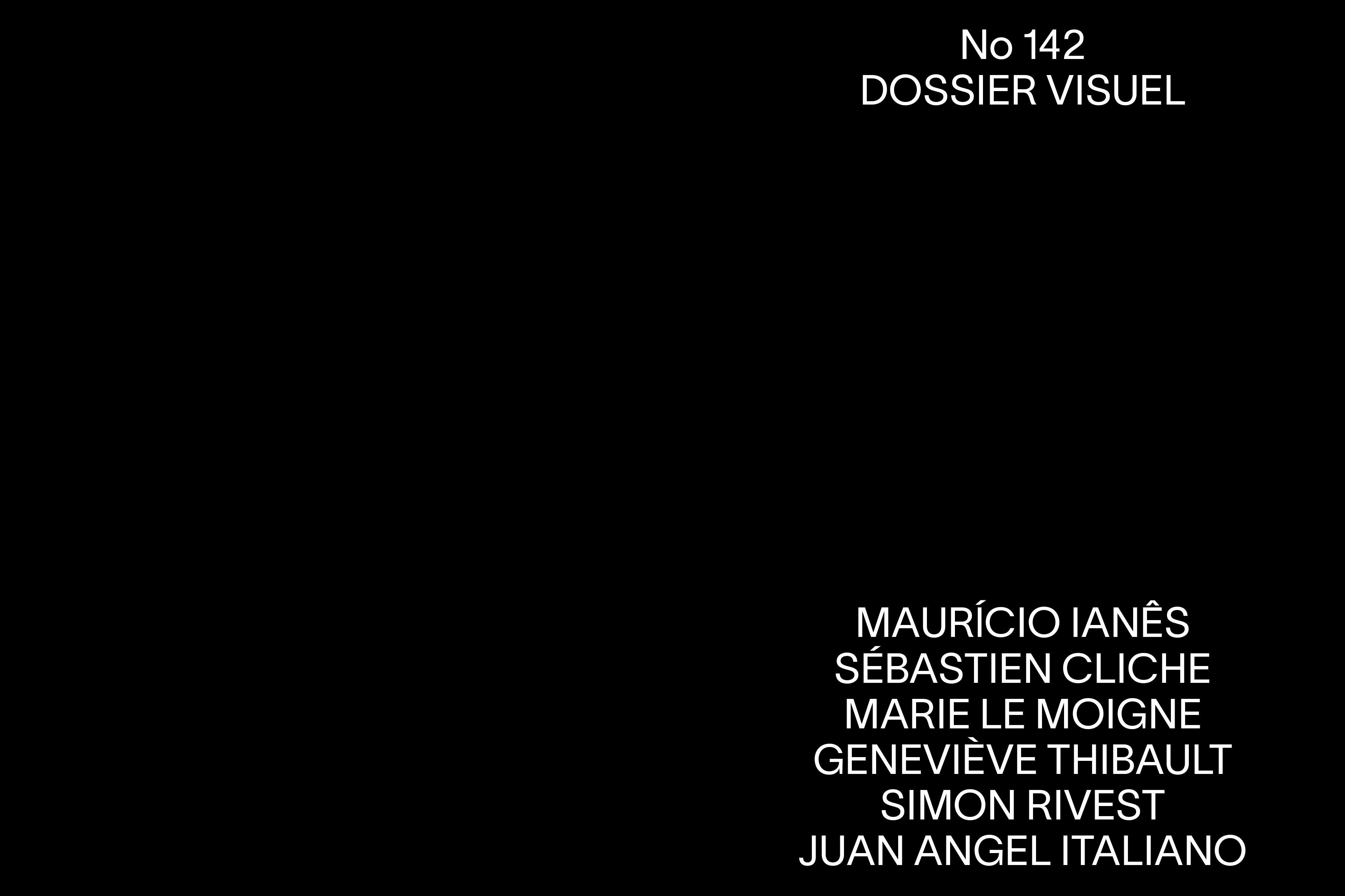 Textes de Rosemarie Caron, Alexandre Castant, Sébastien Cliche, Justin Delareux, Mauricio Ianês, Juan Angel Italiano, Michaël La Chance, Marie Le Moigne, Hélène Matte, Frank Morzuch, Wilfried Mwenye, Martin Nadeau, Jean-Michel Quirion, Alain-Martin Richard, Simon Rivest, Geneviève Thibault, Marc Veyrat.