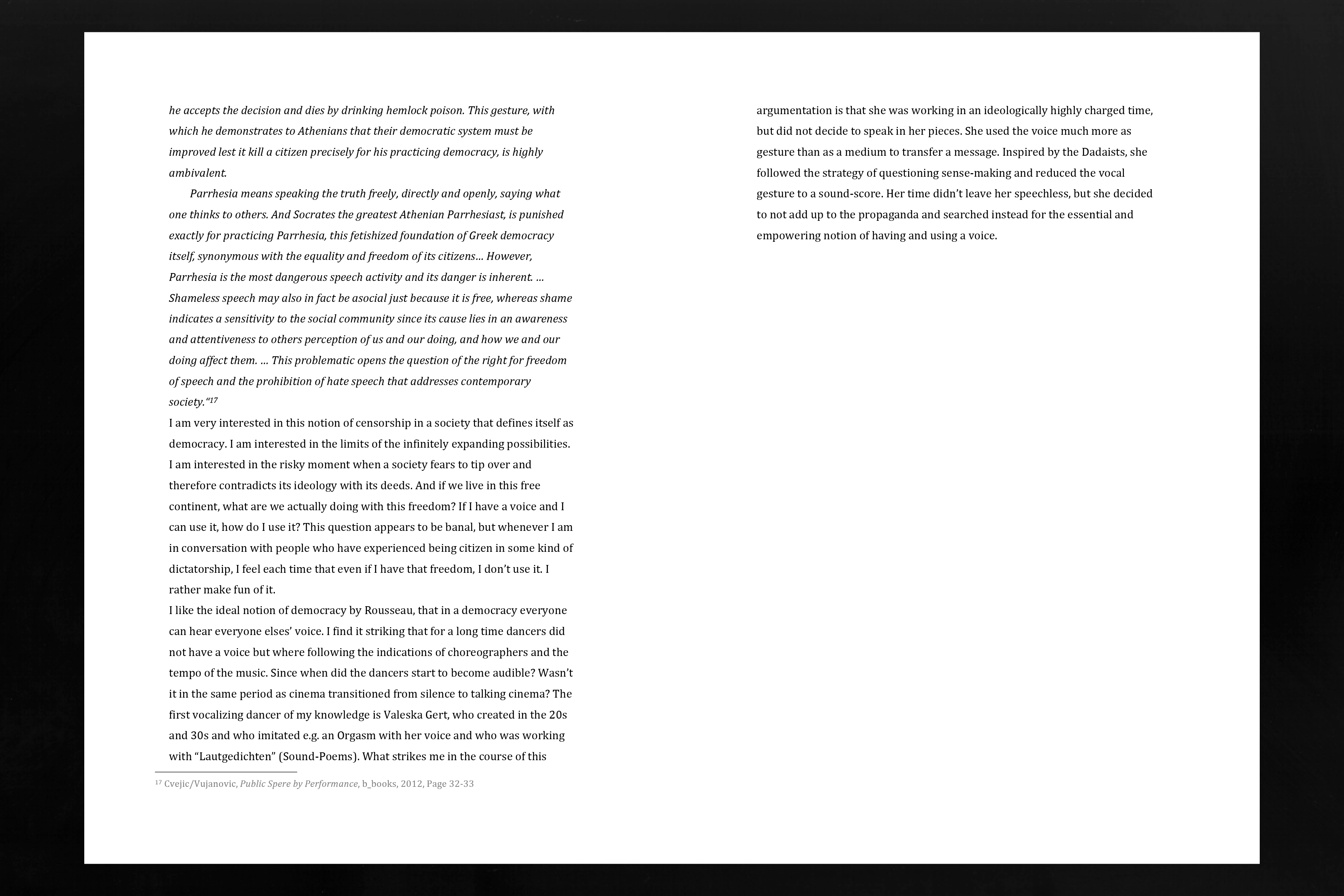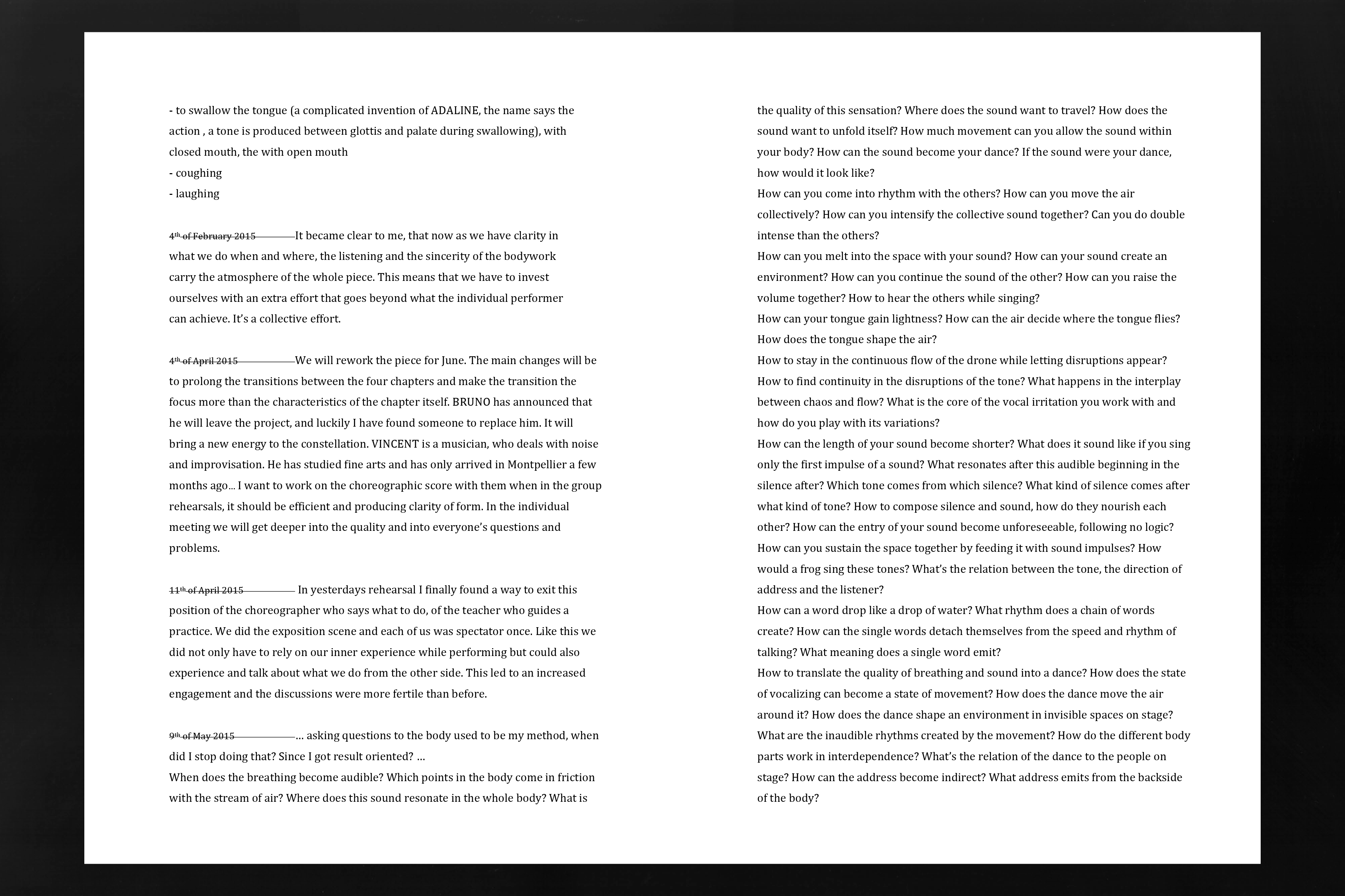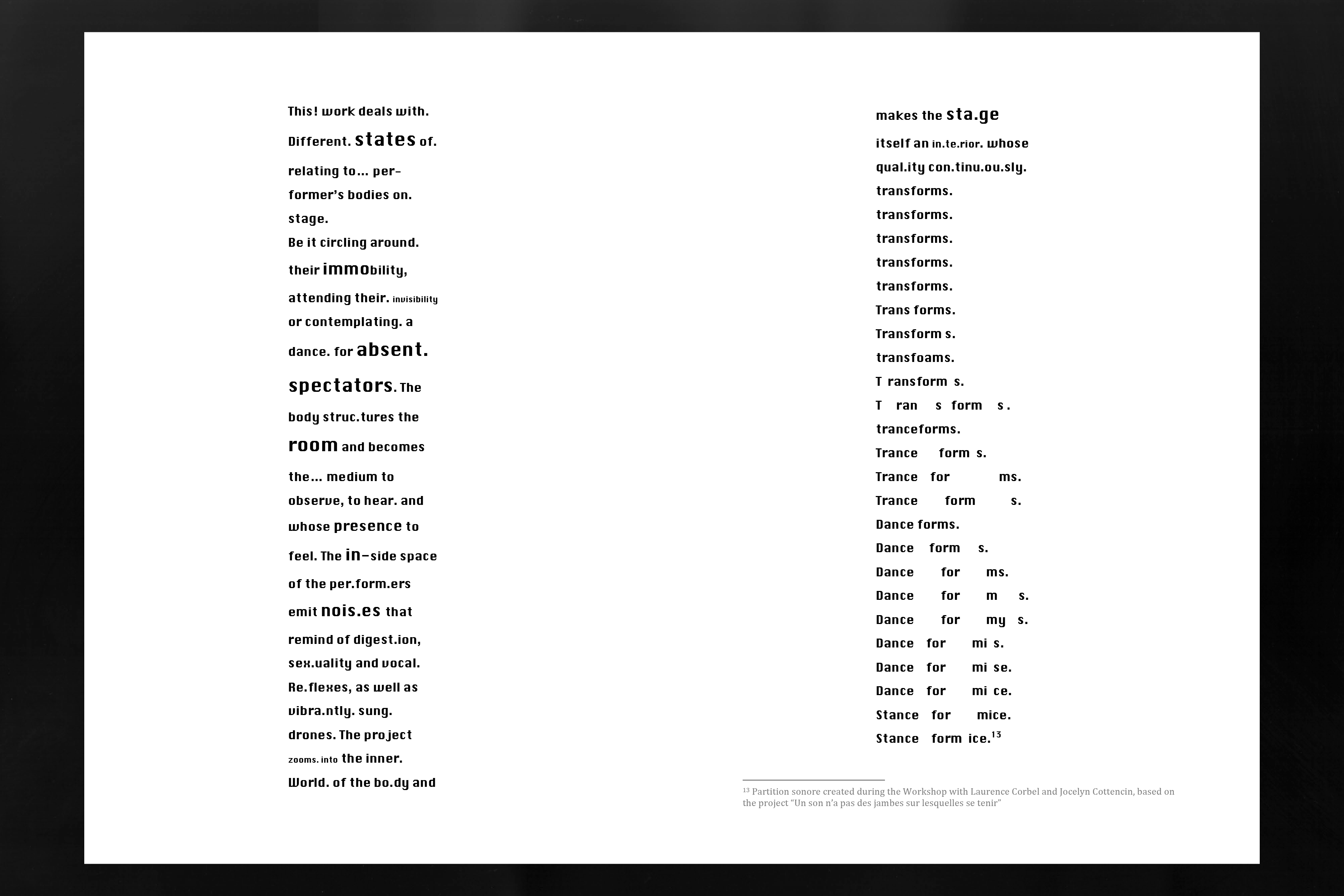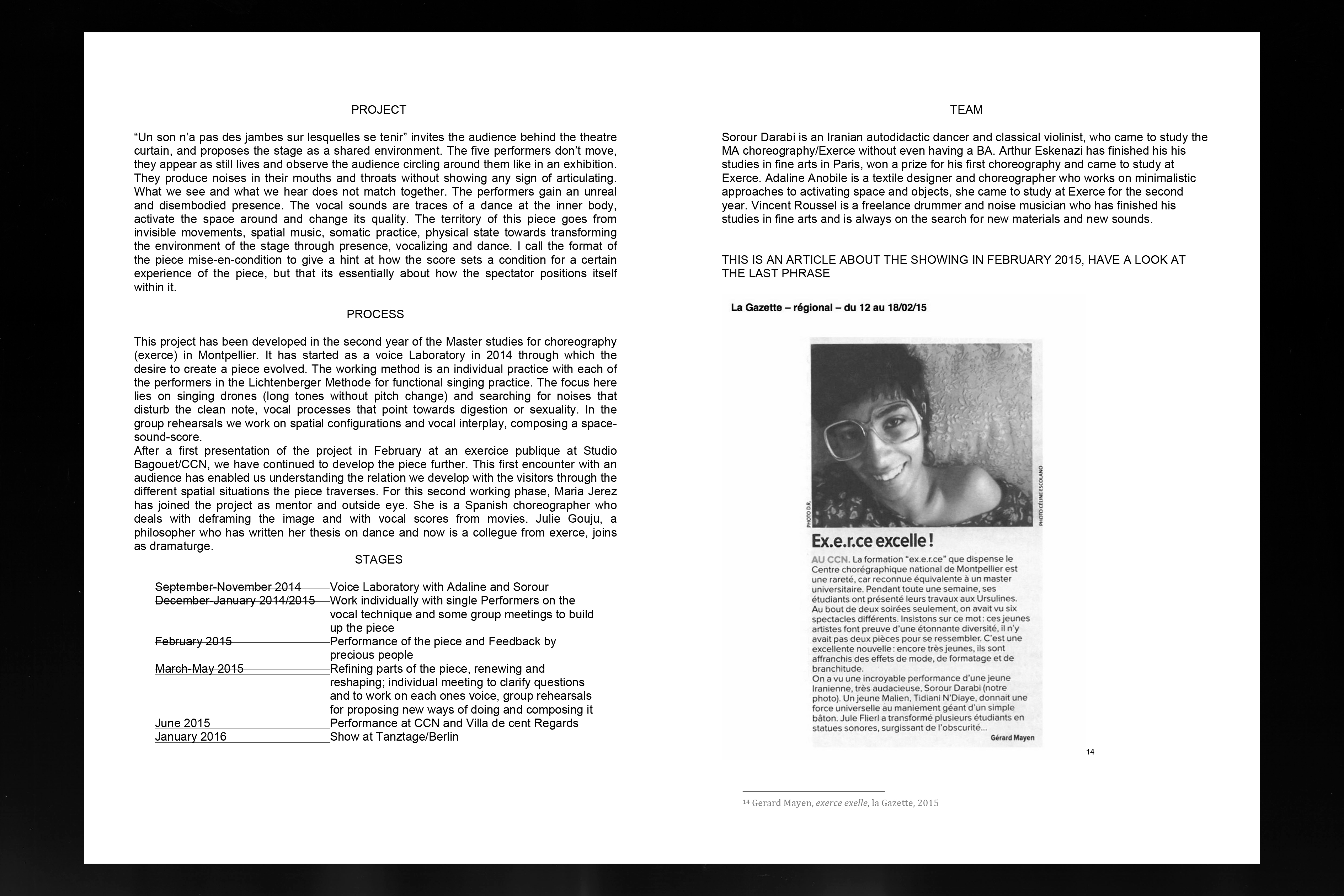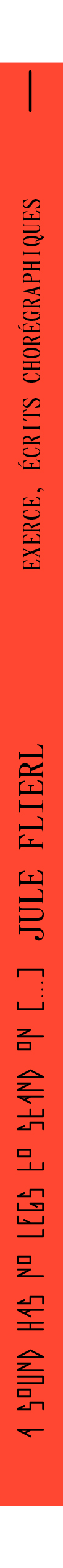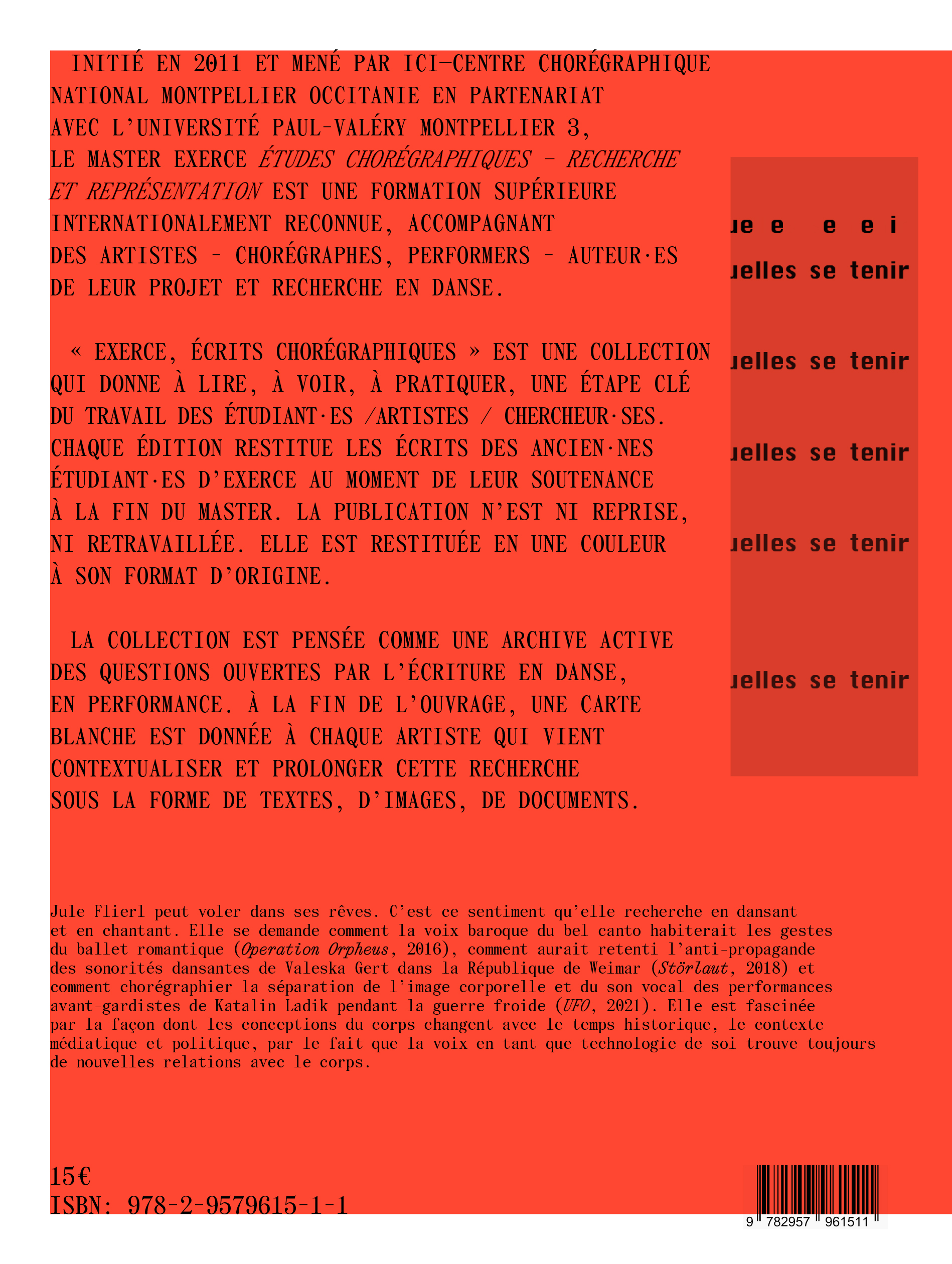 Cette édition restitue la recherche de la chorégraphe et performeuse berlinoise Jule Flierl pendant les deux années d'Exerce, master en chorégraphie et performance (Centre chorégraphique National de Montpellier / Occitanie et Université Paul Valéry). Le pari réussi de ce texte est de maintenir une oralité, une vocalité, au sein même de l'écriture textuelle. Celle-ci devient tour à tour description, analyse, partition, voix, musique, etc.