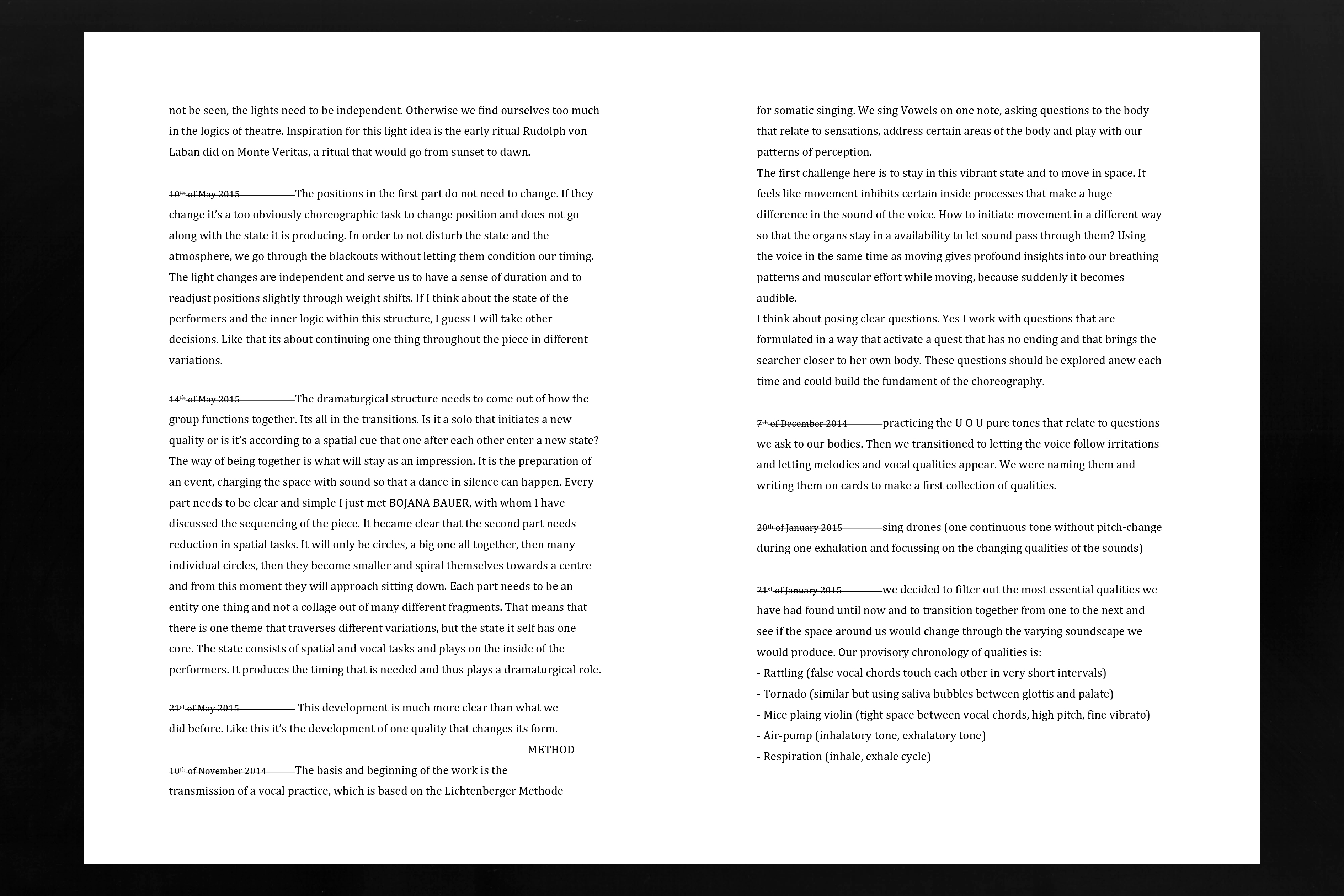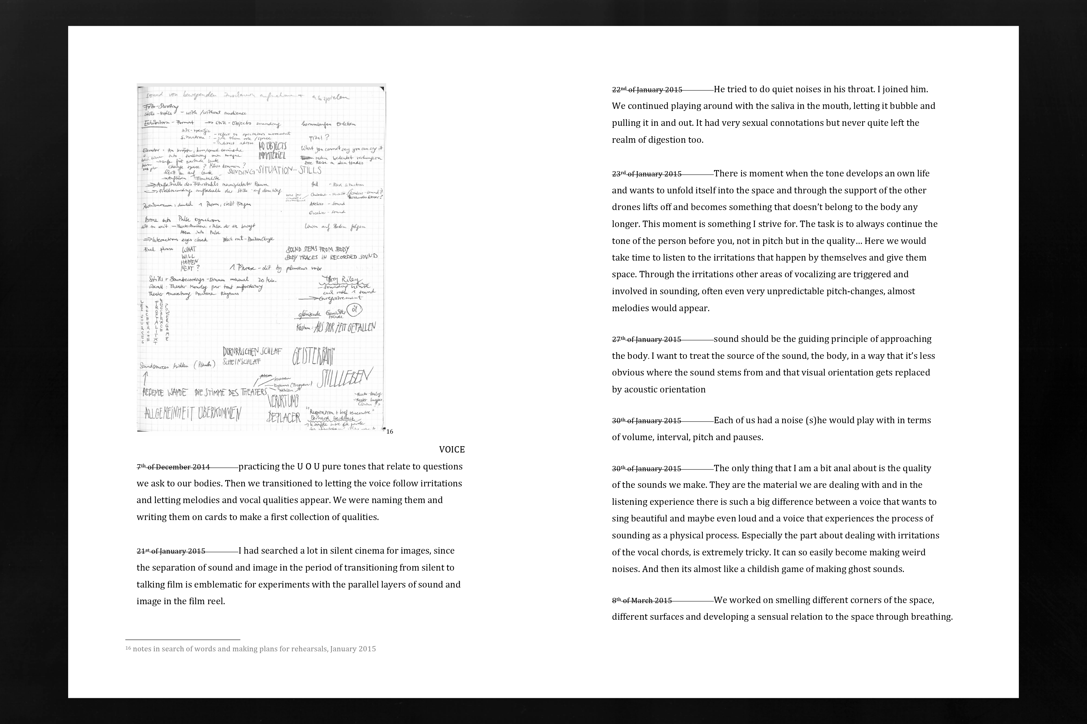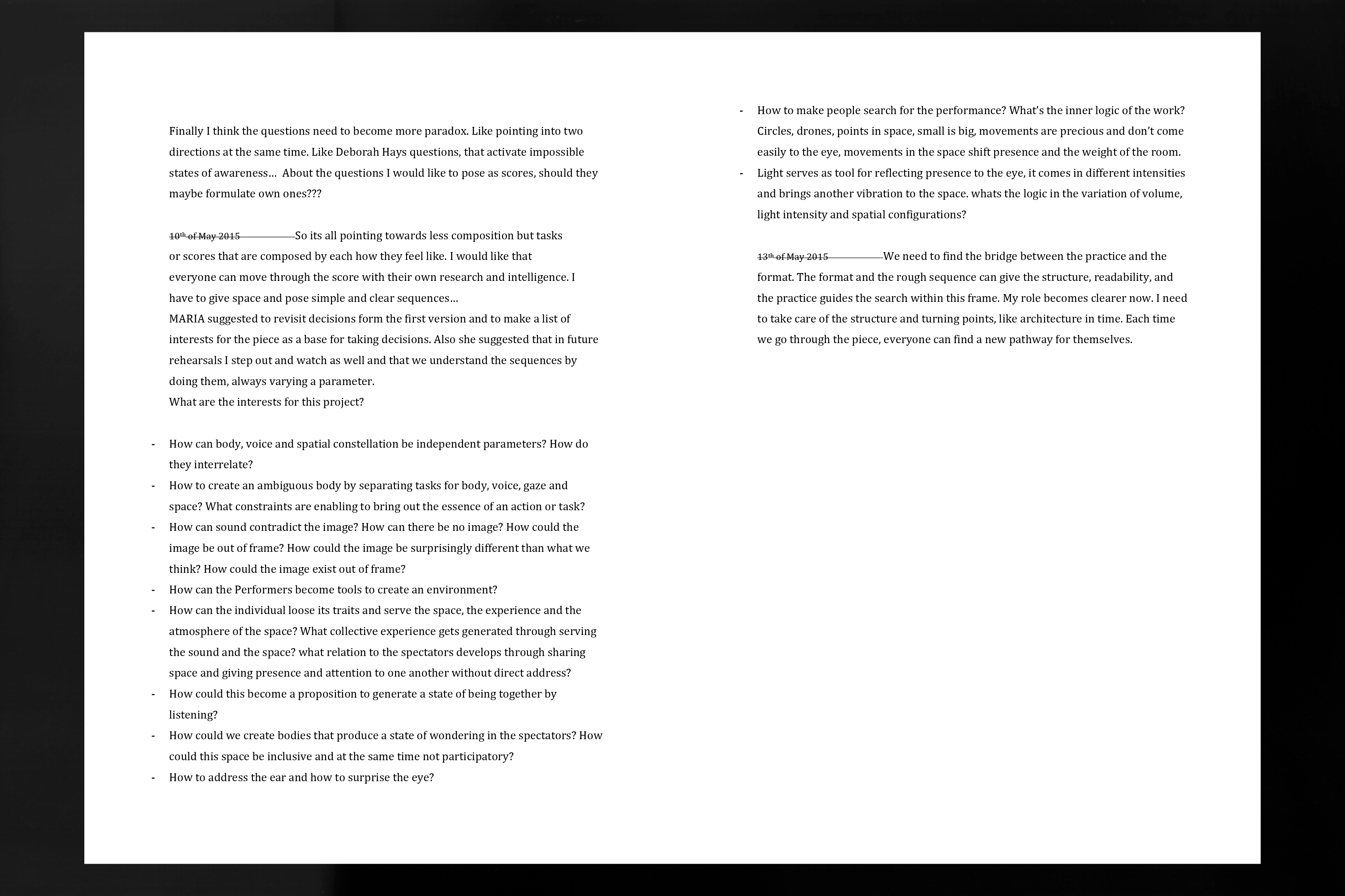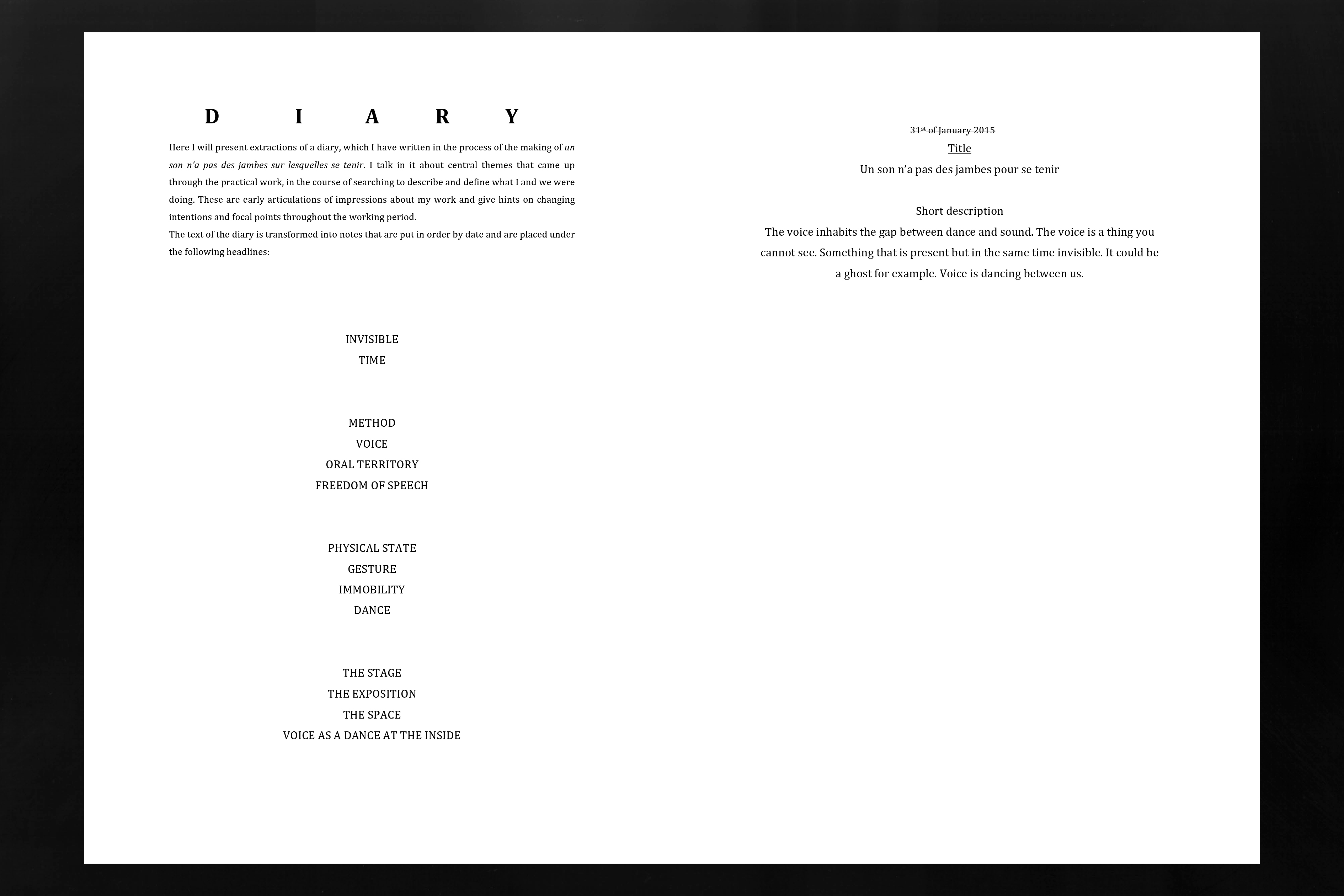 Après qu'il ait dit qu'un son n'avait pas de jambes sur lesquelles se tenir, je n'ai pas pu dormir. Je me suis retournée dans mon lit et j'ai imaginé une pièce. Elle serait performée par des sons avec des jambes. Je voulais un son qui se tienne debout dans la pièce. Quand je me suis réveillée le lendemain matin, j'ai fait une promenade. Je marchais sur mes jambes. Je n'étais pas un son. Mais je fredonnais et chantais, je pouvais produire des sons. Je suis restée immobile, j'ai regardé la rivière et j'ai chanté des sons. Je voulais me dissoudre et quitter mon corps pour le son. Devenir un son à deux jambes. »