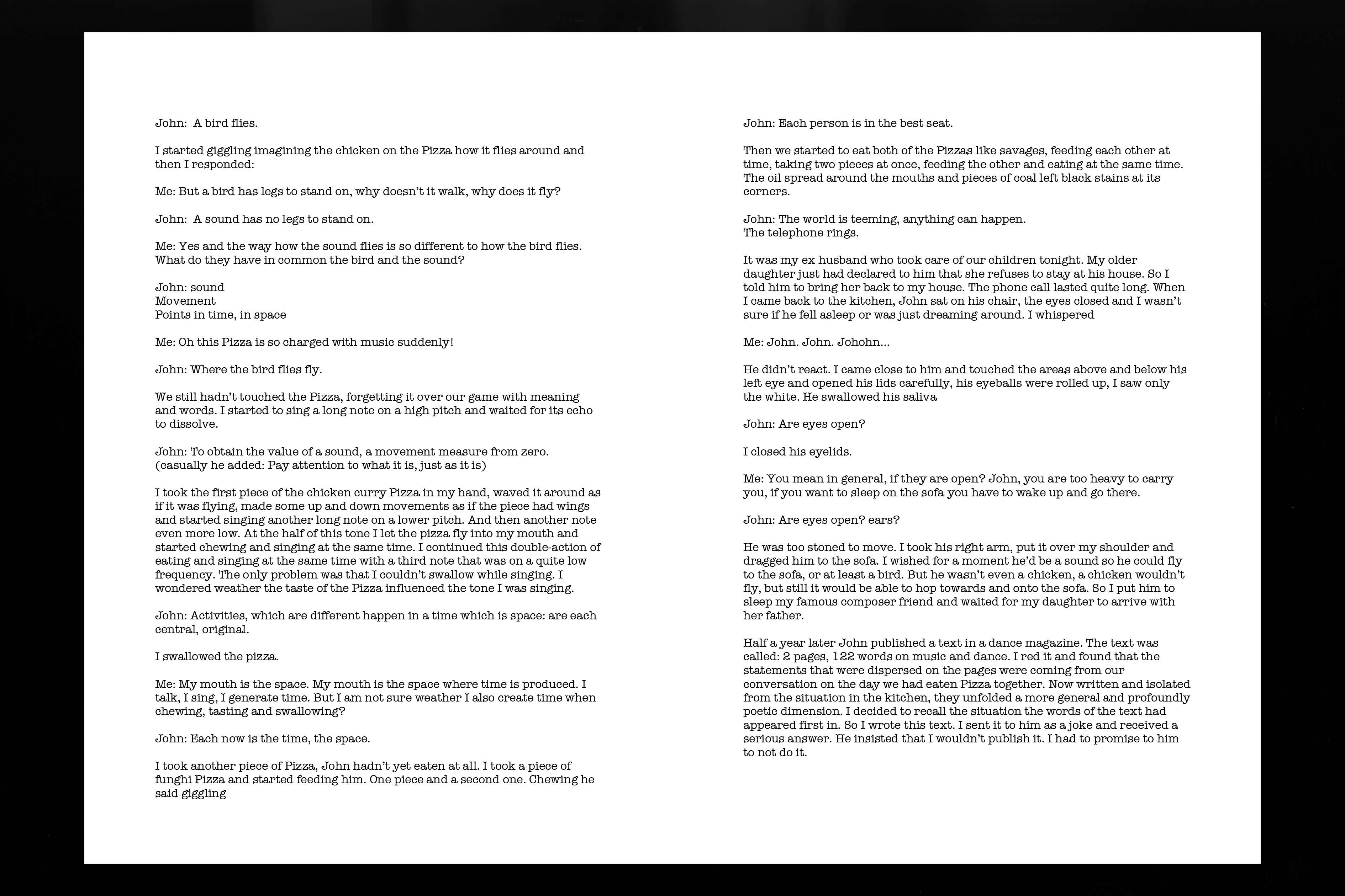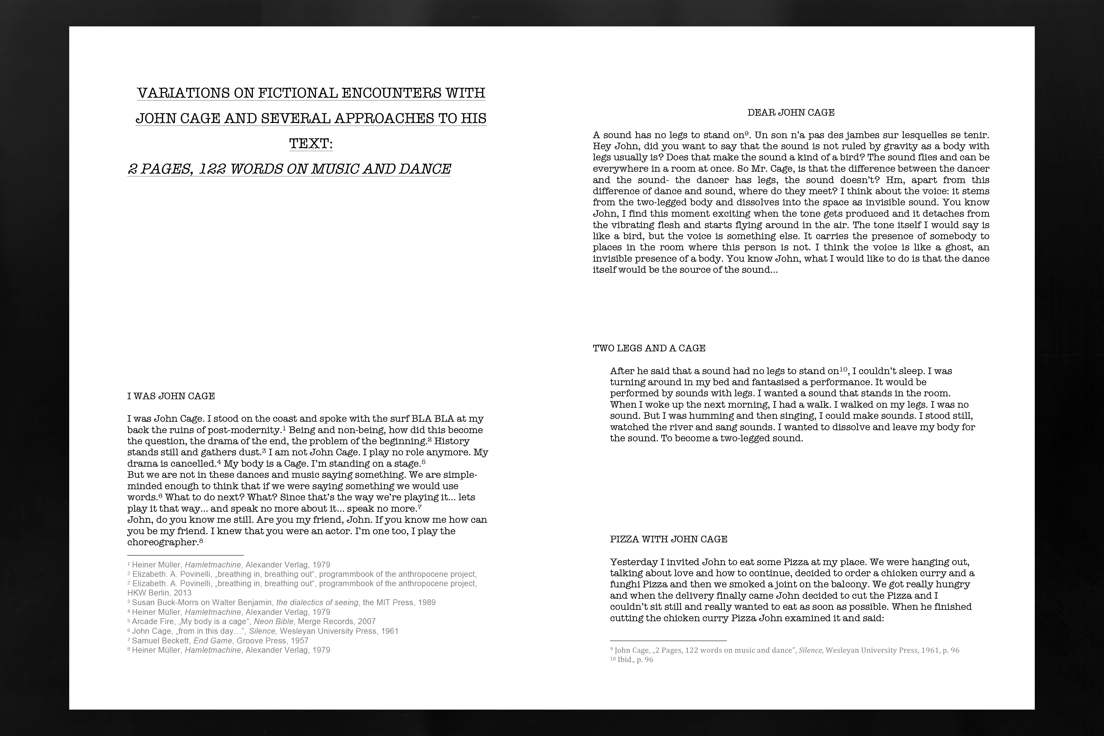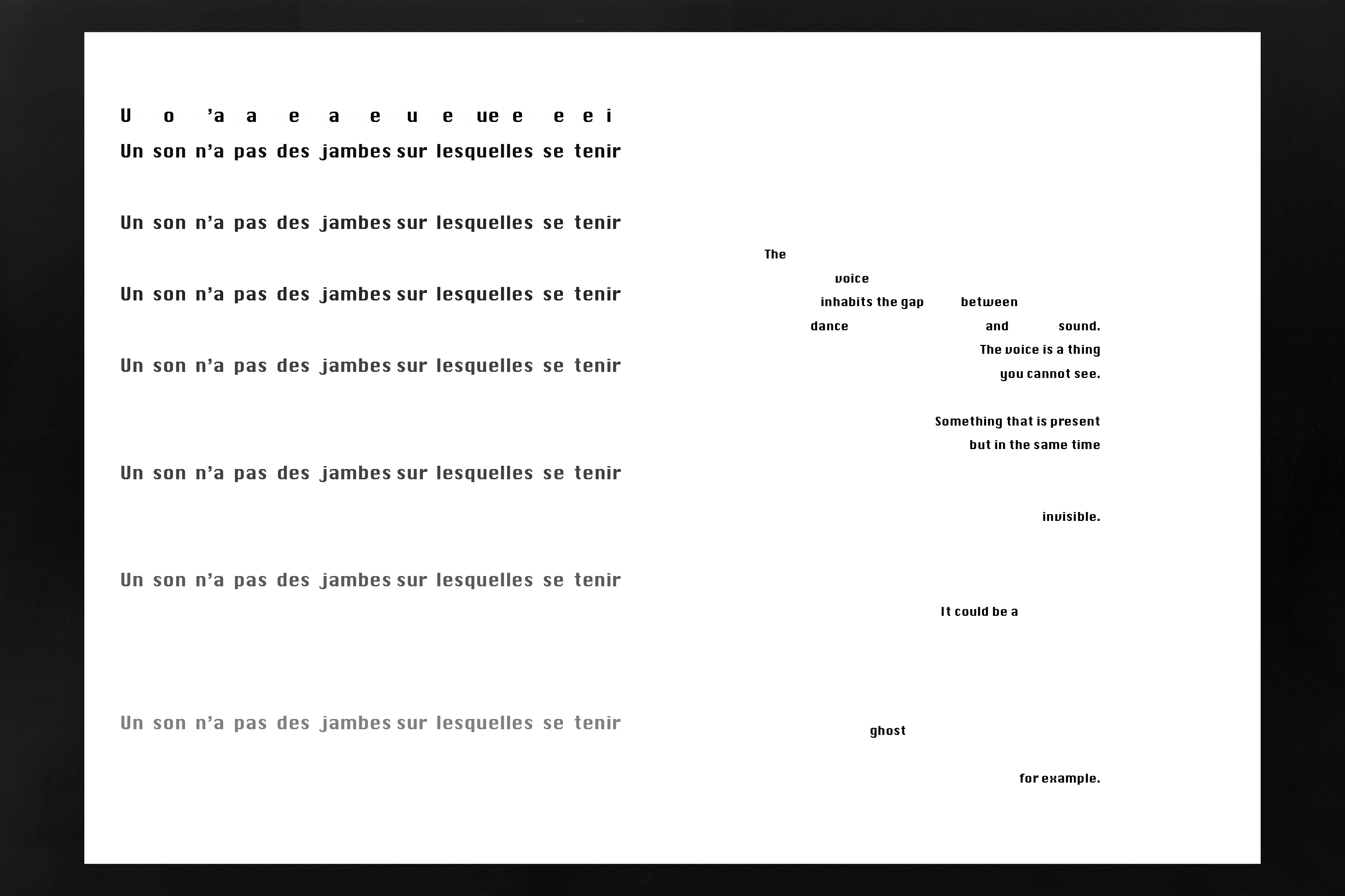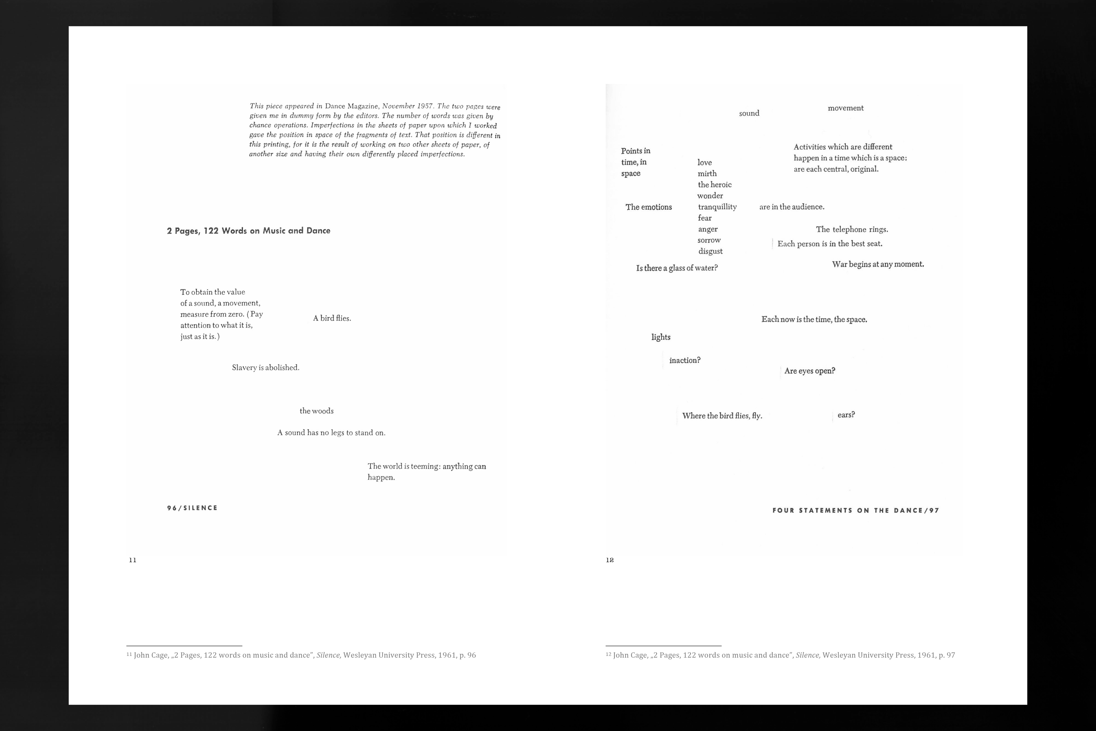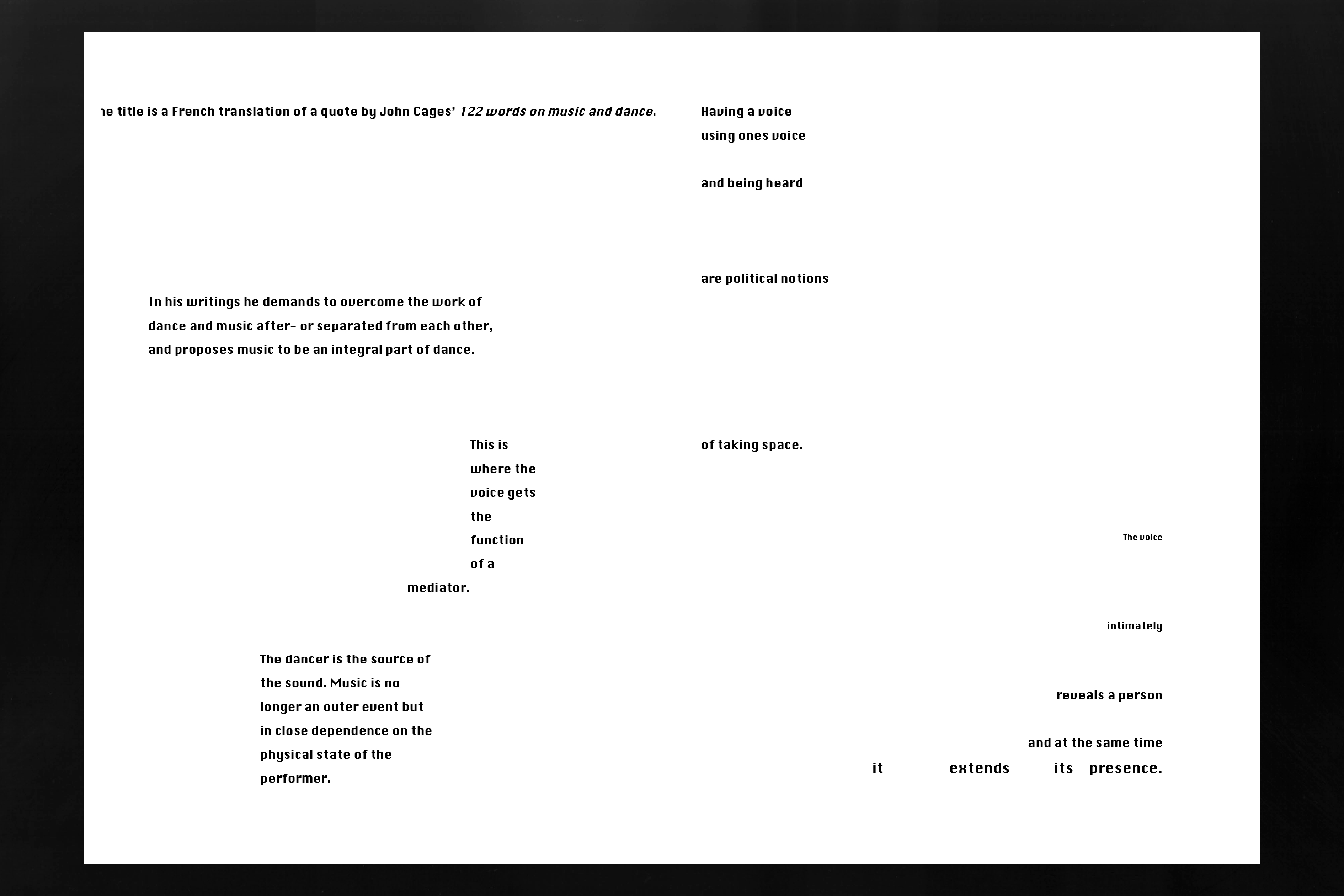 A sound has no legs to stand on Un son n'a pas des jambes sur lesquelles se tenir. Hé John, voulais-tu dire que le son n'est pas soumis à la gravité comme l'est habituellement un corps avec des jambes ? Est-ce que cela fait du son une sorte d'oiseau ? Le son vole et peut être partout dans une pièce à la fois. Alors M. Cage, est-ce la différence entre le danseur et le son - le danseur a des jambes, le son n'en a pas ? Hm, en dehors de cette différence de la danse et du son, où se rencontrent-ils ? Je pense à la voix : elle vient du corps à deux jambes et se dissout dans l'espace comme un son invisible. Tu sais John, je trouve ce moment exaltant quand la tonalité est produite et qu'elle se détache de la chair vibrante et commence à voler dans l'air. Le son lui-même, je dirais, est comme un oiseau, mais la voix est autre chose. Elle transporte la présence de quelqu'un dans des endroits de la pièce où cette personne n'est pas. Je pense que la voix est comme un fantôme, une présence invisible d'un corps. Tu sais John, ce que j'aimerais faire, c'est que la danse elle-même soit la source du son.
