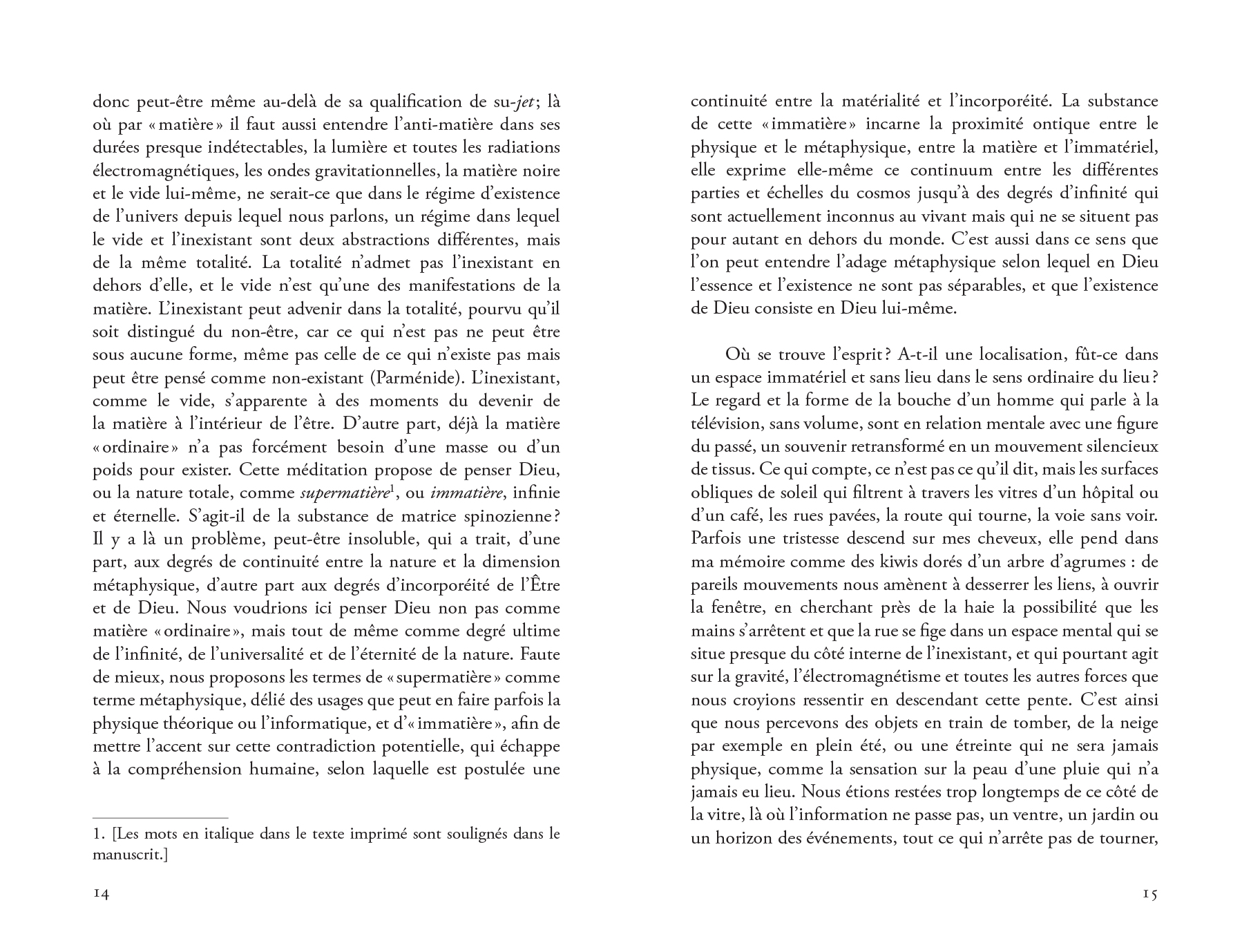 Alessandro De Francesco), dont la prose, oscillant entre poésie, philosophie et art conceptuel, interroge l'infinité du cosmos et de l'être. Un flux de conscience et de pensée qui se transforme en prose poétique et en réflexion philosophique, sans solution de continuité entre les deux. Une auteure évanescente, immergée dans le contemporain avec des outils conceptuels et un style d'écriture qui rappellent les traités de métaphysique du XXVIIe siècle.