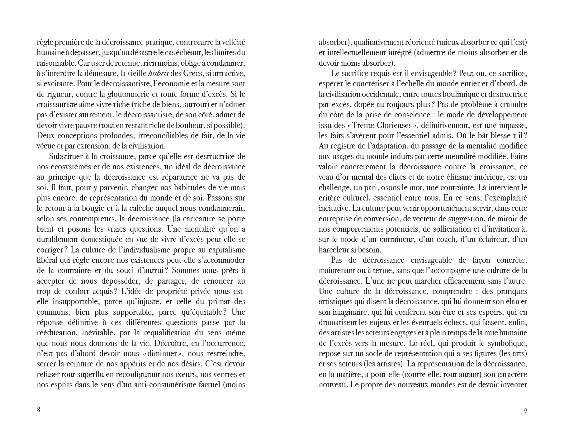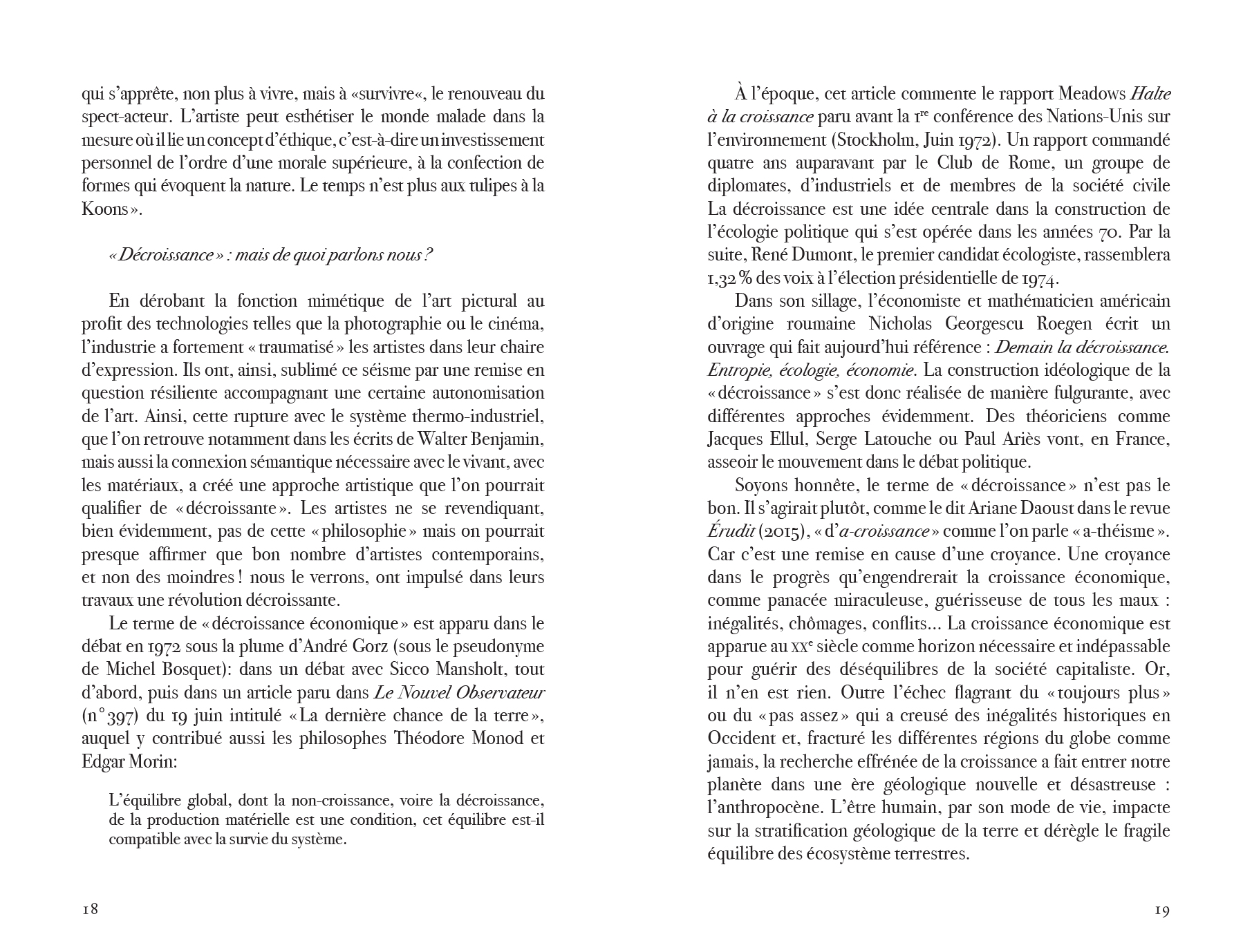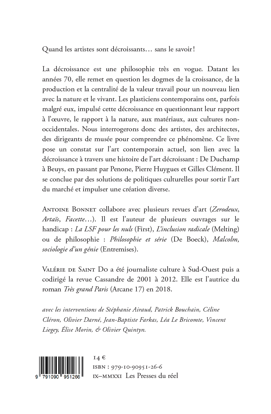 La décroissance est une philosophie très en vogue. Datant les années 70, elle remet en question les dogmes de la croissance, de la production et la centralité de la valeur travail pour un nouveau lien avec la nature et le vivant. Les plasticiens contemporains ont, parfois malgré eux, impulsé cette décroissance en questionnant leur rapport à l'œuvre, le rapport à la nature, aux matériaux, aux cultures non-occidentales. Nous interrogerons donc des artistes, des architectes, des dirigeants de musée pour comprendre ce phénomène. Ce livre pose un constat sur l'art contemporain actuel, son lien avec la décroissance à travers une histoire de l'art décroissant : de Duchamp à Beuys, en passant par Penone, Pierre Huyghe et Gilles Clément. Il se conclue par des solutions de politiques culturelles pour sortir l'art du marché et impulser une création diverse.