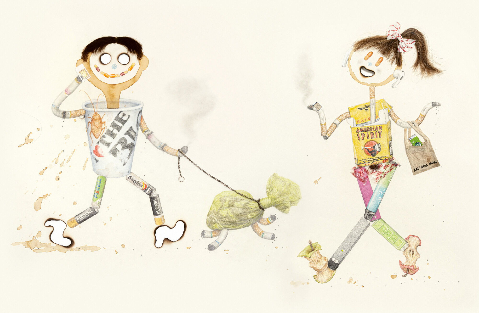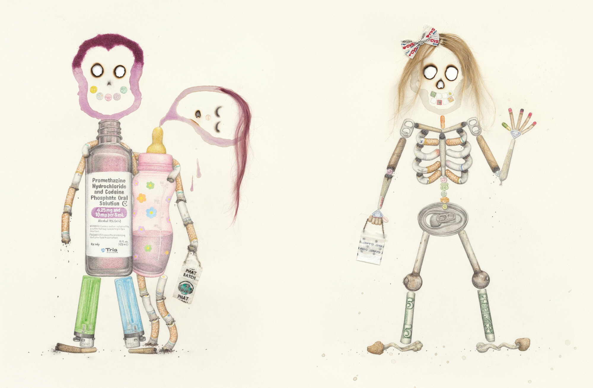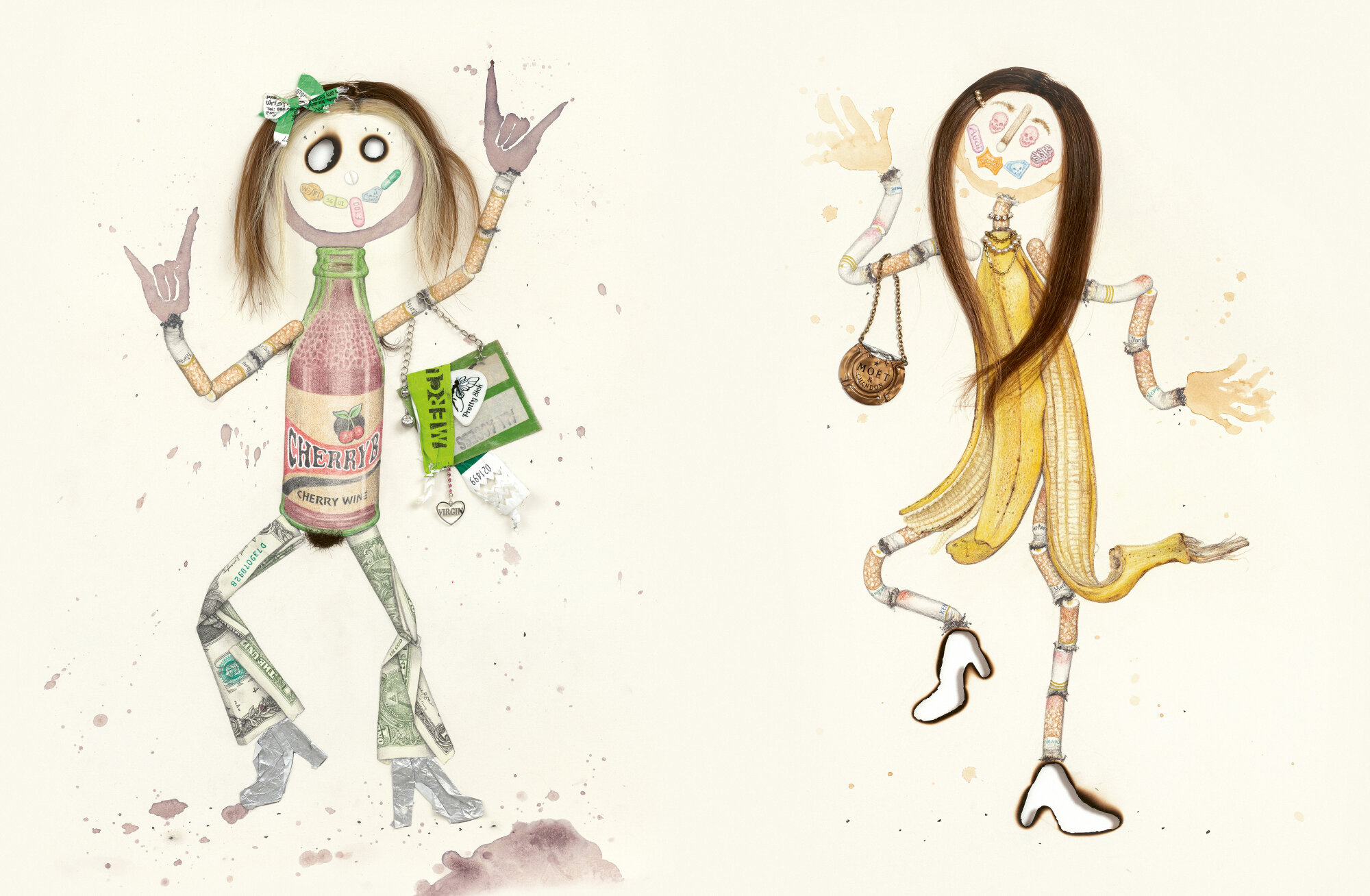 Les dessins-collages d'Aurel Schmidt de la série des « poupées », incorporant objets trouvés et détritus divers, mouches, préservatifs, mégots, fluides corporels, etc., reflets de la vie new-yorkaise de l'artiste, constituant une sorte de memento mori contemporain.