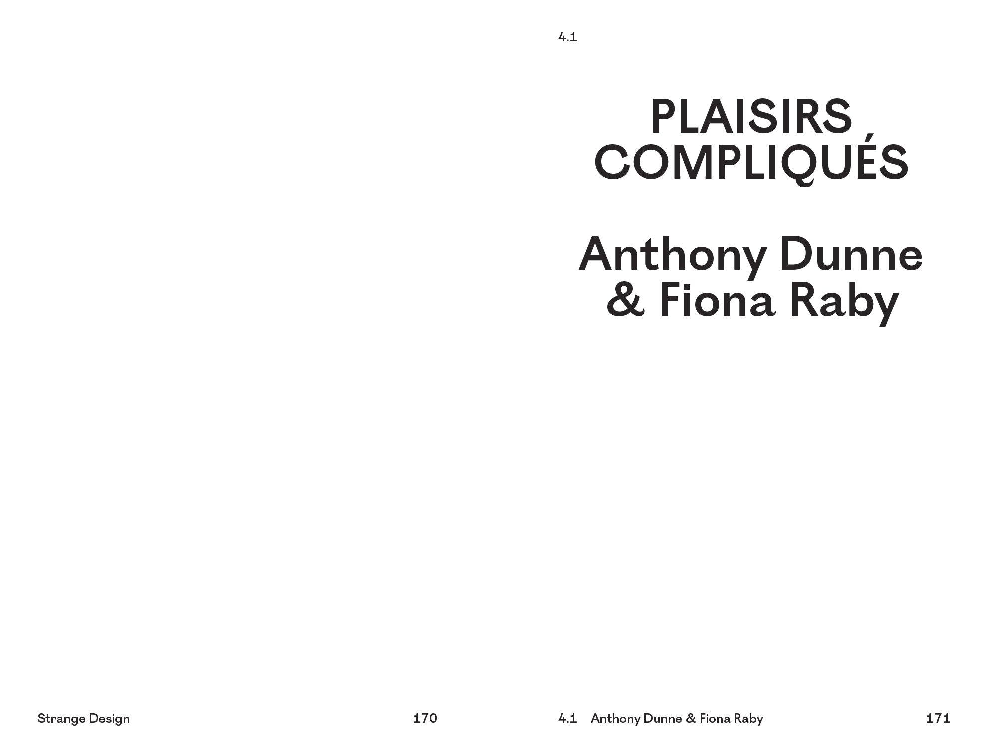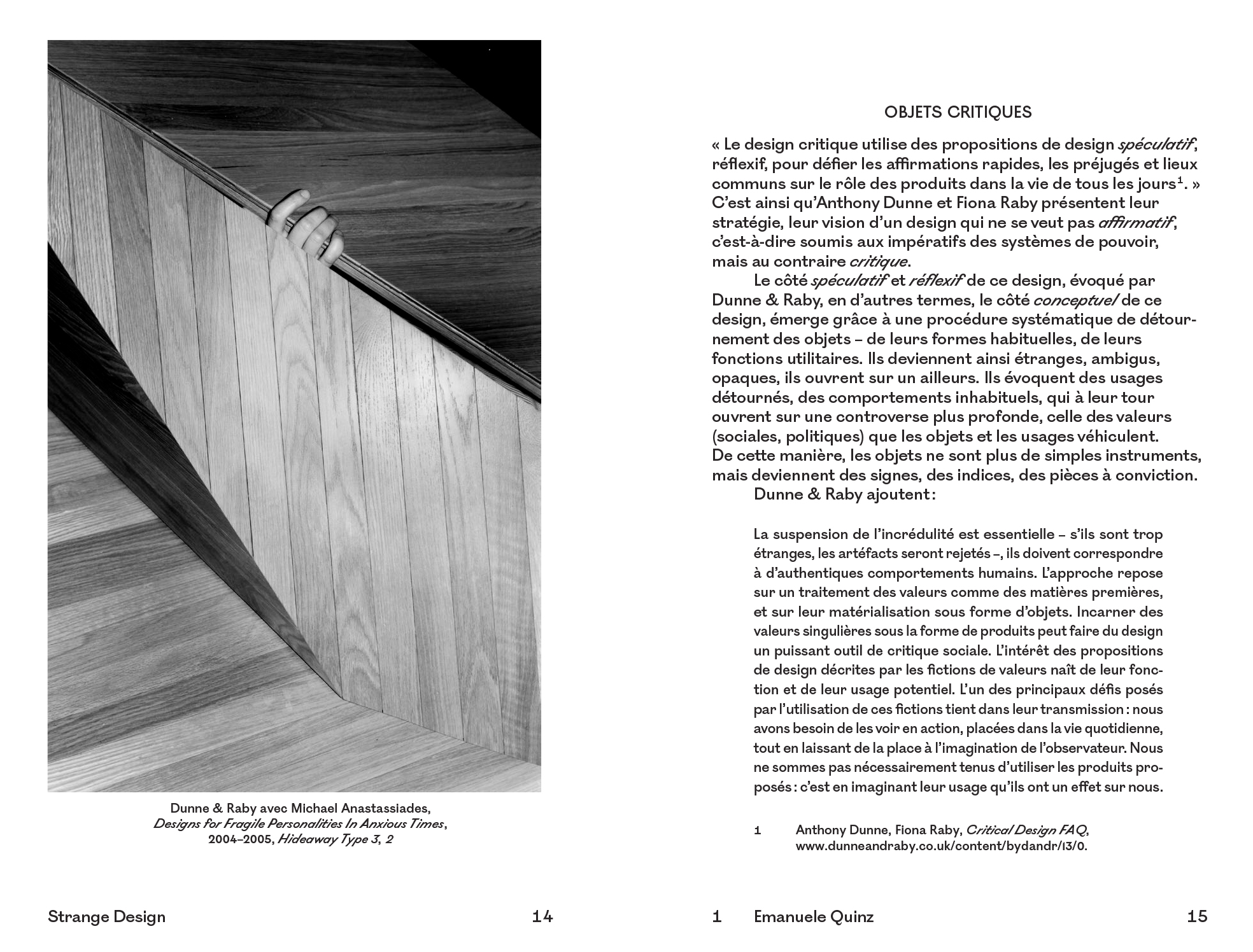 Depuis quelques années, des objets étranges ont fait leur apparition dans le monde du design, des objets dysfonctionnels, énigmatiques, compliqués, qui mettent en crise les catégories du projet, des objets, de la fonction au profit des processus, des explorations, des déviations. Ces objets relèvent d'une posture que les designers anglais Anthony Dunne et Fiona Raby ont défini Critical Design (design critique) : un design spéculatif, réflexif, qui ne veut pas proposer des solutions, mais plutôt poser des questions, qui veut défier les affirmations rapides, les préjugés et lieux communs sur le rôle des produits dans la vie de tous les jours. Un design qui ne se veut pas affirmatif, c'est-à-dire soumis aux impératifs des systèmes de pouvoir, mais au contraire critique.