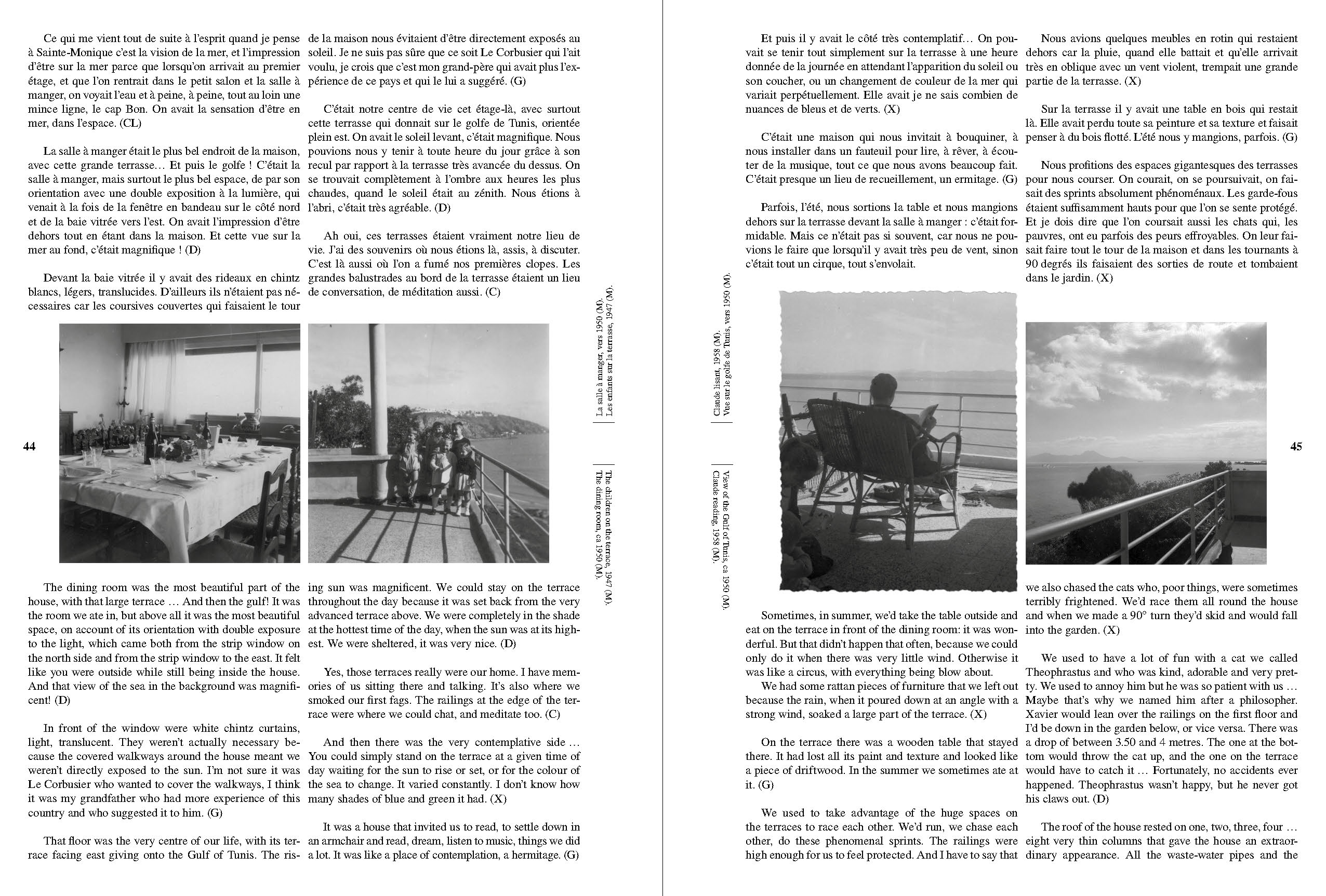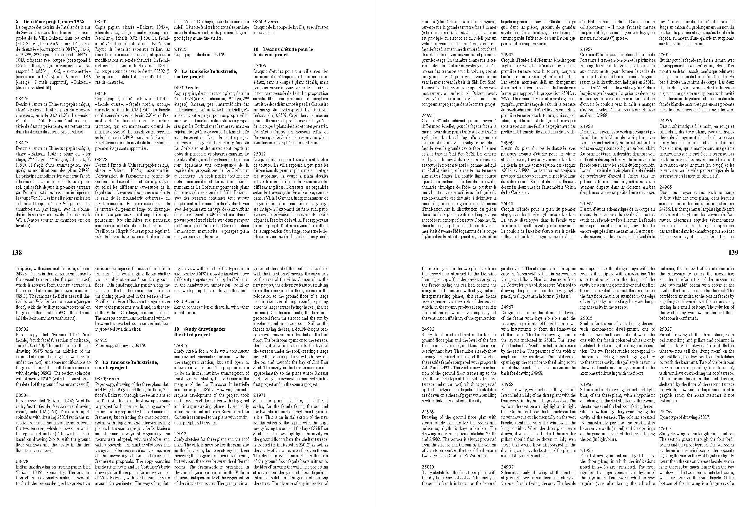 l'histoire de la villa et permet d'en comprendre pleinement les raisons et les significations, la genèse, l'importance théorique, le rôle du commanditaire et les joies familiales procurées par ses espaces, dans le but également de rassembler les connaissances nécessaires à sa restauration en tant qu'architecture fondamentale du XXe siècle. La deuxième est ouverte à certains des plus grands protagonistes de l'architecture d'aujourd'hui et s'inscrit dans la stratégie culturelle de Le Corbusier, qui a toujours été capable de reconsidérer ses œuvres à la lumière des phénomènes contemporains, même à travers des manipulations graphiques, des inversions de plans et des renversements de photographies, afin d'en découvrir les potentialités inattendues. Grâce à ces deux axes, histoire et projet d'architecture dialoguent en hommage à la vision théorique de Le Corbusier.