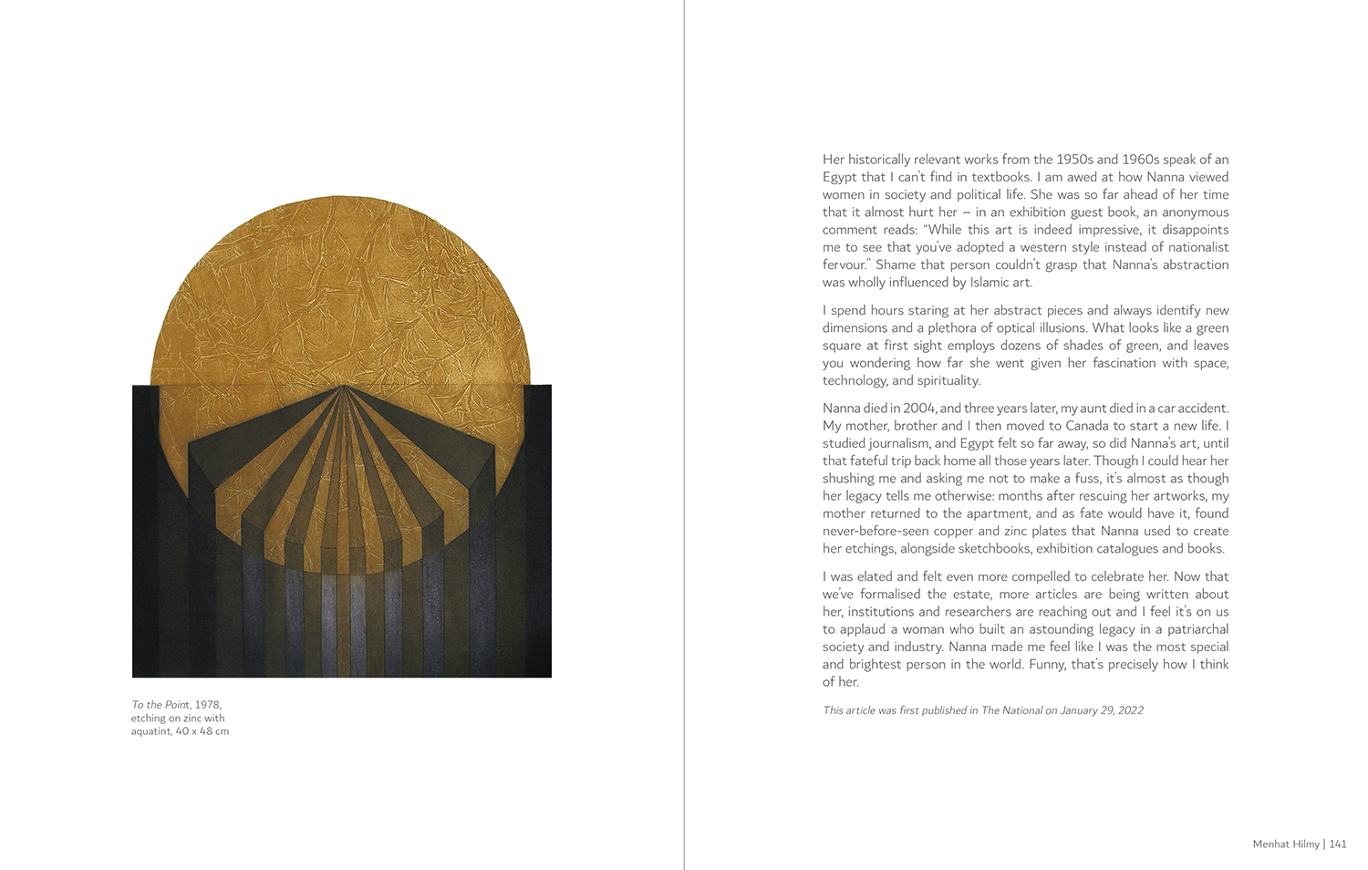 Alcove: Intimate Essays on Arab Modernist Artists is a compilation of articles narrated by the relatives, friends, or students of modernists from the Arab world and authored by Dubai-based writer Myrna Ayad. Some essays have been featured in Remembering the Artist, a monthly series for The National, the UAE's leading English daily. At once an intimate portrayal and recollection, the articles celebrate the lives, careers, and personas of some of the region's pioneering artists, including Shafic Abboud, Hamed Abdallah, Etel Adnan, Layla Al Attar, Nahil Bishara, Huguette Caland, Saloua Raouda Choucair, Ali Omar Ermes, Abdel Hadi El Gazzar, Paul Guiragossian, Mohammed Ghani Hikmat, Nabila Hilmi, Menhat Hilmy, Jumana El Husseini, Louay Kayyali, Helen Khal, Baya Mahieddine, Mohamed Melehi, Fateh Moudarres, Nuha Al Radi, Aref El Rayess, Mona Saudi, Juliana Seraphim, Abdullah Al Shaikh, Asim Abu Shakra, Hassan Sharif, Hussein Shariffe, Laila Shawa, Hedi Terki and Madiha Umar, as told by those nearest and dearest to them.