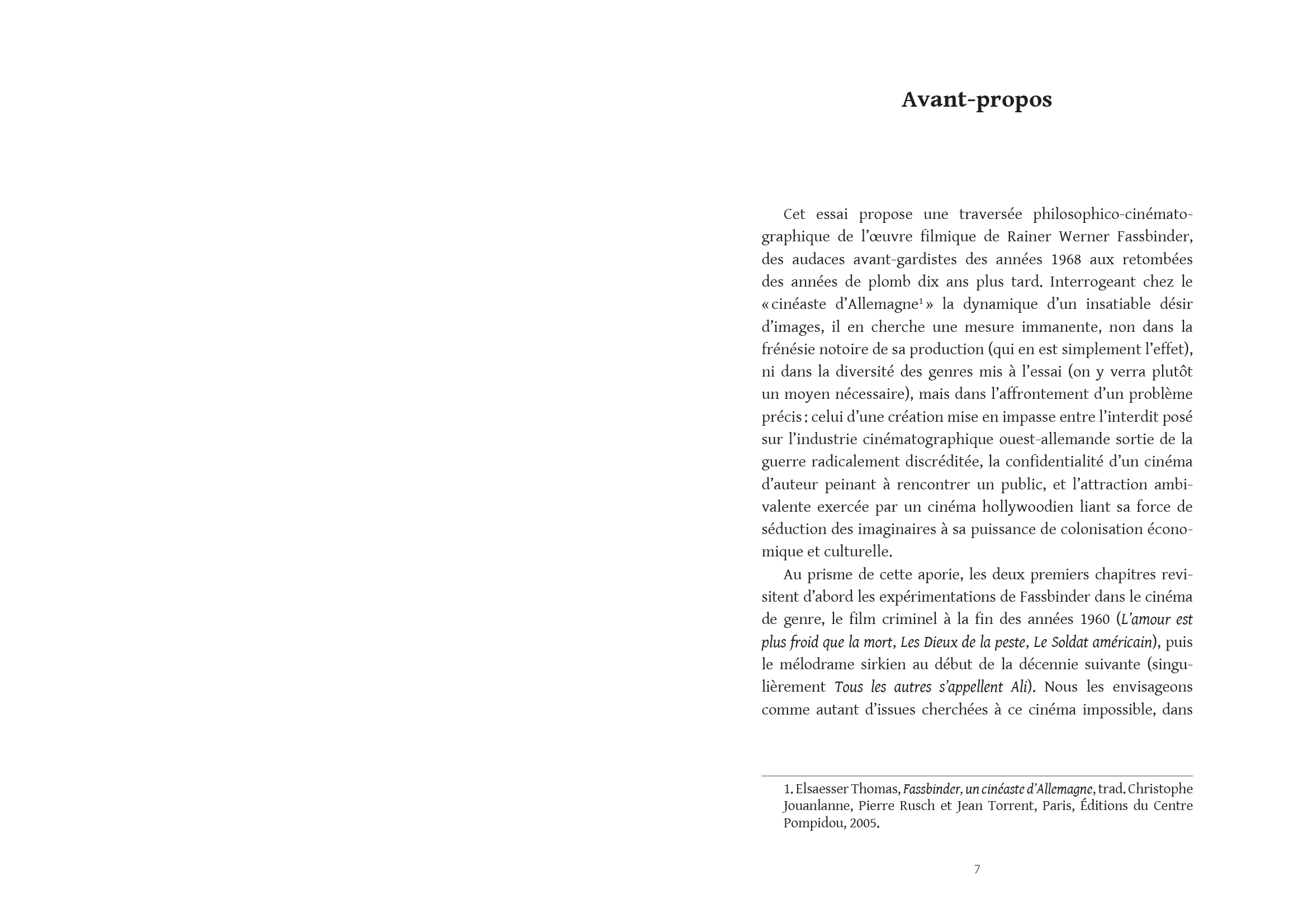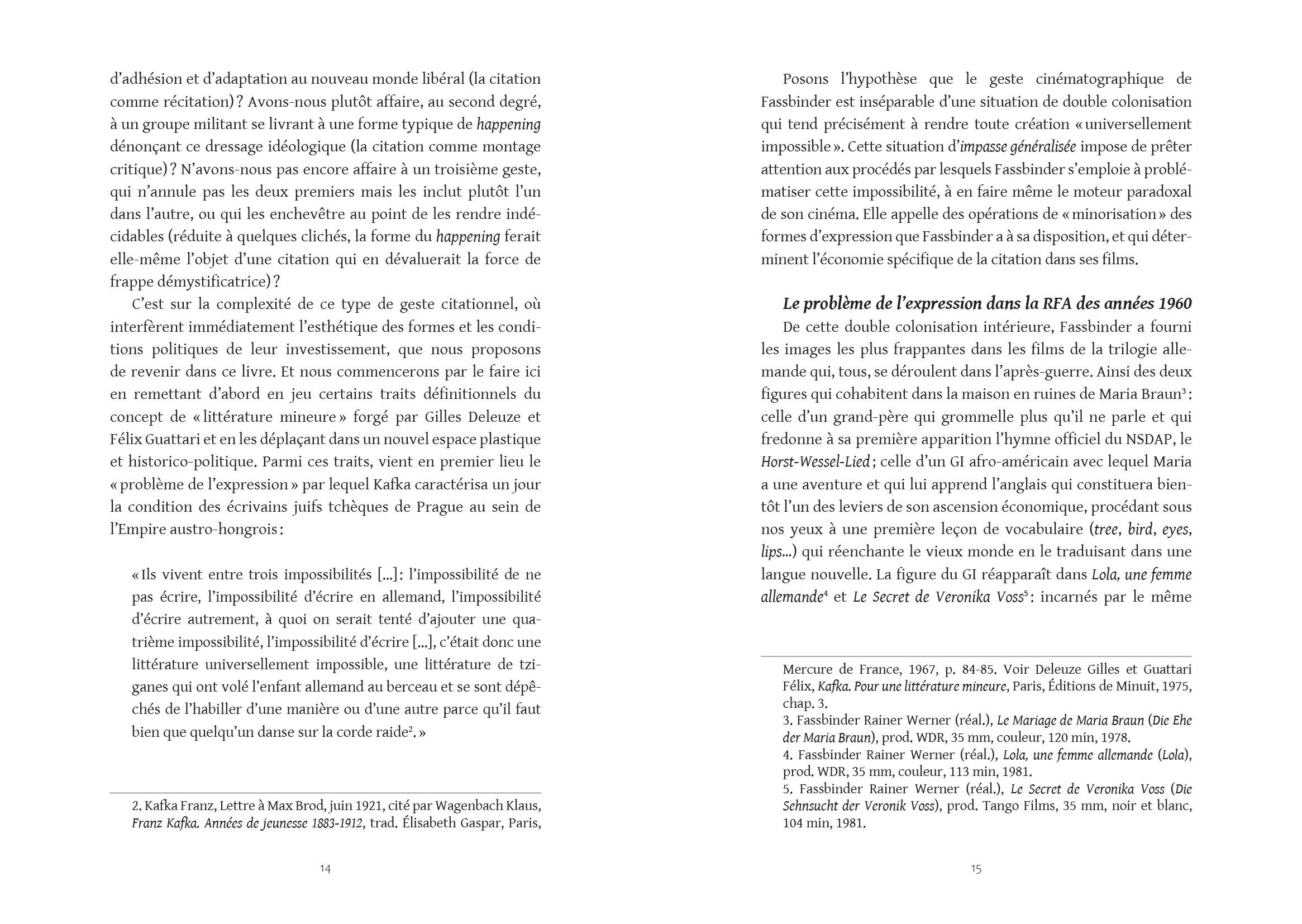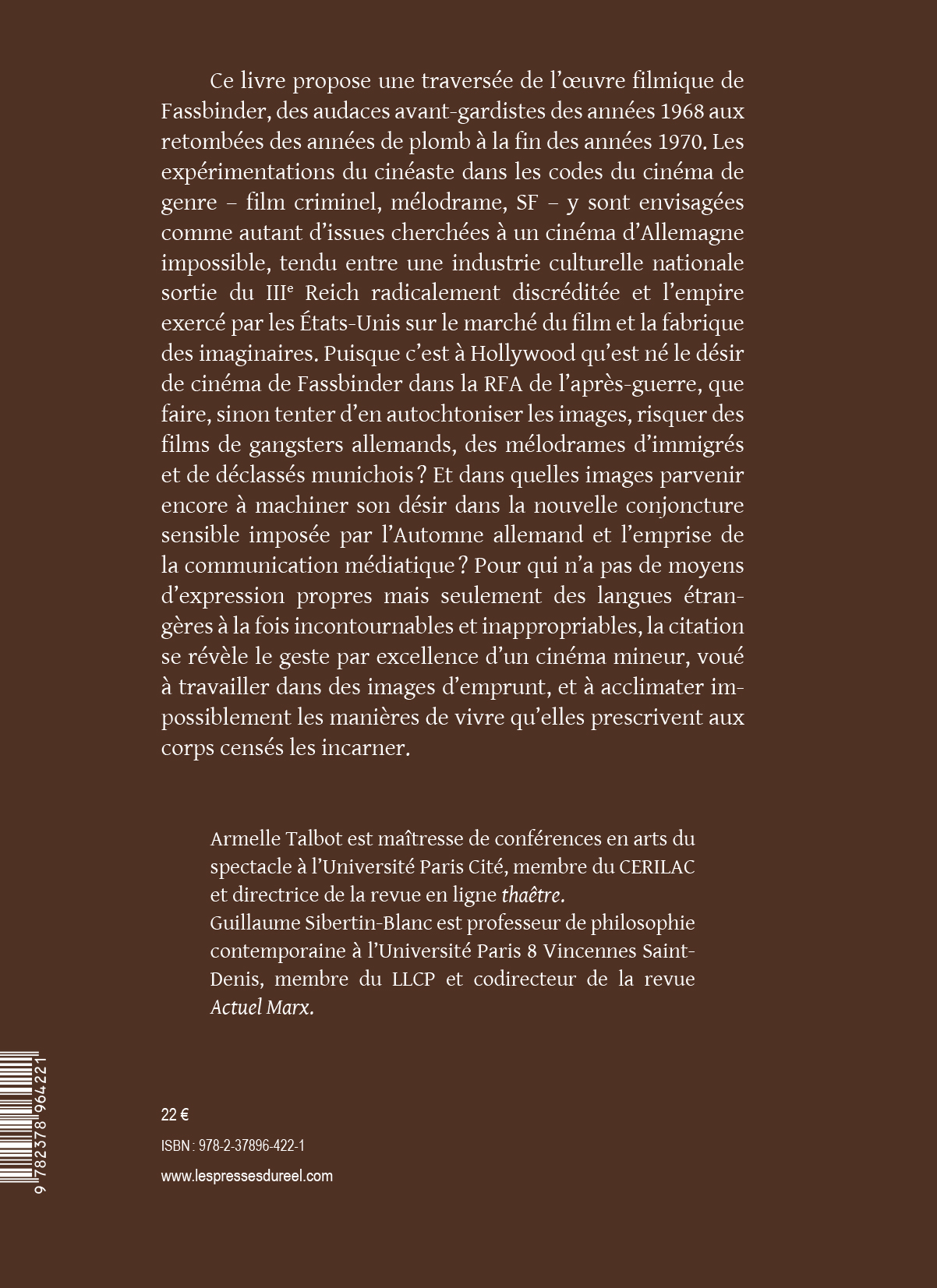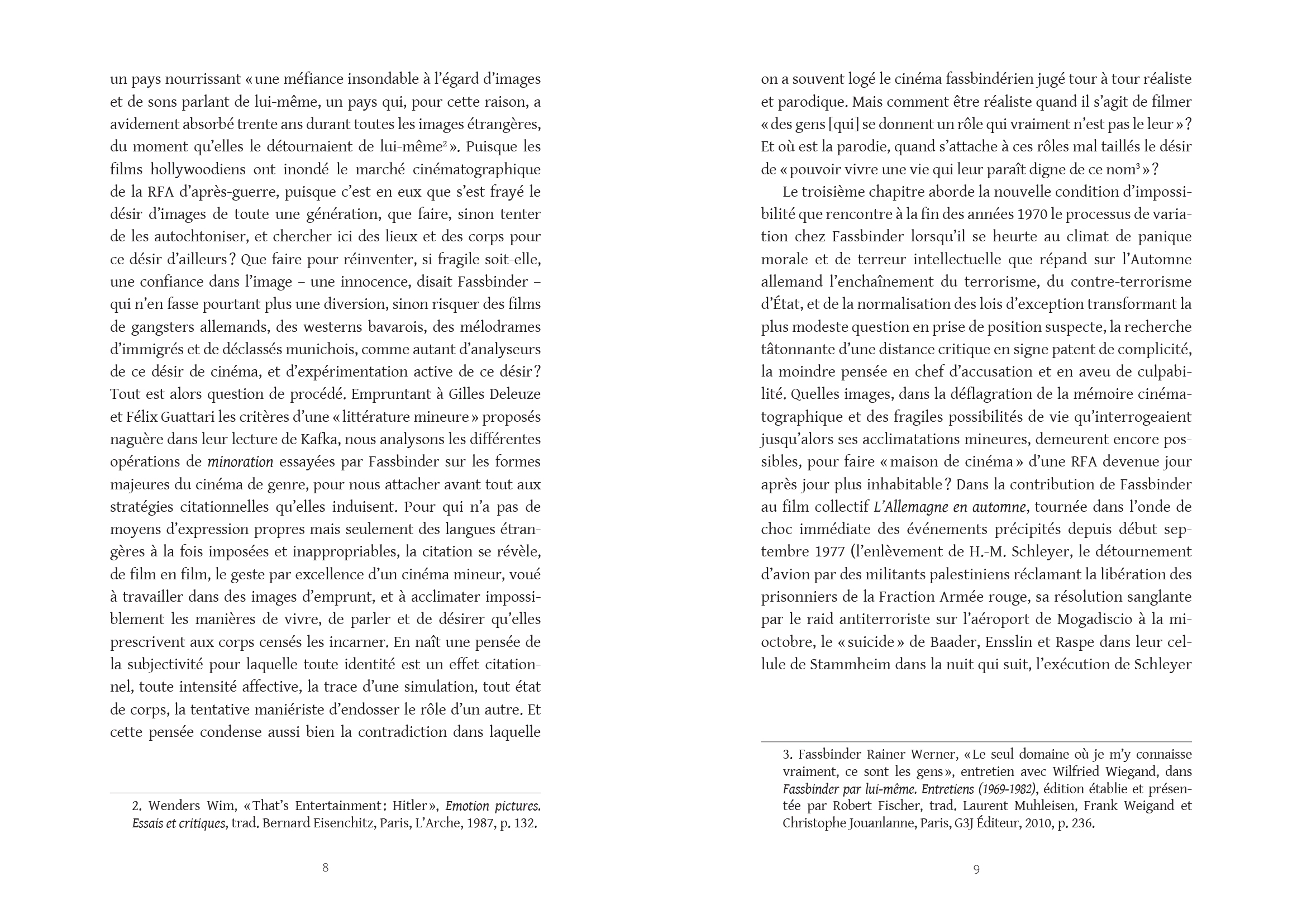 Les expérimentations du cinéaste dans les codes du cinéma de genre – film criminel, mélodrame, SF – y sont envisagées comme autant d'issues cherchées à un cinéma d'Allemagne impossible, tendu entre une industrie culturelle nationale sortie du IIIe Reich radicalement discréditée et l'empire exercé par les États-Unis sur le marché du film et la fabrique des imaginaires. Puisque c'est à Hollywood qu'est né le désir de cinéma de Fassbinder dans la RFA de l'après-guerre, que faire, sinon tenter d'en autochtoniser les images, risquer des films de gangsters allemands, des mélodrames d'immigrés et de déclassés munichois ? Et dans quelles images parvenir encore à machiner son désir dans la nouvelle conjoncture sensible imposée par l'Automne allemand et l'emprise de la communication médiatique ? Pour qui n'a pas de moyens d'expression propres mais seulement des langues étrangères à la fois incontournables et inappropriables, la citation se révèle le geste par excellence d'un cinéma mineur, voué à travailler dans des images d'emprunt, et à acclimater impossiblement les manières de vivre qu'elles prescrivent aux corps censés les incarner.