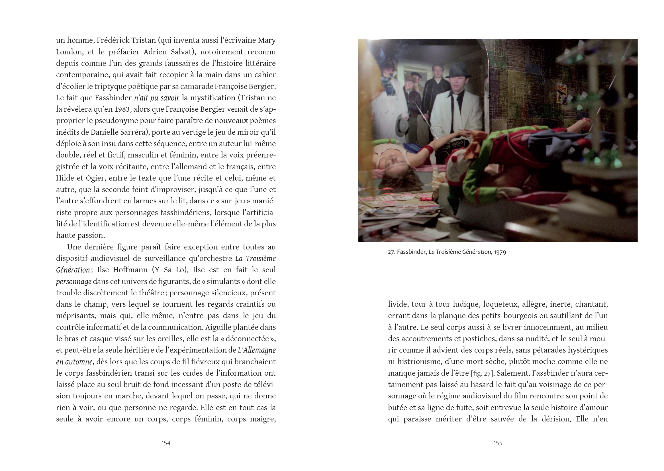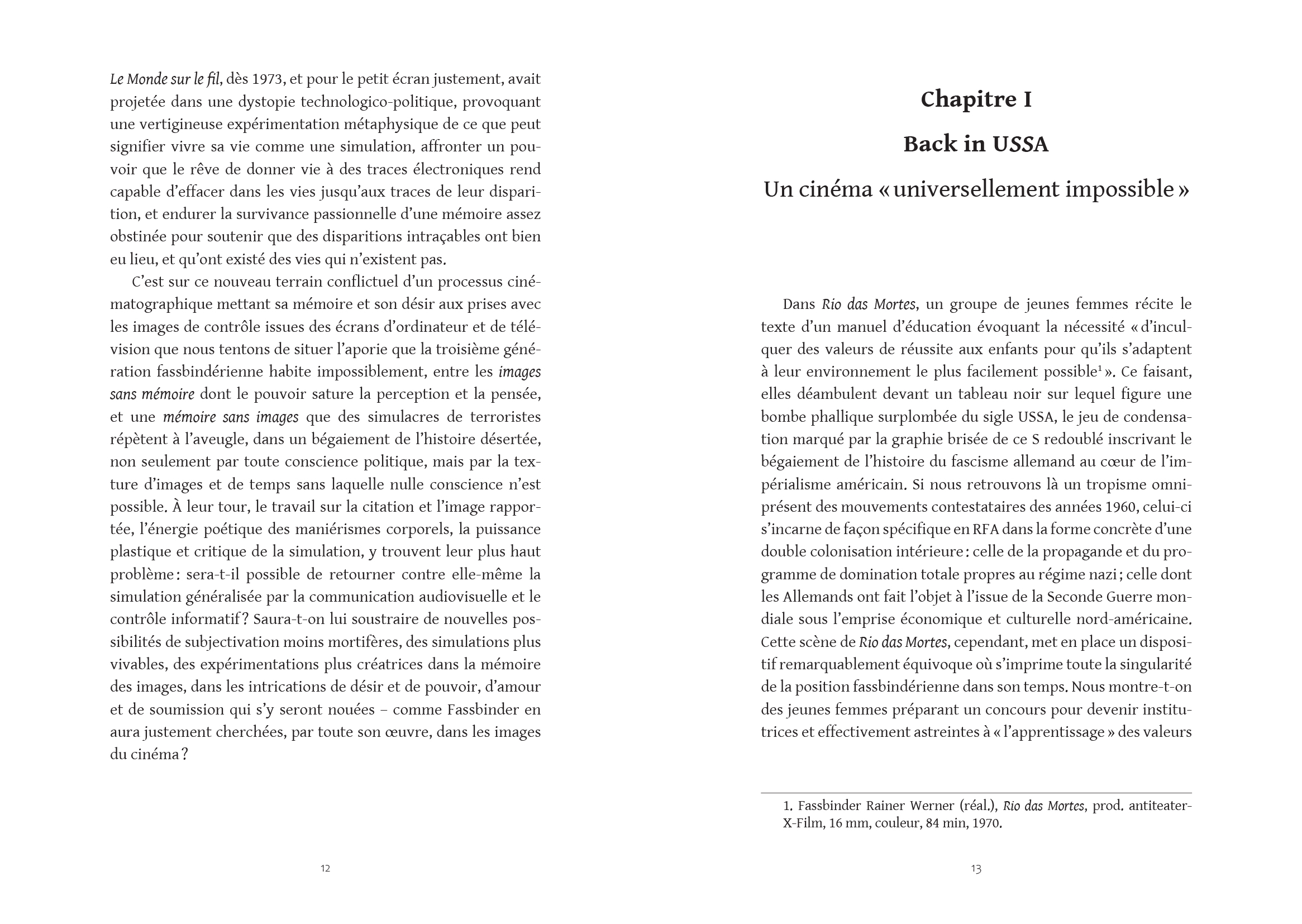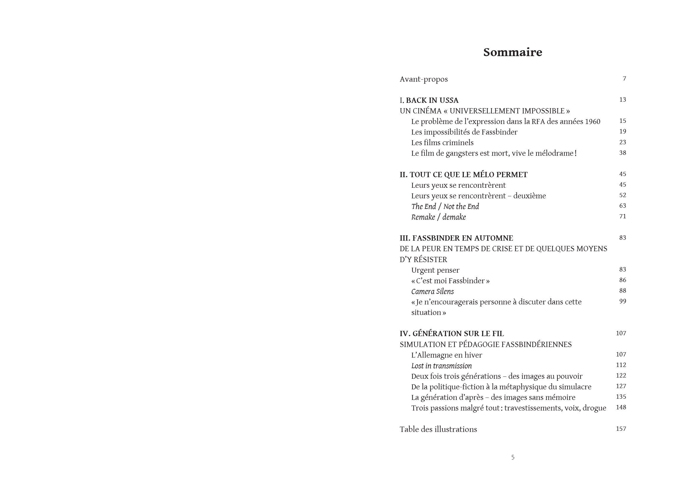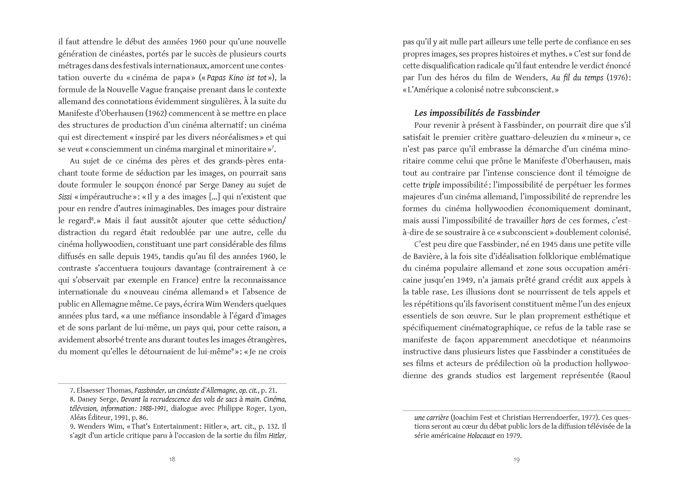 Les expérimentations du cinéaste dans les codes du cinéma de genre – film criminel, mélodrame, SF – y sont envisagées comme autant d'issues cherchées à un cinéma d'Allemagne impossible, tendu entre une industrie culturelle nationale sortie du IIIe Reich radicalement discréditée et l'empire exercé par les États-Unis sur le marché du film et la fabrique des imaginaires. Puisque c'est à Hollywood qu'est né le désir de cinéma de Fassbinder dans la RFA de l'après-guerre, que faire, sinon tenter d'en autochtoniser les images, risquer des films de gangsters allemands, des mélodrames d'immigrés et de déclassés munichois ? Et dans quelles images parvenir encore à machiner son désir dans la nouvelle conjoncture sensible imposée par l'Automne allemand et l'emprise de la communication médiatique ? Pour qui n'a pas de moyens d'expression propres mais seulement des langues étrangères à la fois incontournables et inappropriables, la citation se révèle le geste par excellence d'un cinéma mineur, voué à travailler dans des images d'emprunt, et à acclimater impossiblement les manières de vivre qu'elles prescrivent aux corps censés les incarner.