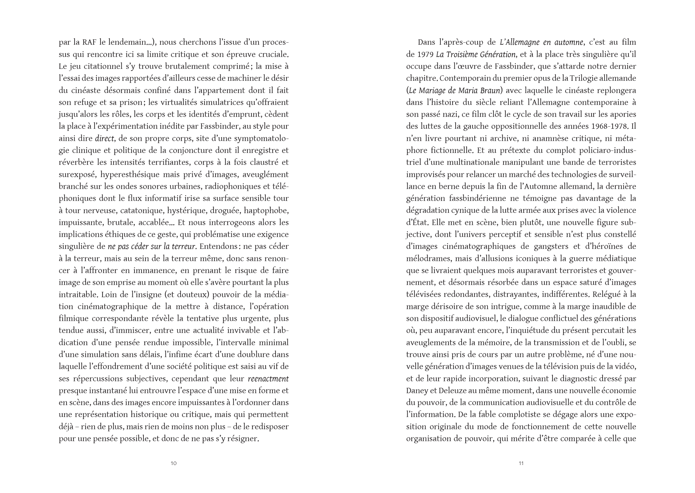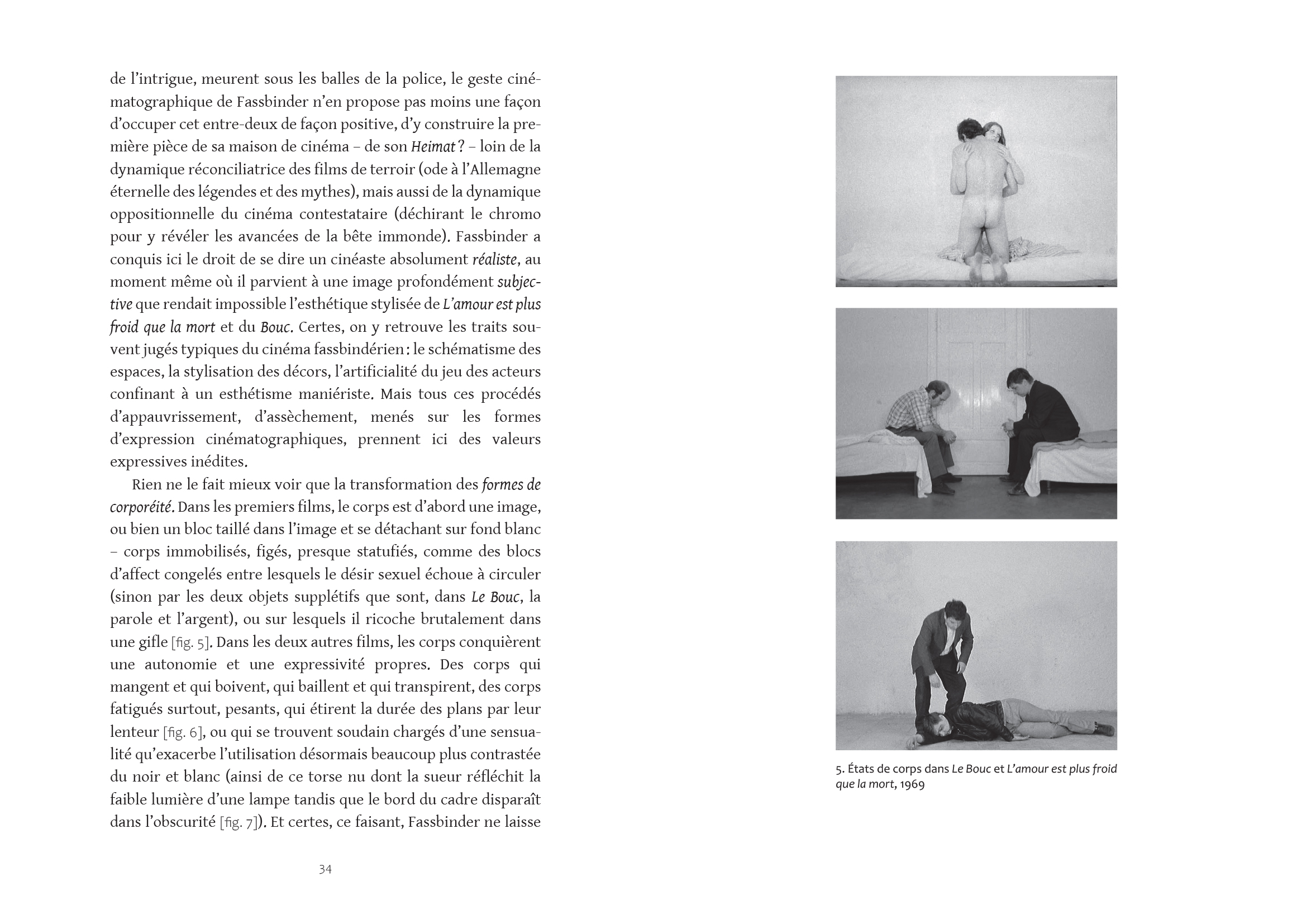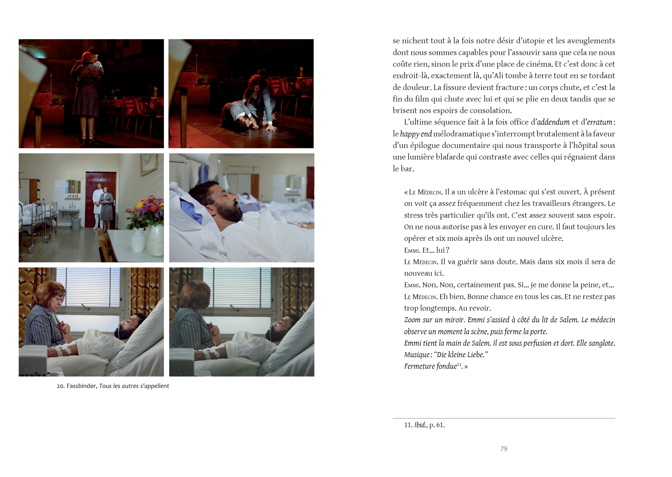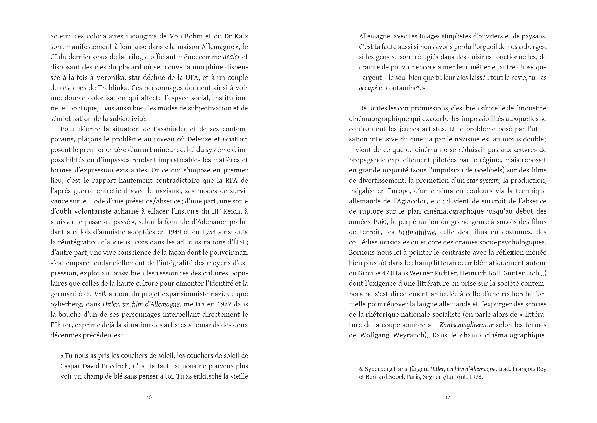 Les expérimentations du cinéaste dans les codes du cinéma de genre – film criminel, mélodrame, SF – y sont envisagées comme autant d'issues cherchées à un cinéma d'Allemagne impossible, tendu entre une industrie culturelle nationale sortie du IIIe Reich radicalement discréditée et l'empire exercé par les États-Unis sur le marché du film et la fabrique des imaginaires. Puisque c'est à Hollywood qu'est né le désir de cinéma de Fassbinder dans la RFA de l'après-guerre, que faire, sinon tenter d'en autochtoniser les images, risquer des films de gangsters allemands, des mélodrames d'immigrés et de déclassés munichois ? Et dans quelles images parvenir encore à machiner son désir dans la nouvelle conjoncture sensible imposée par l'Automne allemand et l'emprise de la communication médiatique ? Pour qui n'a pas de moyens d'expression propres mais seulement des langues étrangères à la fois incontournables et inappropriables, la citation se révèle le geste par excellence d'un cinéma mineur, voué à travailler dans des images d'emprunt, et à acclimater impossiblement les manières de vivre qu'elles prescrivent aux corps censés les incarner.