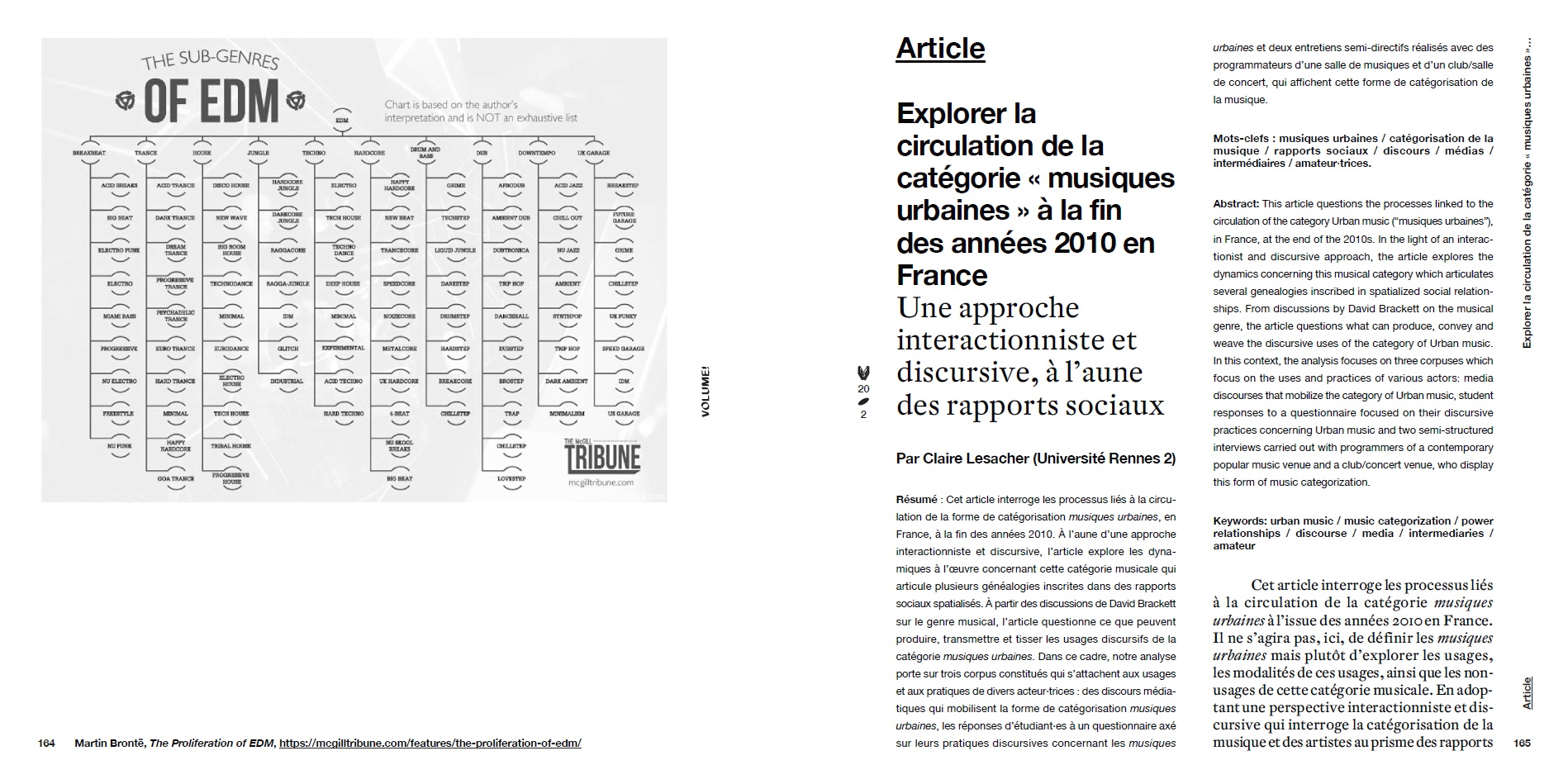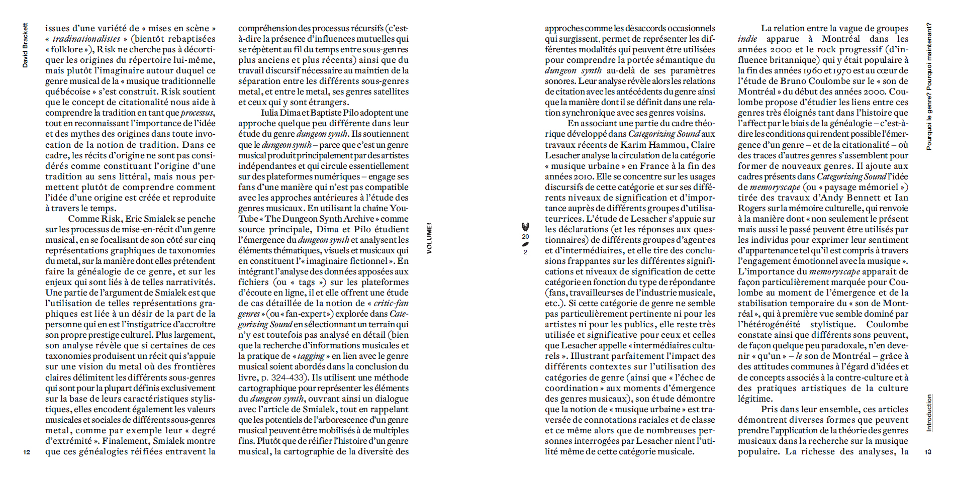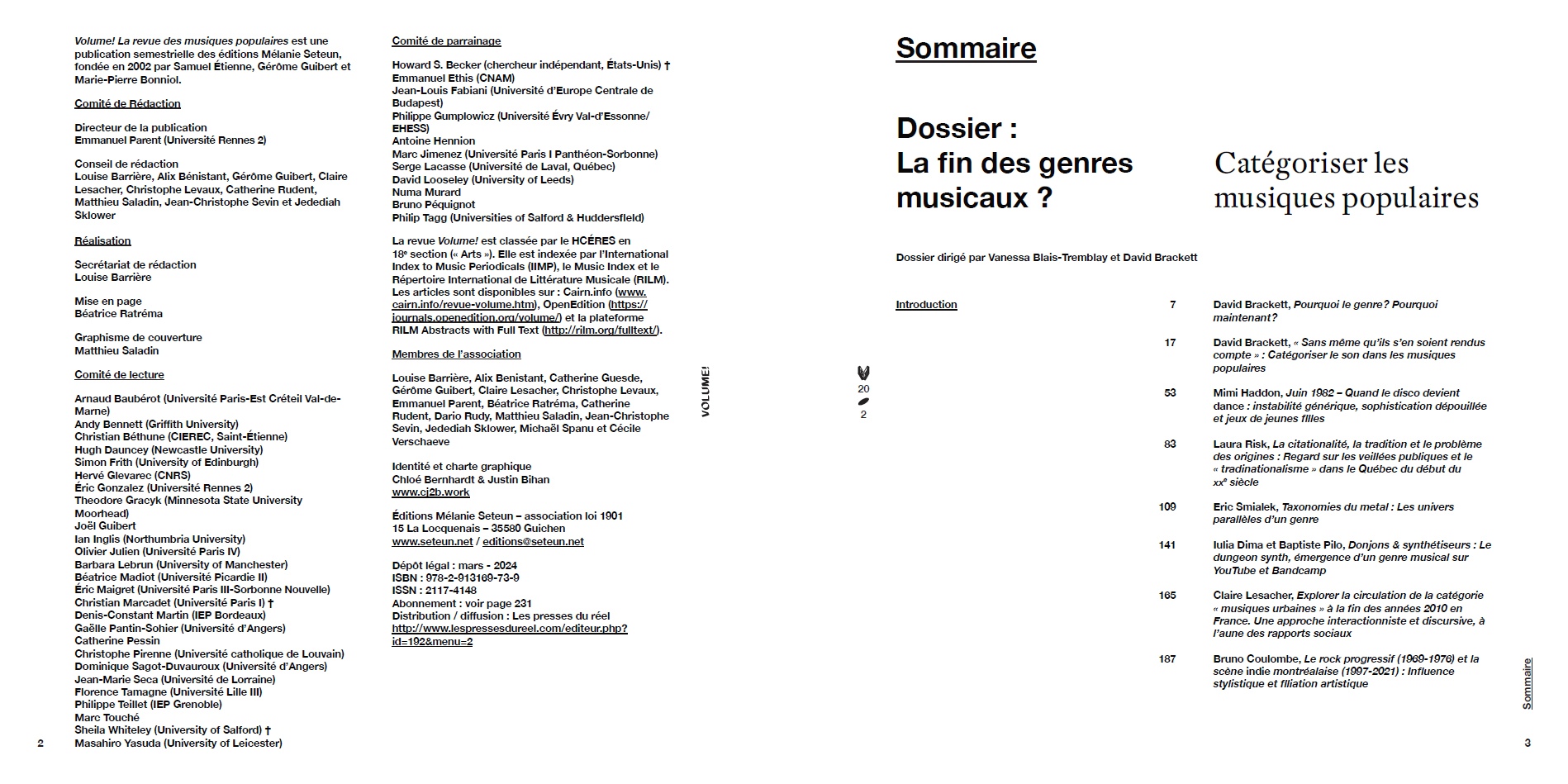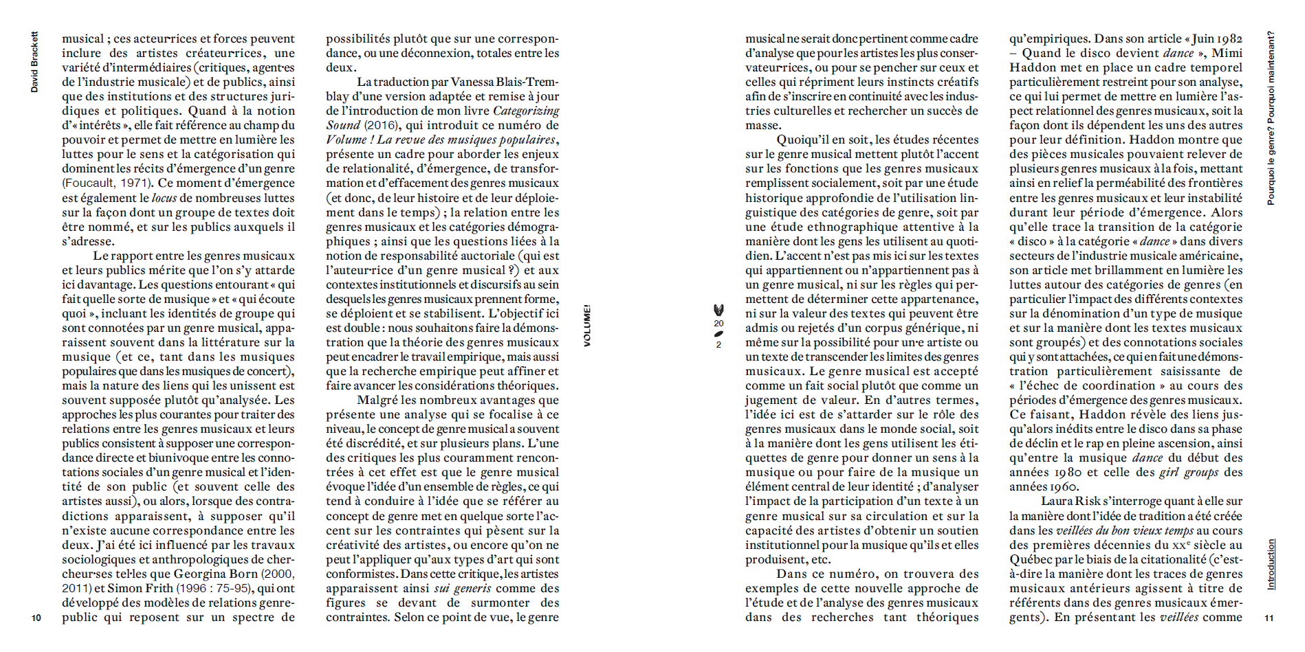 Tandis que des discours médiatiques annoncent « la fin des genres musicaux », le sens commun perçoit le genre comme une catégorisation imposée, restreignant la liberté des artistes et des auditeur·ices. À l'encontre de cette idée préconçue, ce numéro de Volume ! propose d'emprunter une approche historiciste des genres musicaux. Précédés d'une traduction en français de l'introduction de Categorizing Sound (Brackett, 2016), les 6 articles ici réunis abordent la formation et le développement de genres comme le disco et la dance, la musique traditionnelle, le metal, le dungeon synth, les musiques urbaines, l'indie et le rock progressif. Dans son ensemble, le numéro souligne comment le concept de genre musical se révèle un puissant outil pour analyser les relations étroites du son et des significations sociales que porte la musique.