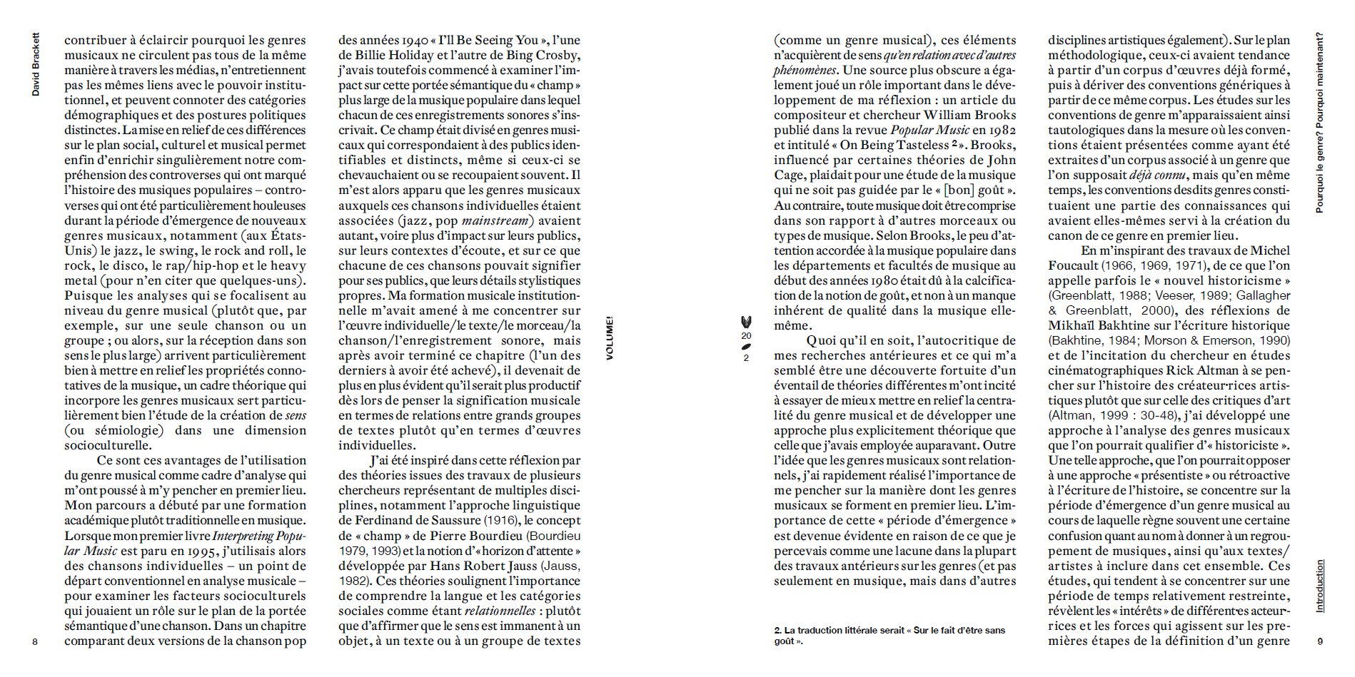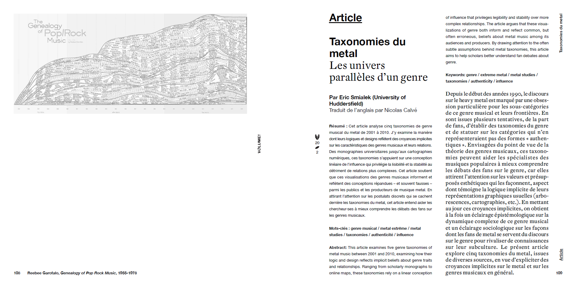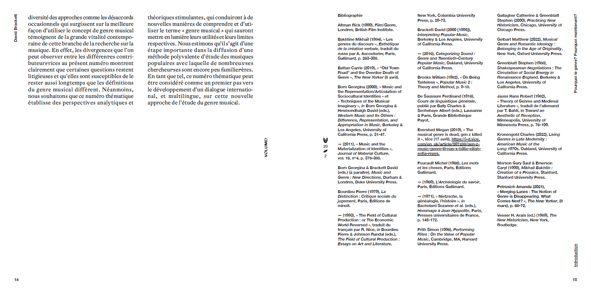 Tandis que des discours médiatiques annoncent « la fin des genres musicaux », le sens commun perçoit le genre comme une catégorisation imposée, restreignant la liberté des artistes et des auditeur·ices. À l'encontre de cette idée préconçue, ce numéro de Volume ! propose d'emprunter une approche historiciste des genres musicaux. Précédés d'une traduction en français de l'introduction de Categorizing Sound (Brackett, 2016), les 6 articles ici réunis abordent la formation et le développement de genres comme le disco et la dance, la musique traditionnelle, le metal, le dungeon synth, les musiques urbaines, l'indie et le rock progressif. Dans son ensemble, le numéro souligne comment le concept de genre musical se révèle un puissant outil pour analyser les relations étroites du son et des significations sociales que porte la musique.