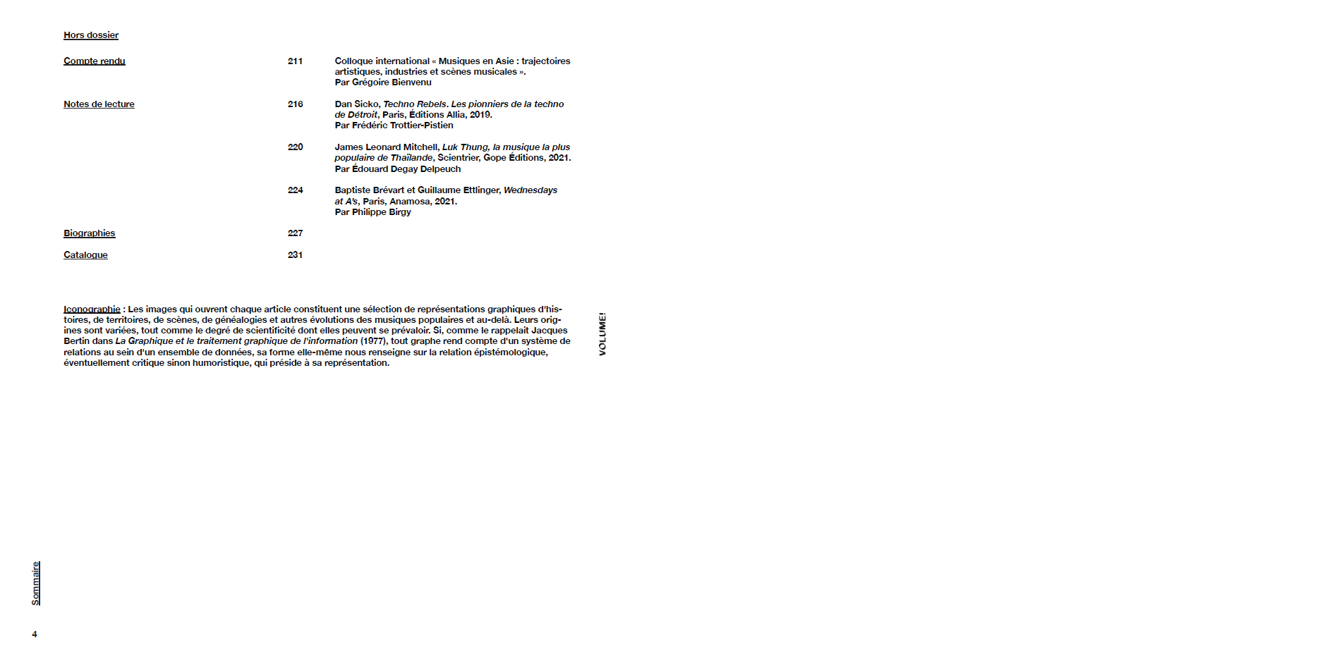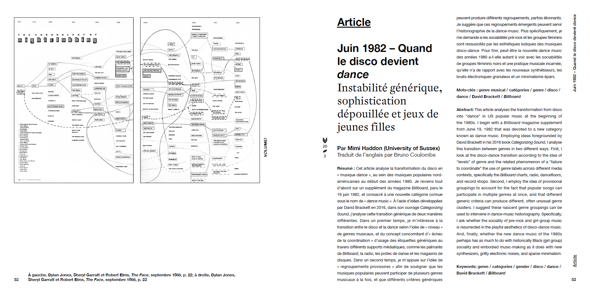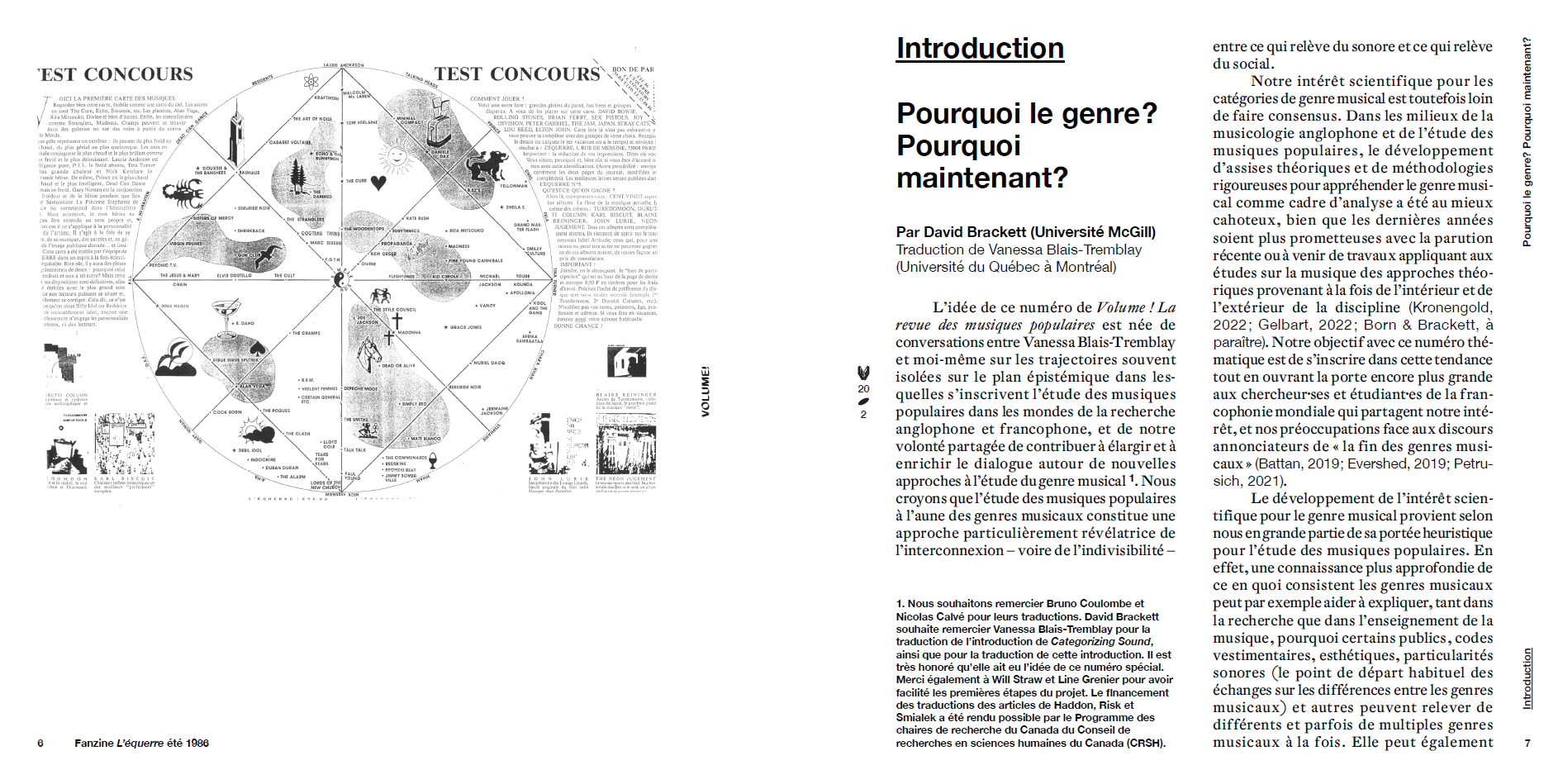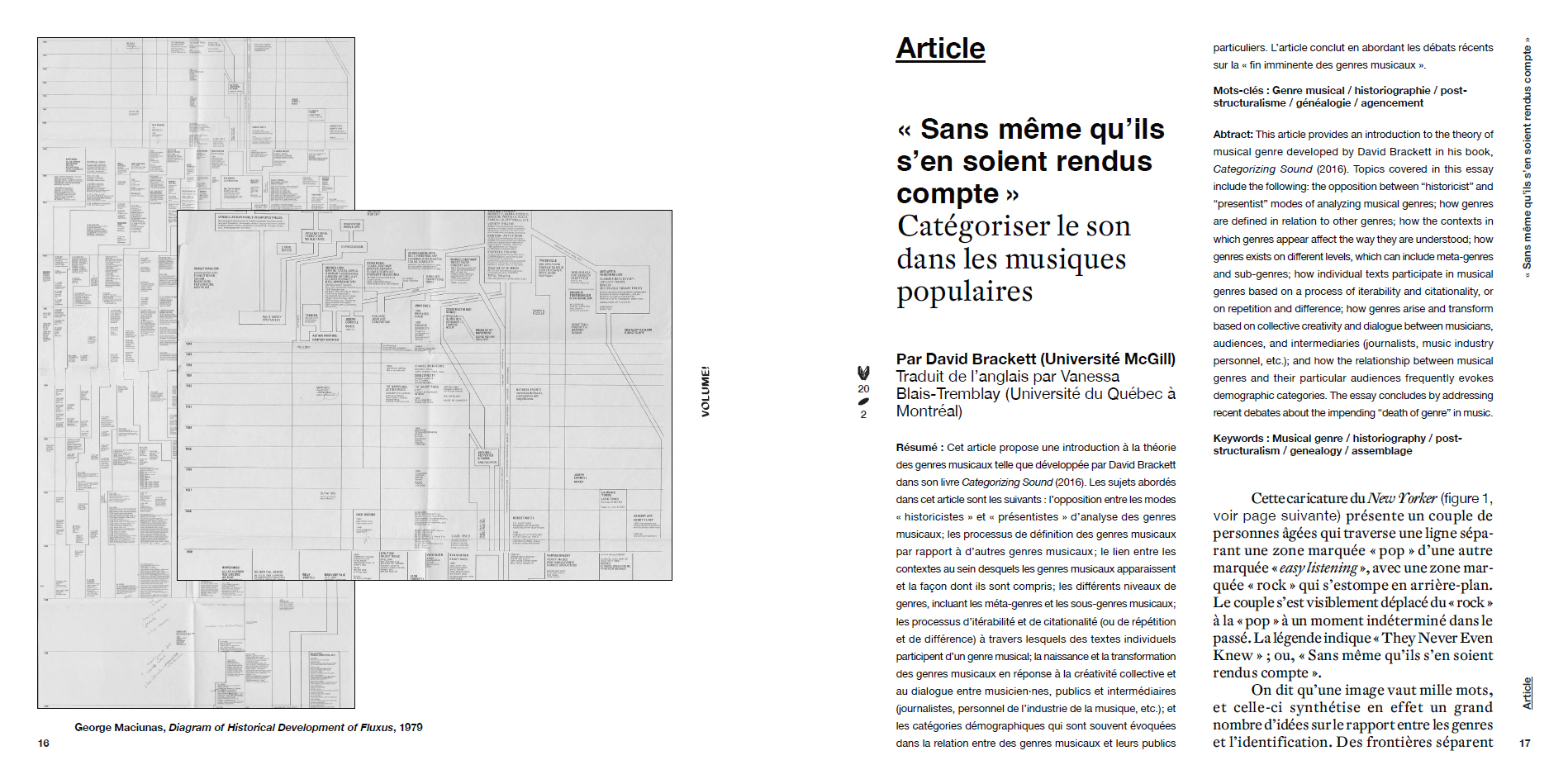 Tandis que des discours médiatiques annoncent « la fin des genres musicaux », le sens commun perçoit le genre comme une catégorisation imposée, restreignant la liberté des artistes et des auditeur·ices. À l'encontre de cette idée préconçue, ce numéro de Volume ! propose d'emprunter une approche historiciste des genres musicaux. Précédés d'une traduction en français de l'introduction de Categorizing Sound (Brackett, 2016), les 6 articles ici réunis abordent la formation et le développement de genres comme le disco et la dance, la musique traditionnelle, le metal, le dungeon synth, les musiques urbaines, l'indie et le rock progressif. Dans son ensemble, le numéro souligne comment le concept de genre musical se révèle un puissant outil pour analyser les relations étroites du son et des significations sociales que porte la musique.
