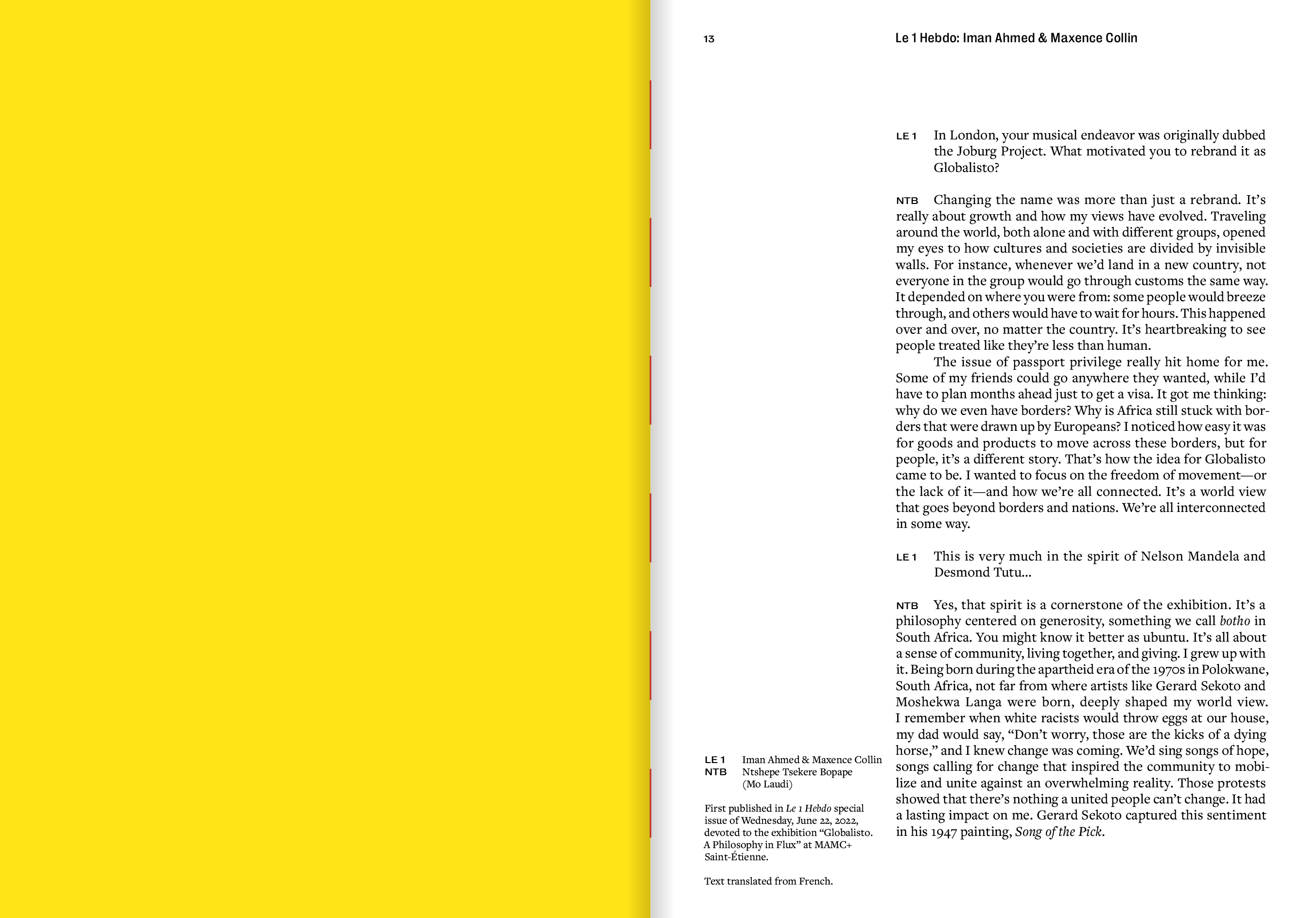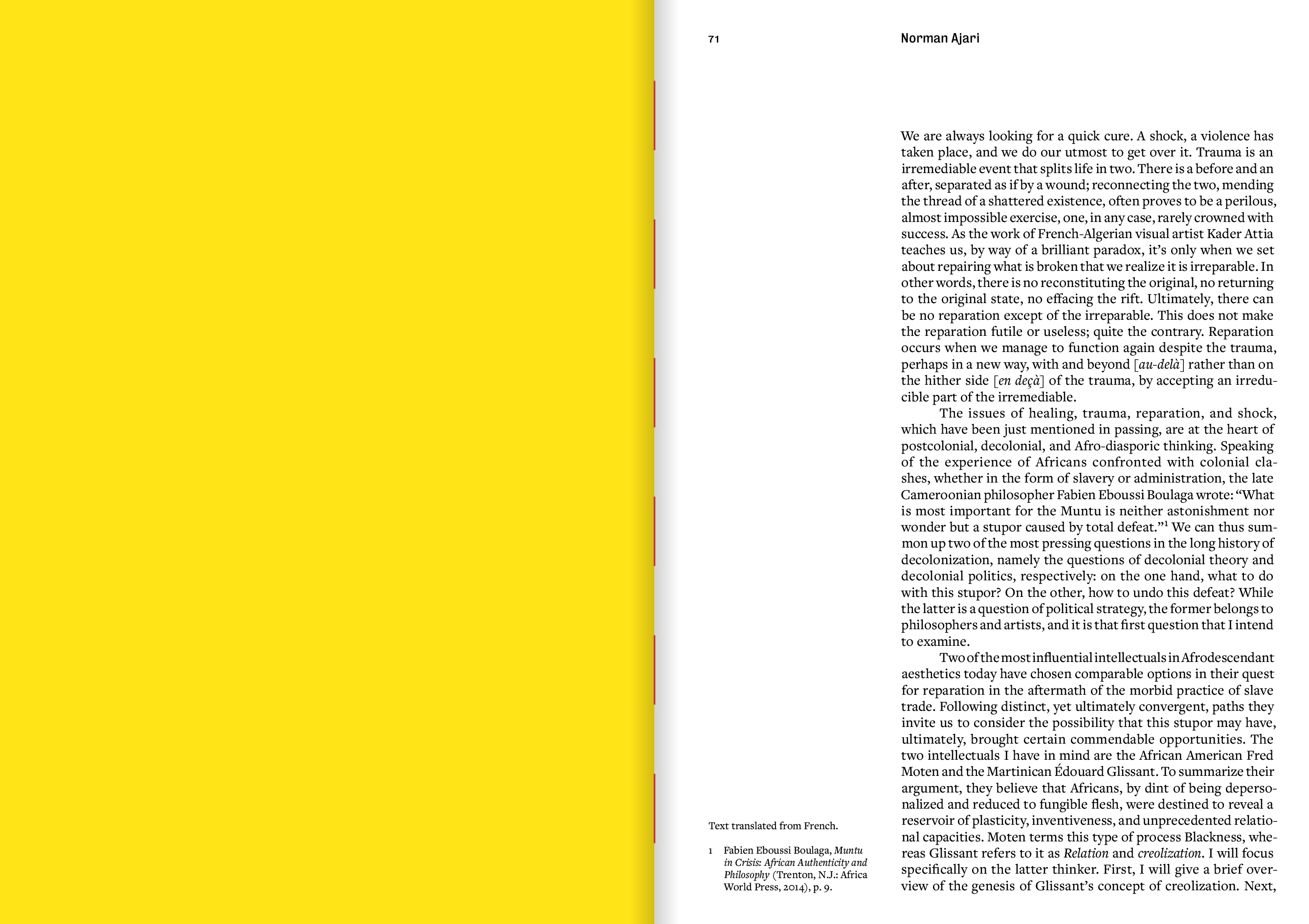 Le prolongement et l'aboutissement d'un vaste projet, articulé entre une exposition et un colloque, imaginé par le commissaire sud-africain Ntshepe Tsekere Bopape (Mo Laudi), invitant 17 artistes d'Afrique et de sa diaspora et un ensemble de chercheurs à évoquer l'esthétique noire et proposer une vision alternative d'un monde sans frontières.
