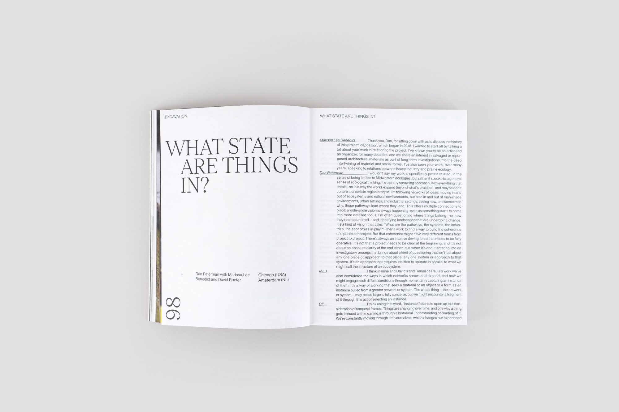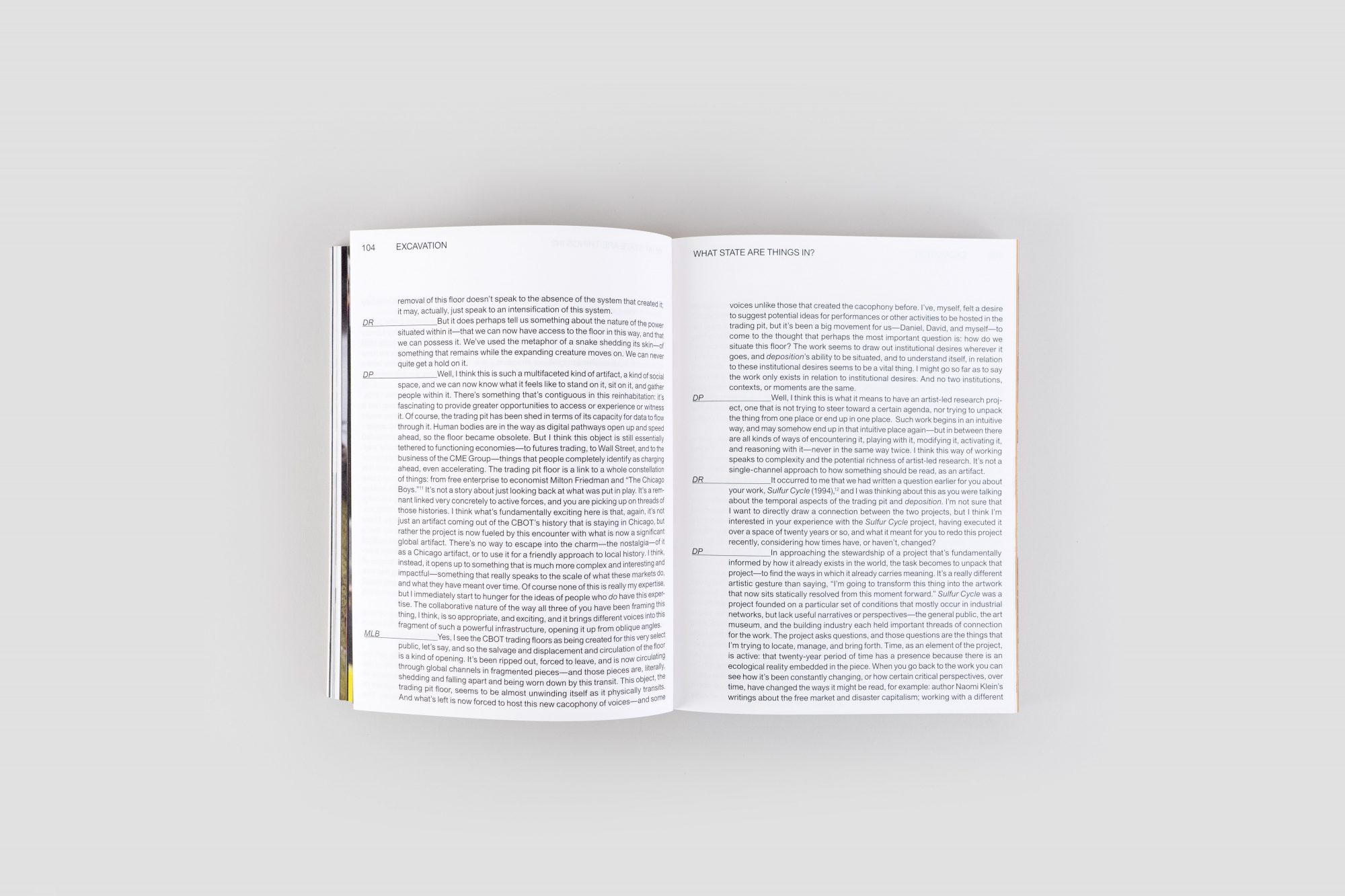 Essays and interviews provide divergent lenses from which to view the work, moving from intimate to distant, scanning over the object, the artists, the art institution, and the architectures of the geopolitical landscape in which these elements operate. Section by section, the book works through the multiple, and compacted, meanings of the word "deposition" (geologic, legal, art historical), layering images and texts to build concrete yet non-linear relations, as the 32 fragments of the former trading floor are dragged from Chicago to São Paulo.