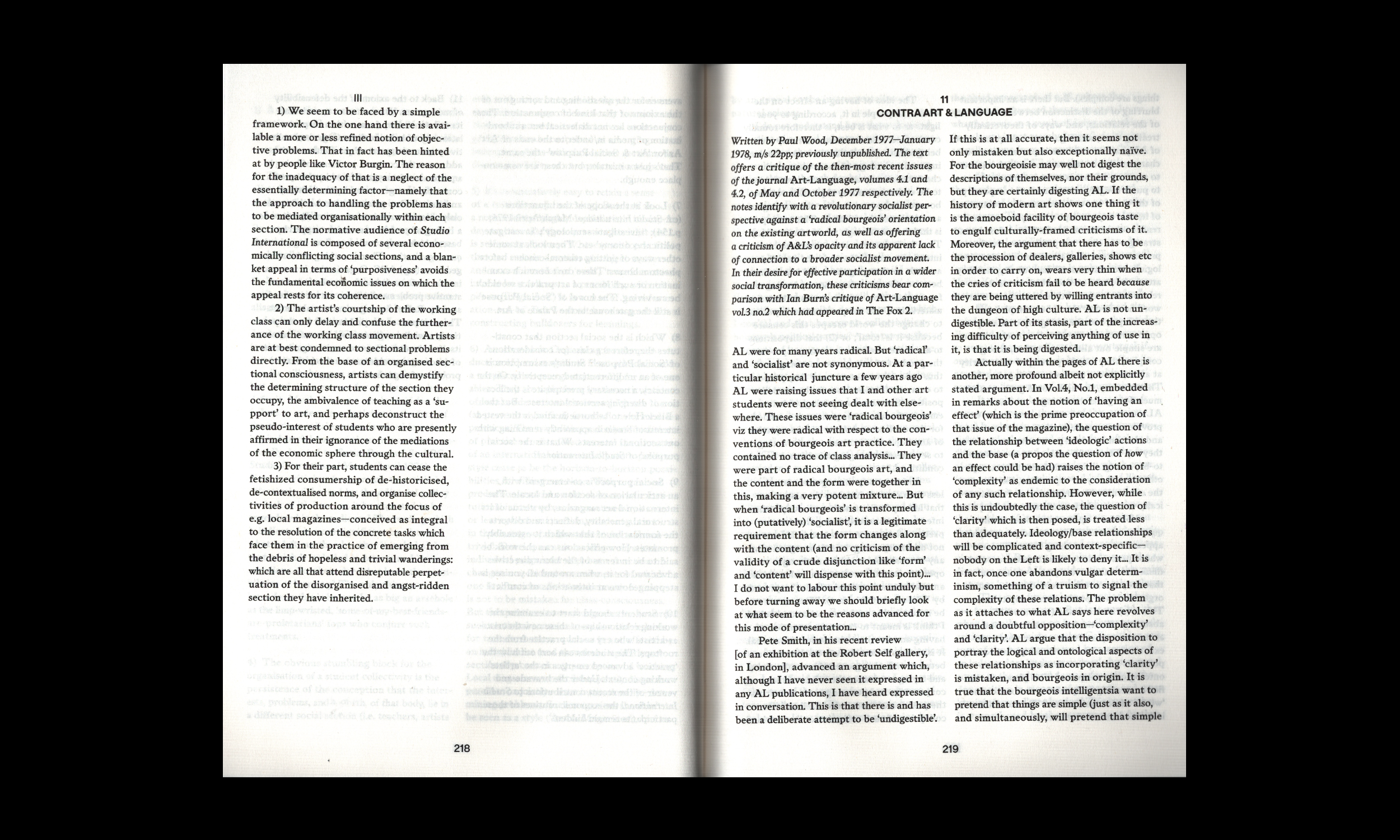 Une étude approfondie des positions politiques de l'art conceptuel au Royaume-Uni depuis les années 1970 et 1980, dans l'orbite de Art & Language, notamment concernant la critique des normes des pratiques artistiques modernistes, et des pratiques de l'enseignement artistique.