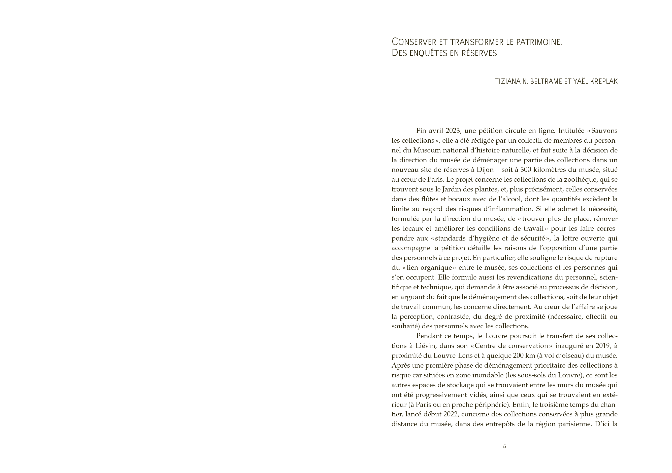Car, loin d'être un lieu dormant où reposeraient les objets entre deux expositions, les réserves se transforment depuis une vingtaine d'années. En sortant des sous-sols, en étant gérées par des professionnels dédiés, voire en s'ouvrant au public, elles s'affirment de plus en plus comme des centres de conservation voués à la préservation et à l'étude des collections – comme un autre centre du musée.