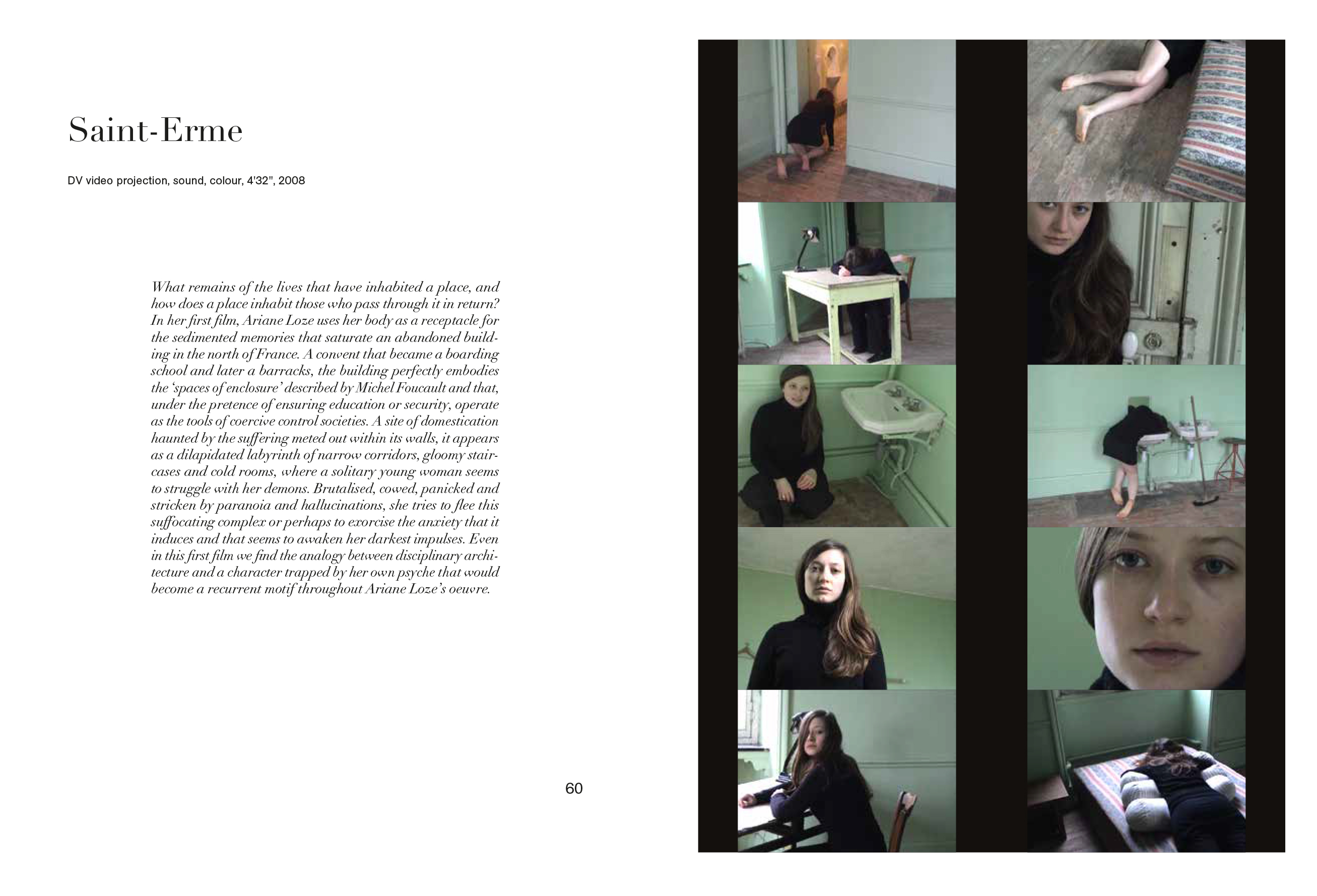 Après avoir étudié le théâtre, Ariane Loze poursuit sa formation dans le domaine de la performance, mettant alors son savoir-faire de comédienne au profit d'une recherche menée avec le médium audiovisuel. Bien que la mise en scène demeure partie intégrante de sa pratique artistique, la vidéo s'impose alors comme son outil principal pour donner lieu dès 2008 à ses premiers films : St Erme, Horror et Pursuit. Déjà singuliers malgré la modestie des moyens techniques, ceux-ci se distinguent d'emblée par le fait que la jeune artiste les réalise seule, posant elle-même la caméra devant laquelle elle interprète tous les personnages pour les faire ensuite coexister, par un jeu habile de champ-contrechamp, dans une unité de lieu. Si les dialogues n'y sont pas encore présents, laissant le soin aux visages, aux gestes et aux postures d'exprimer seuls les émotions et les relations, ils ne cesseront de jouer un rôle croissant du jour où ils apparaîtront dans sa filmographie, comme en témoignent Le Banquet (2016) créé à l'HISK ou encore L'Archipel du moi et Inner Landscape réalisés tous deux en 2018.