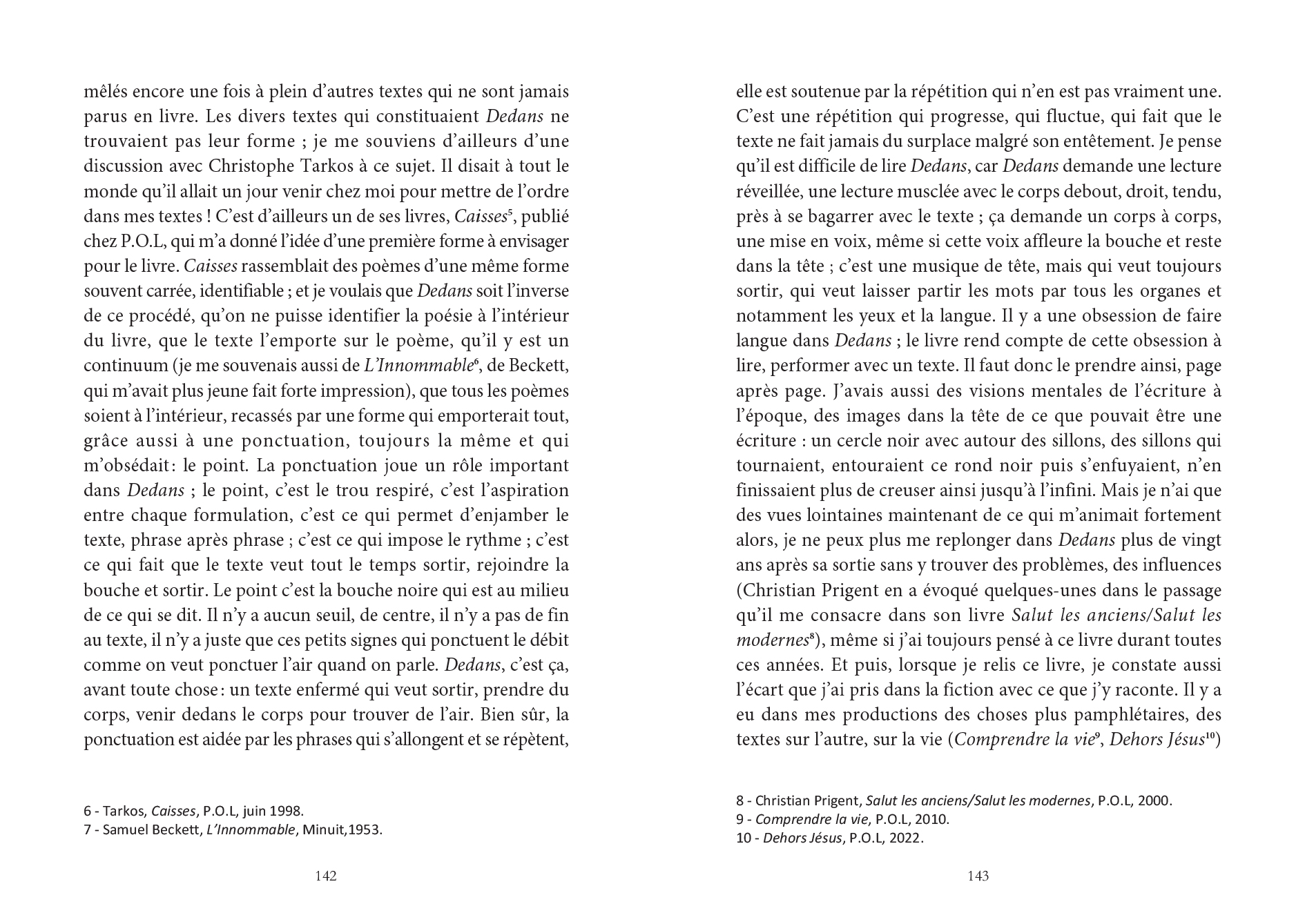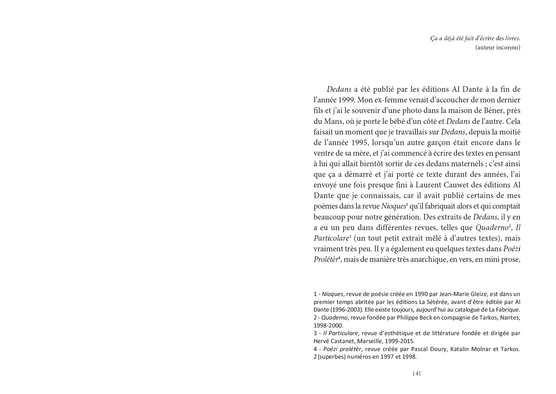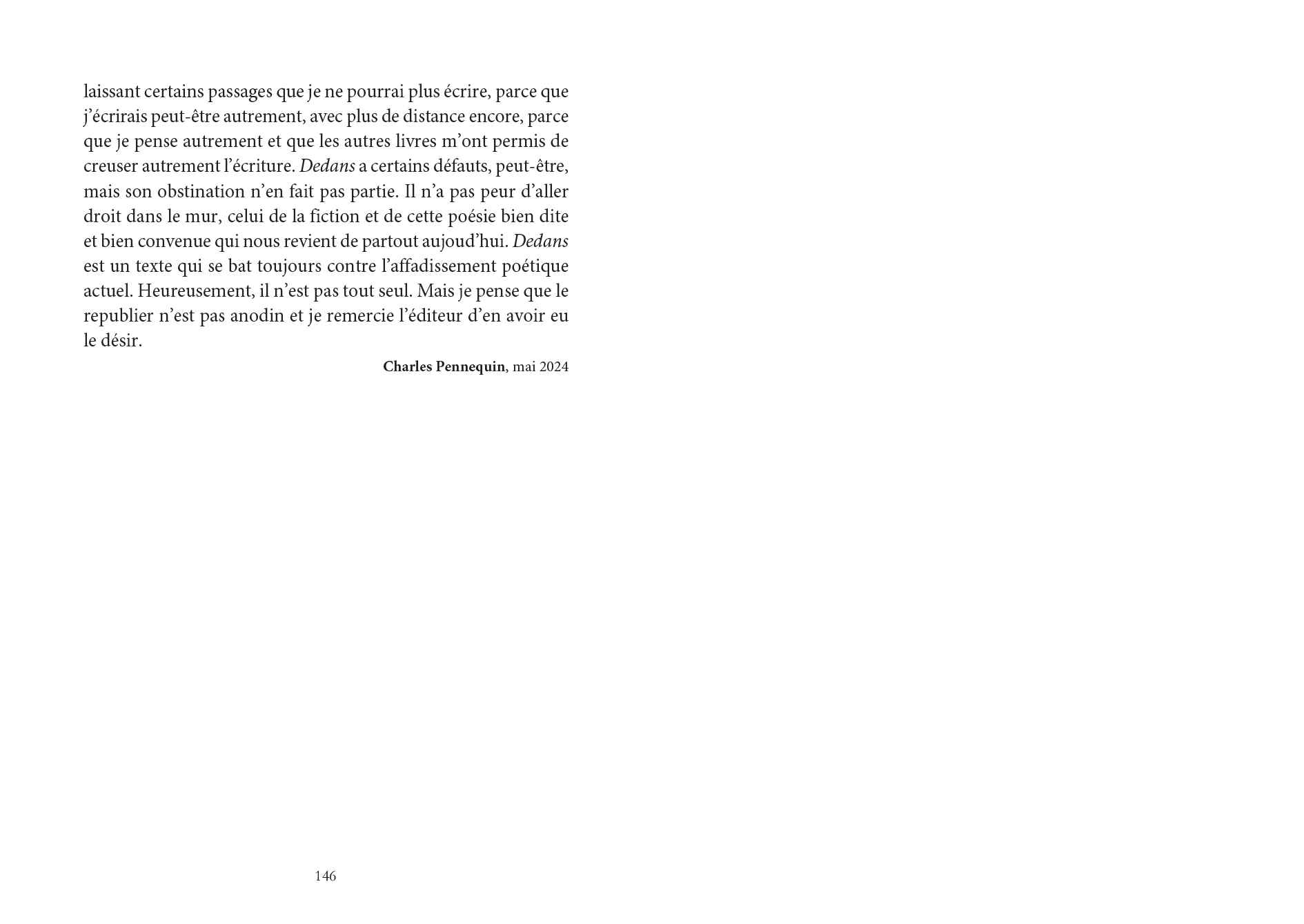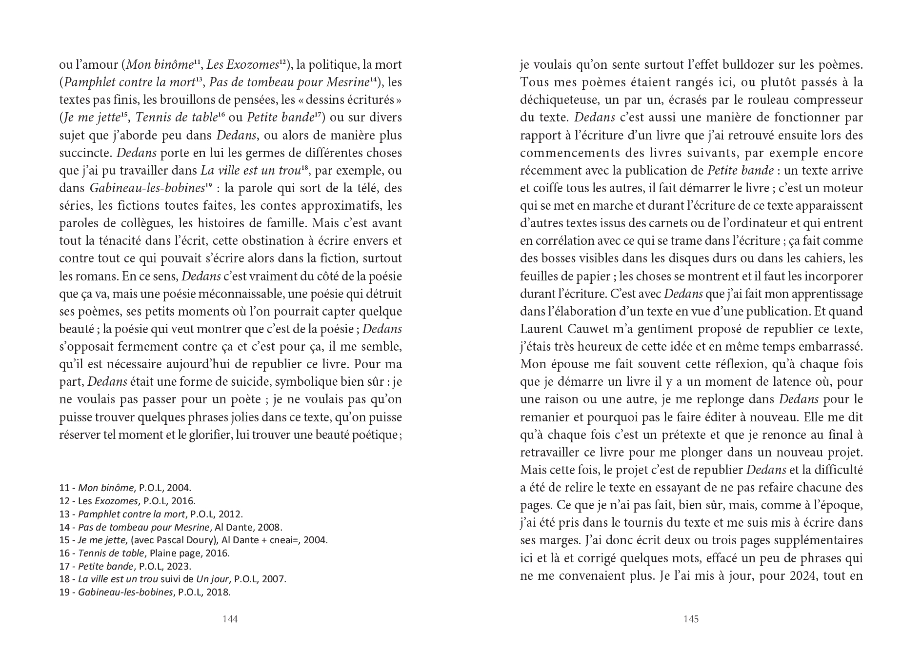 Dedans c'est aussi une manière de fonctionner par rapport à l'écriture d'un livre que j'ai retrouvé ensuite lors des commencements des livres suivants […]. La difficulté a été de relire le texte en essayant de ne pas refaire chacune des pages. Ce que je n'ai pas fait, bien sûr, mais, comme à l'époque, j'ai été pris dans le tournis du texte et me suis mis à écrire dans ses marges. J'ai donc écrit deux ou trois pages supplémentaires ici et là et corrigé quelques mots, effacé un peu de phrases qui ne me convenaient plus. Je l'ai mis à jour, pour 2024, tout en laissant certains passages que je ne pourrai plus écrire, parce que j'écrirais peut-être autrement, avec plus de distance encore, parce que je pense autrement et que les autres livres m'ont permis de creuser autrement l'écriture.