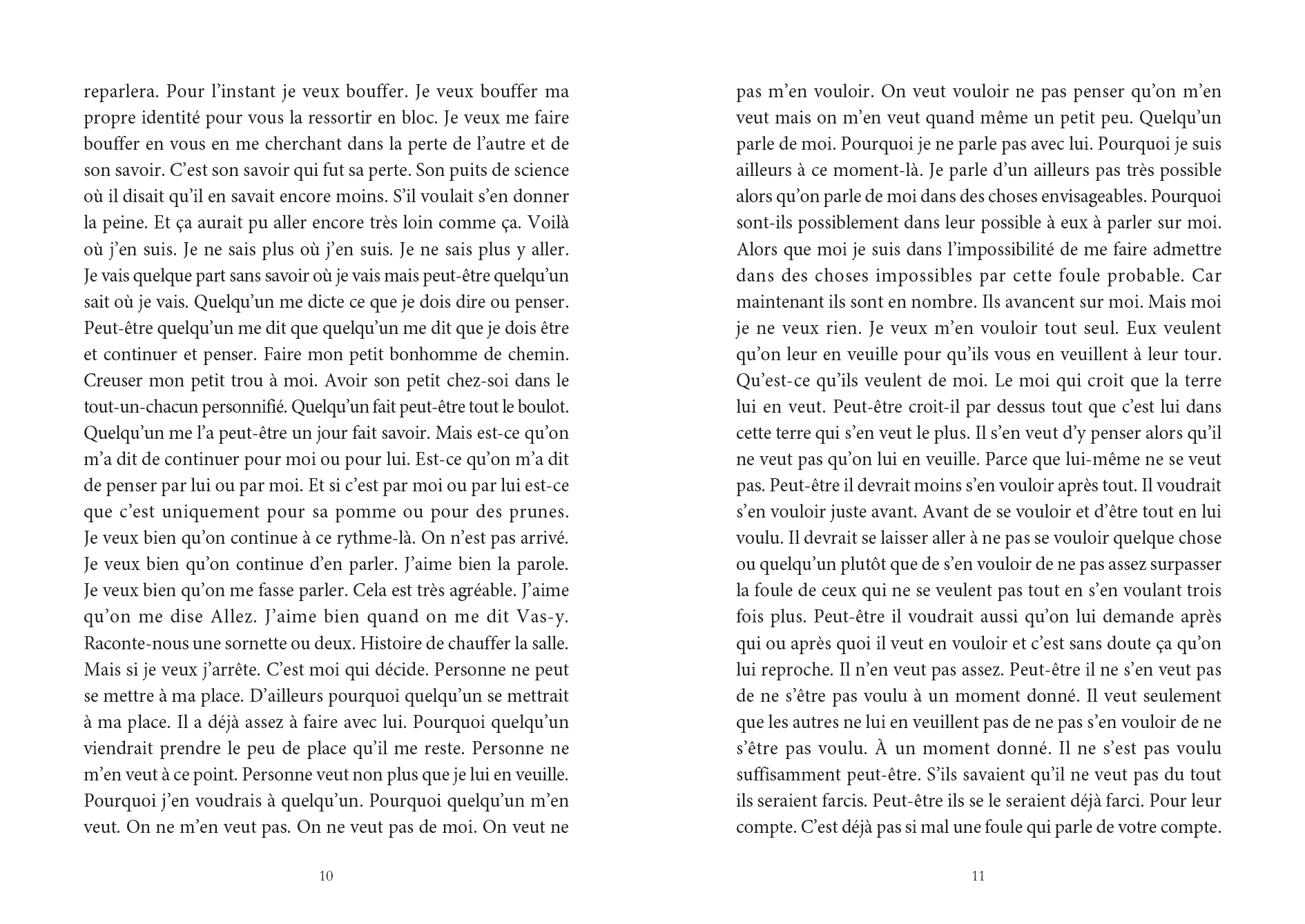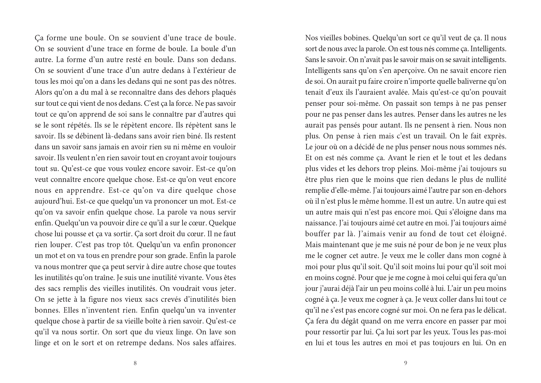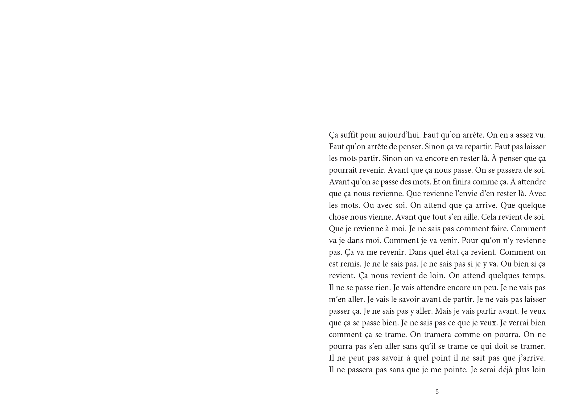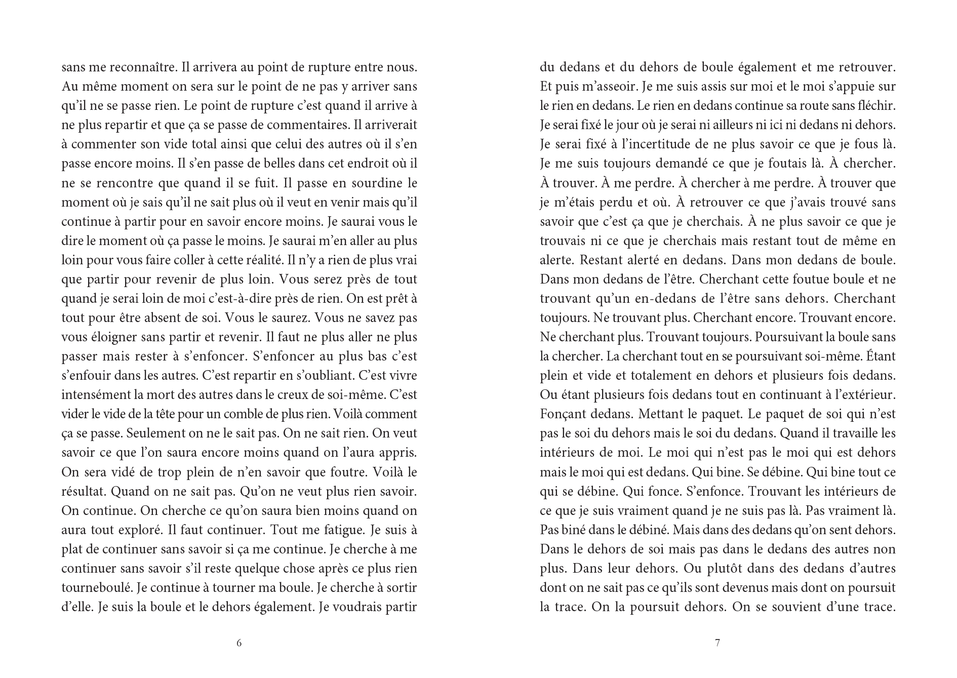 Dedans c'est aussi une manière de fonctionner par rapport à l'écriture d'un livre que j'ai retrouvé ensuite lors des commencements des livres suivants […]. La difficulté a été de relire le texte en essayant de ne pas refaire chacune des pages. Ce que je n'ai pas fait, bien sûr, mais, comme à l'époque, j'ai été pris dans le tournis du texte et me suis mis à écrire dans ses marges. J'ai donc écrit deux ou trois pages supplémentaires ici et là et corrigé quelques mots, effacé un peu de phrases qui ne me convenaient plus. Je l'ai mis à jour, pour 2024, tout en laissant certains passages que je ne pourrai plus écrire, parce que j'écrirais peut-être autrement, avec plus de distance encore, parce que je pense autrement et que les autres livres m'ont permis de creuser autrement l'écriture.