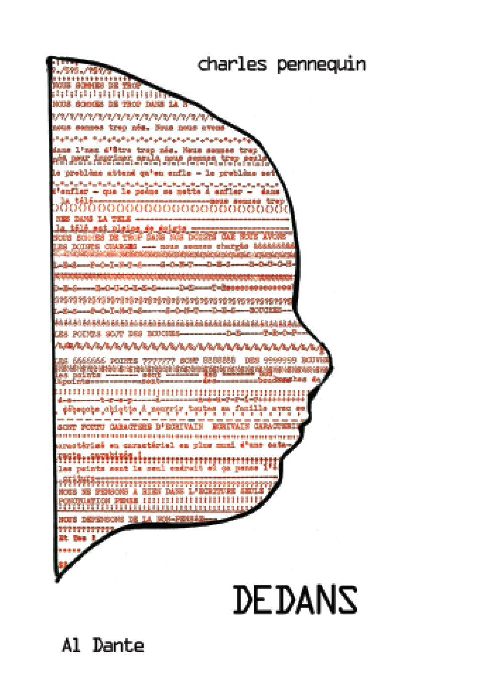 Dedans était une forme de suicide, symbolique bien sûr : je ne voulais pas passer pour un poète ; je ne voulais pas qu'on puisse trouver quelques phrases jolies dans ce texte, qu'on puisse réserver tel moment et le glorifier, lui trouver une beauté poétique ; je voulais qu'on sente surtout l'effet bulldozer sur les poèmes. Tous mes poèmes étaient rangés ici, ou plutôt passés à la déchiqueteuse, un par un, écrasés par le rouleau compresseur du texte.