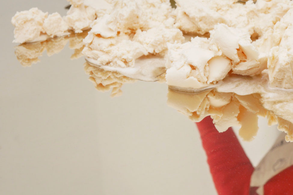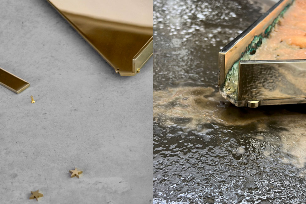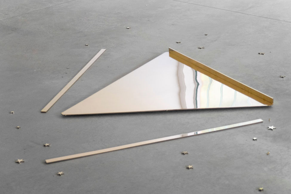 Almost twenty kilos of melon-flavored ice cream mixed with gin fill a triangular bronze prism, flooding the room with a pungent aroma, almost saturating the air and enveloping anyone who approaches in a feeling of freshness and vitality. Slits at the ends of the triangle allow the ice cream to melt and flow beyond the confines of the stainless bronze structure, dispersing into space yet leaving tangible traces of its passage. Hidden in the midst of the ice cream, a multitude of bronze stars emerge little by little. The disintegration of organic matter thus reflects its ephemeral and changeable nature, evoking a sensation of fluidity and transformation—a metaphor for the artist's own approach to self-representation. By juxtaposing materials in unexpected and sometimes contradictory ways, Gennari generates a dialogue between form and concept that induces a profound sense of introspective reflection in the viewer.