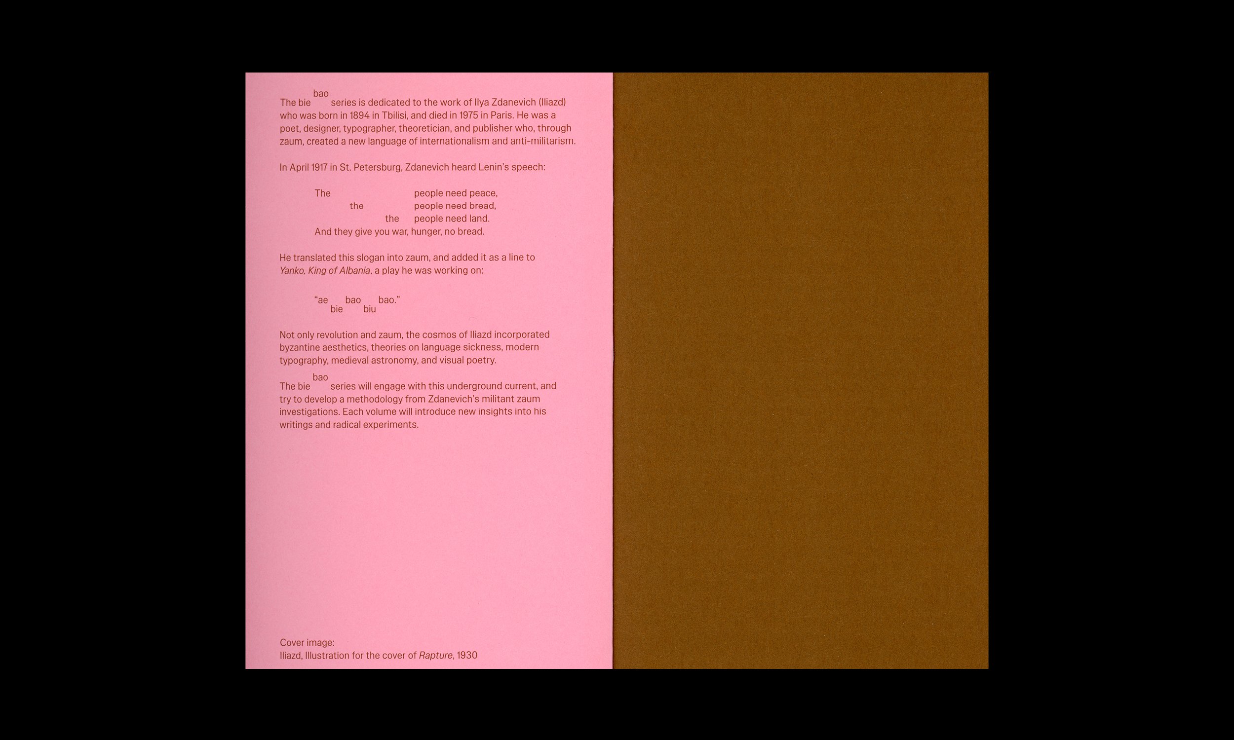 La série bie bao comprendra huit publications, dévoilant différents aspects de la riche production théorique et artistique de Zdanevich. Chaque volume comprend une introduction bio-bibliographique, un commentaire, une traduction annotée et une intervention artistique.