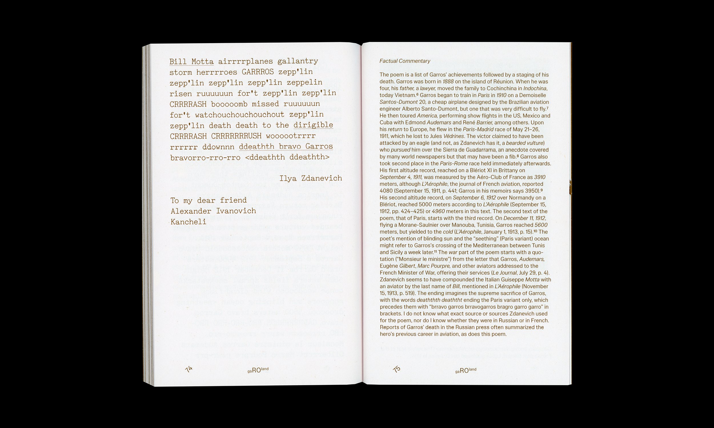 Alongside these texts, this volume also presents Zdanevich's 1914 words-in-freedom poem gaROland. Translated and introduced by the poet Eugene Ostashevsky, the poem is dedicated to the aviator Roland Garros and marks Zdanevich's initiation into Futurist poetry.