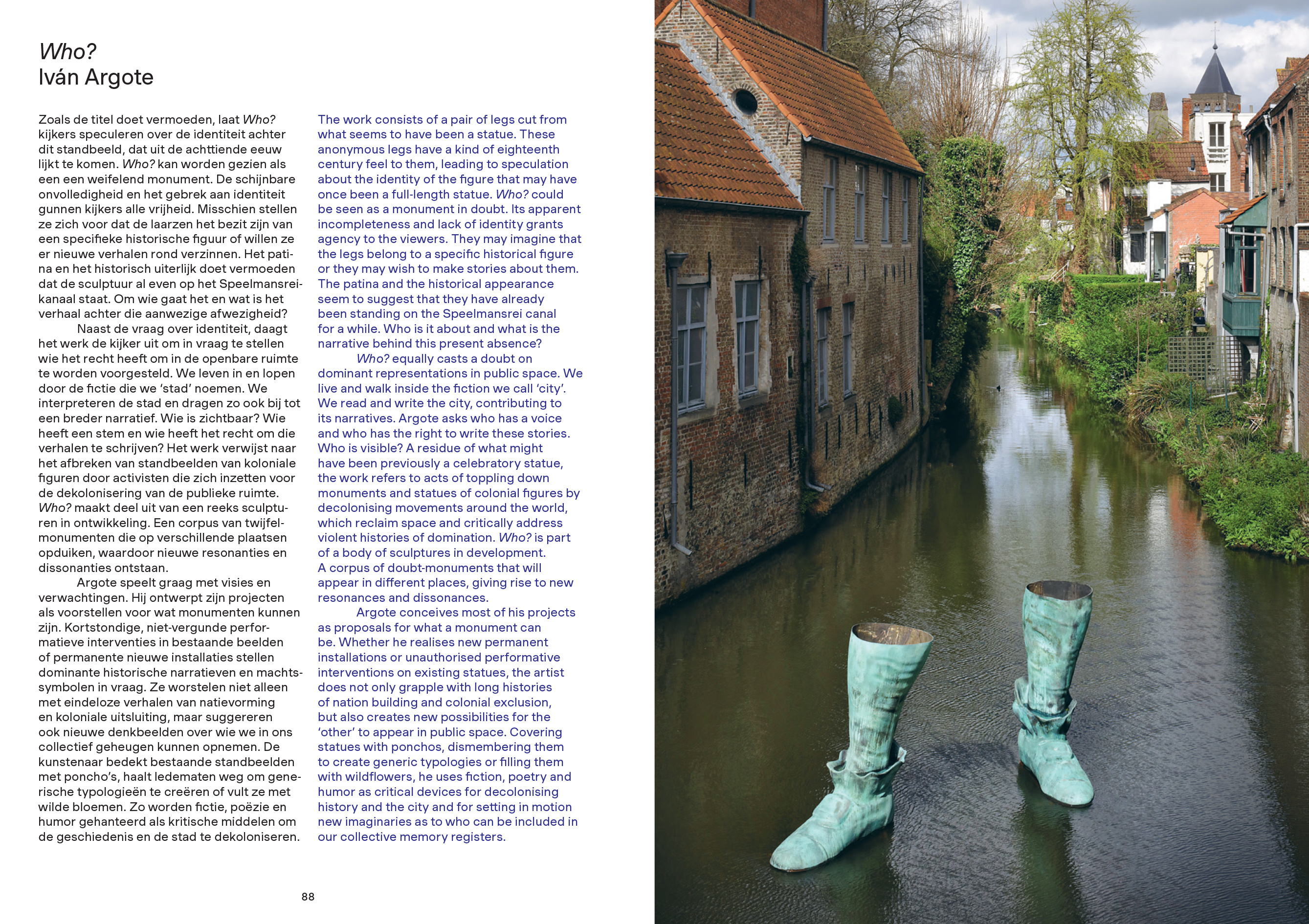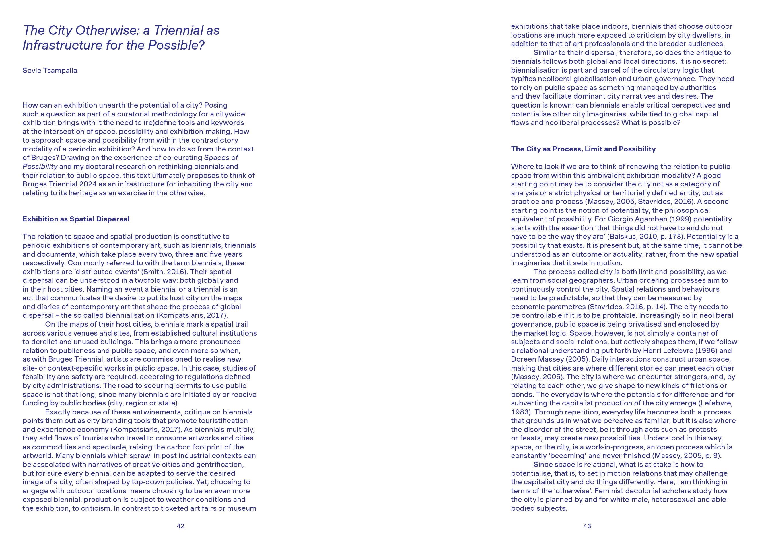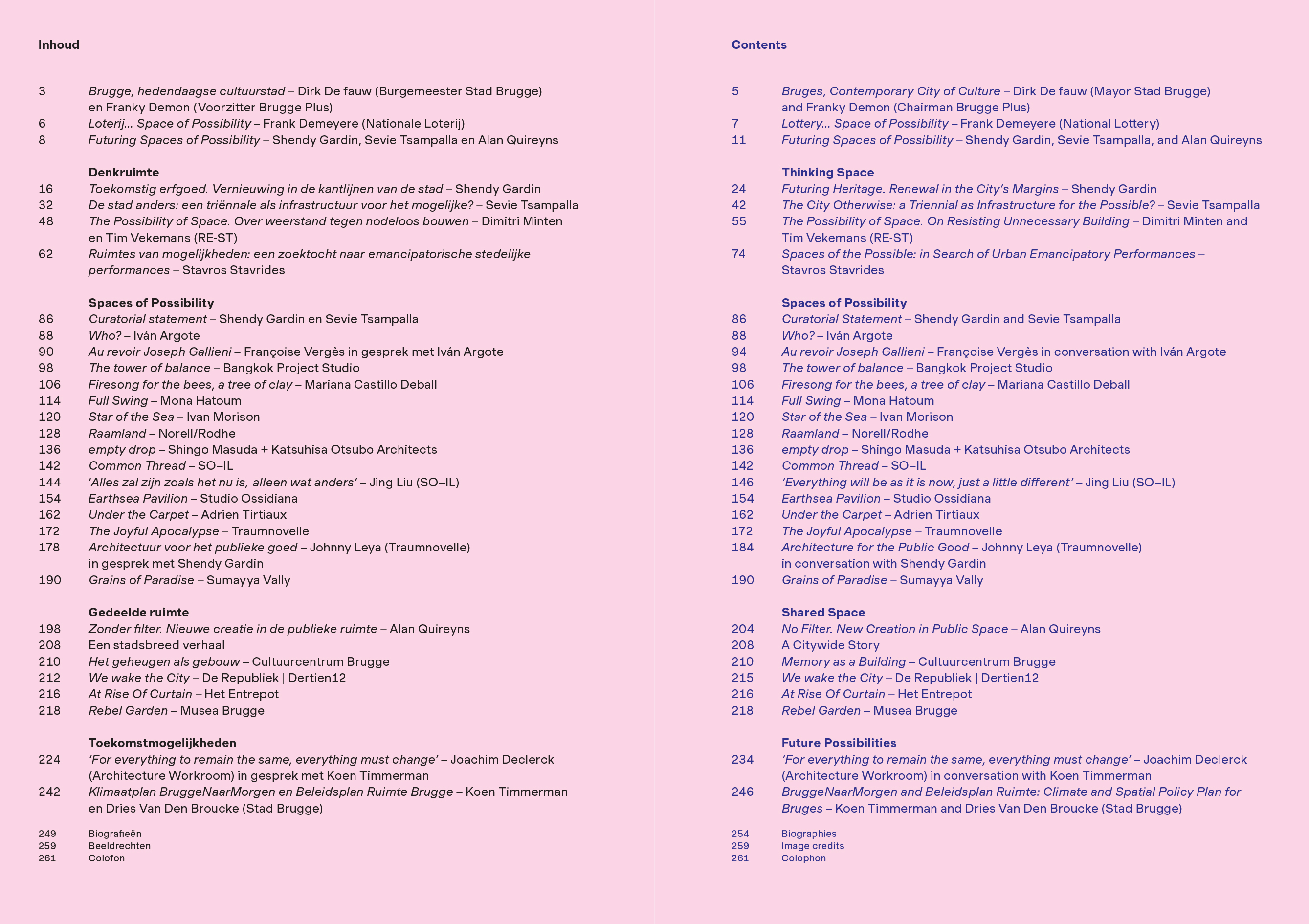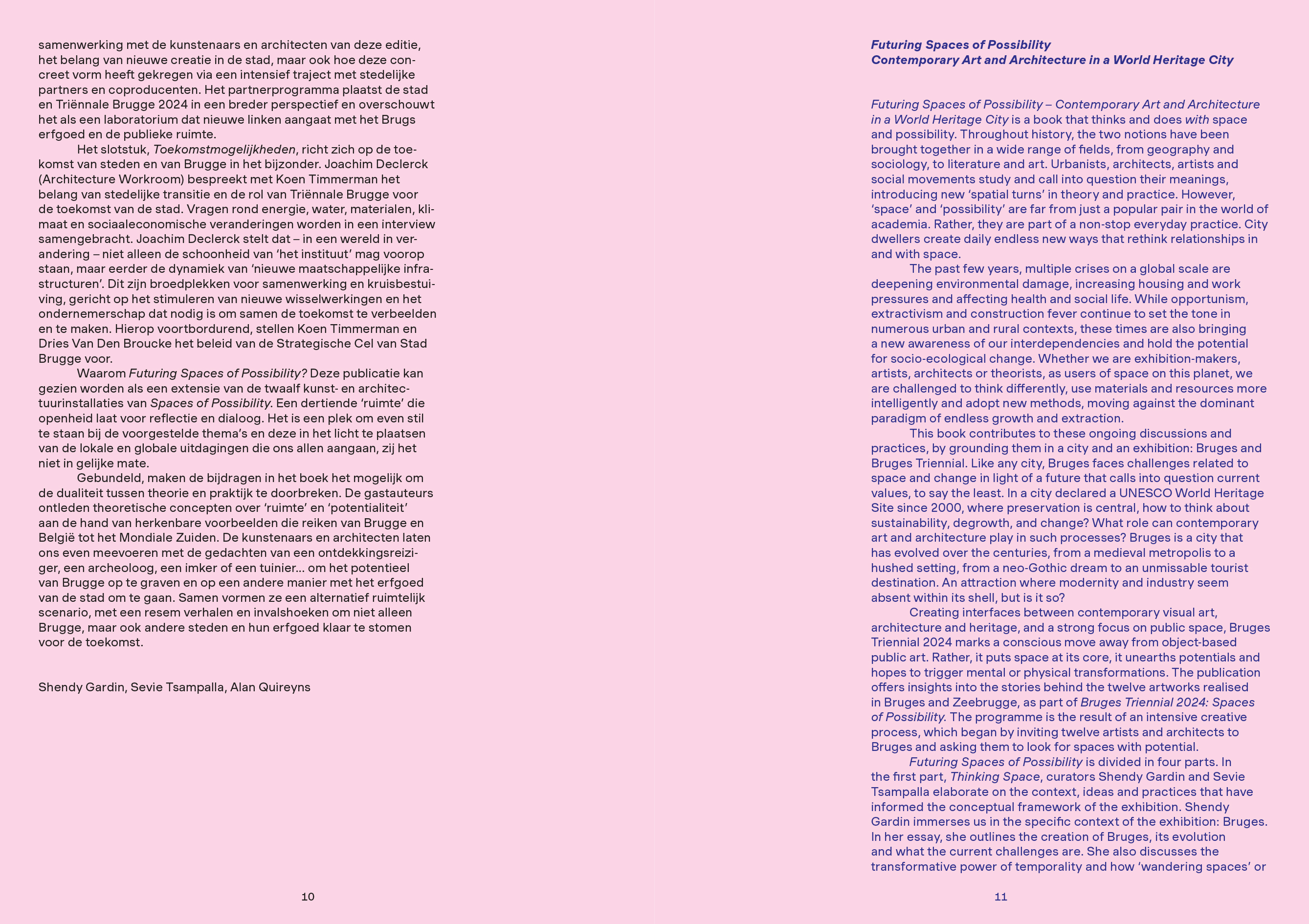 Futuring Spaces of Possibility explore la manière dont l'art et l'architecture contemporains abordent les défis urbains, sociaux et écologiques et créent de nouvelles possibilités pour la ville future. Il invite théoriciens de l'urbanisme, commissaires, artistes et architectes à investir Bruges, site classé au patrimoine mondial de l'UNESCO, comme banc d'essai pour de nouveaux imaginaires spatiaux (catalogue publié à l'occasion de la quatrième Triennale de Bruges en 2024).