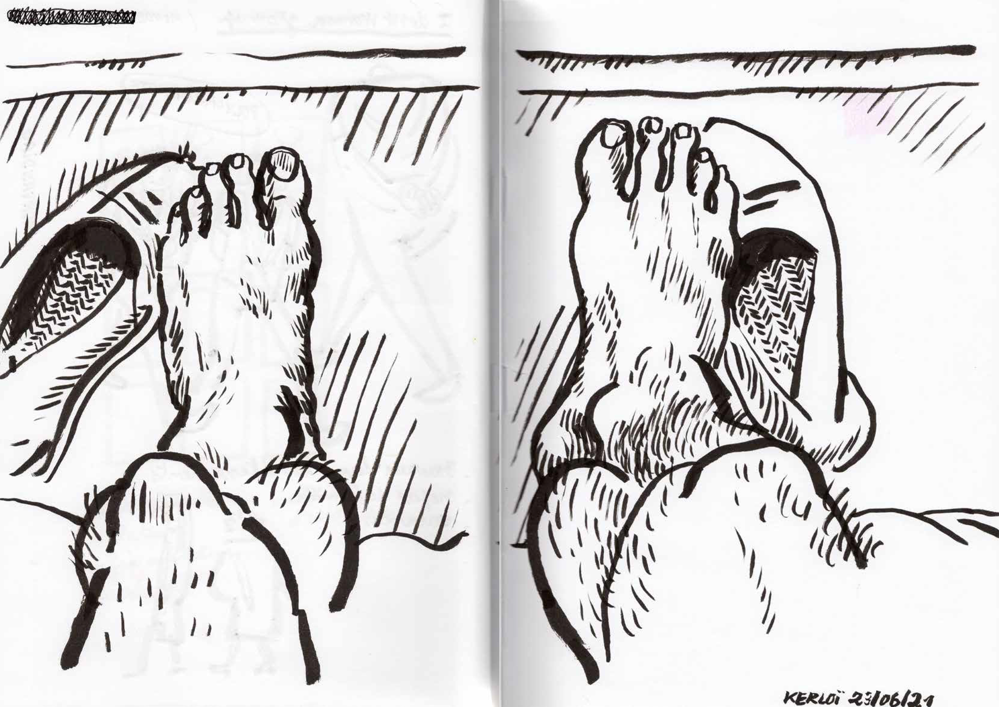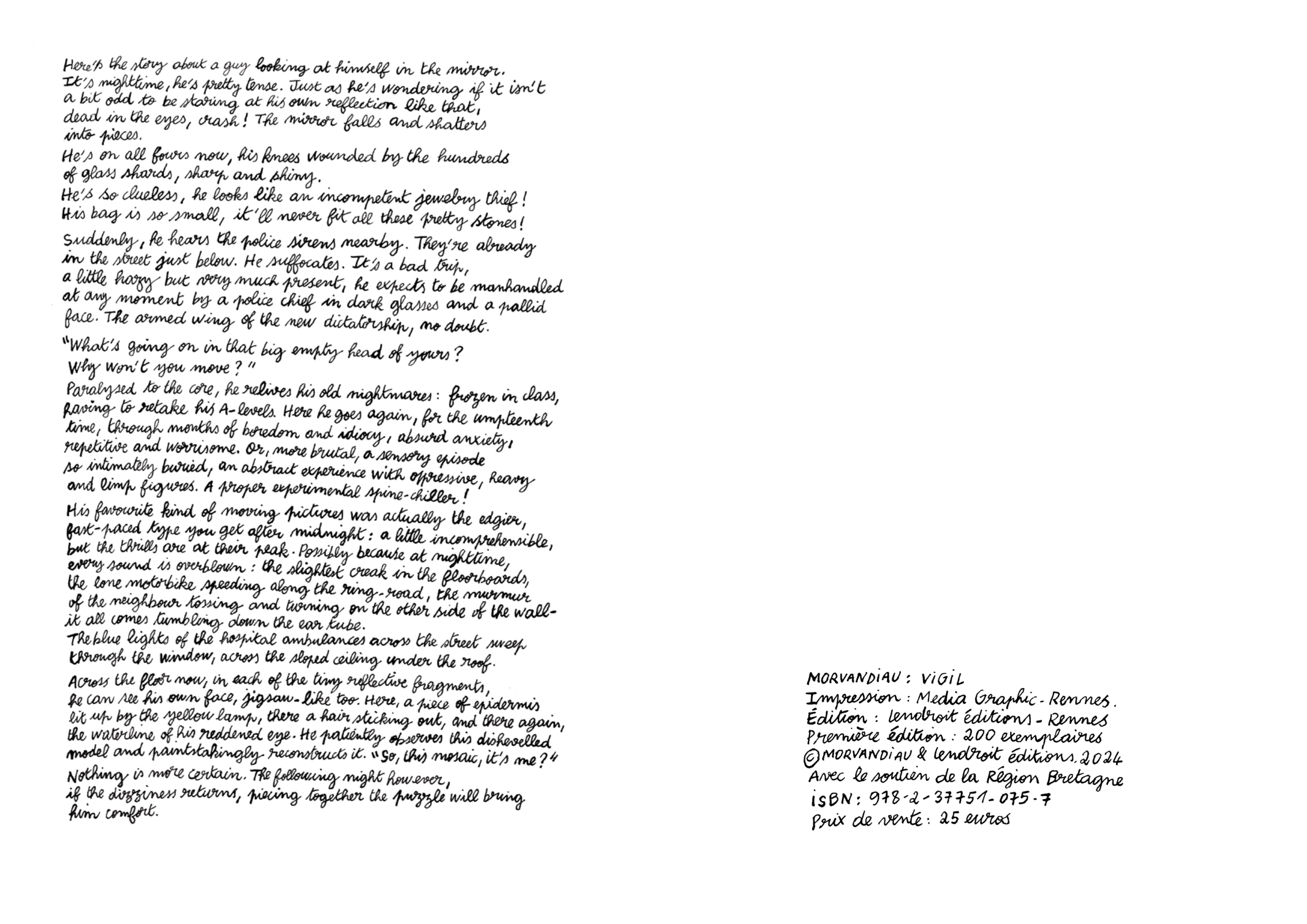 Morvandiau, plus connu comme auteur de bande-dessinée et dessinateur de presse, à profité d'innombrables séances de dessins nocturnes pour élaborer sans le savoir un livre d'artiste où la peinture, le dessin et le sens de la vie s'acoquinent page après page.