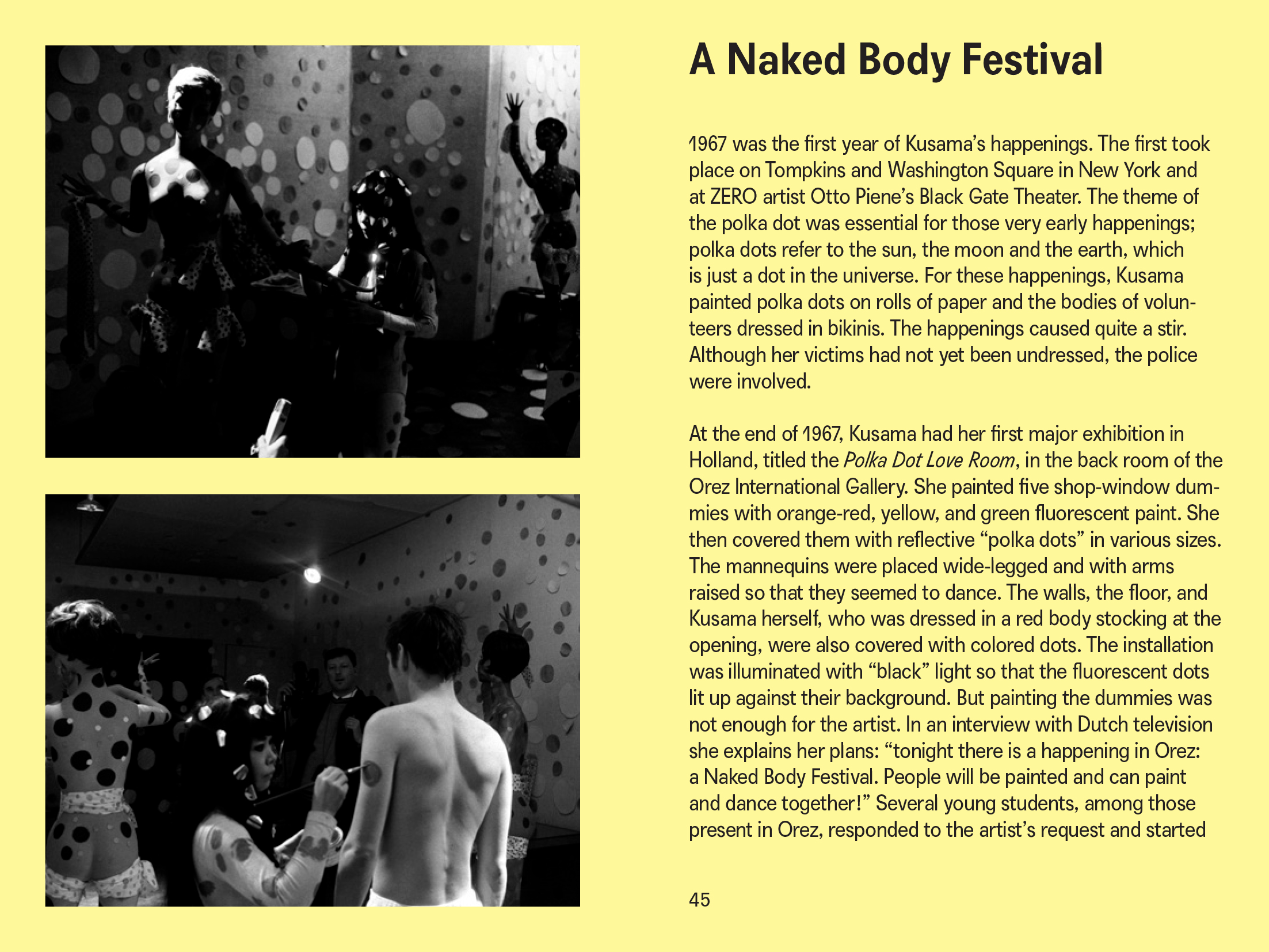 La première publication à fournir une vue d'ensemble des premières activités performatives de Kusama, avec des photos inédites et des œuvres oubliées provenant de collections privées.