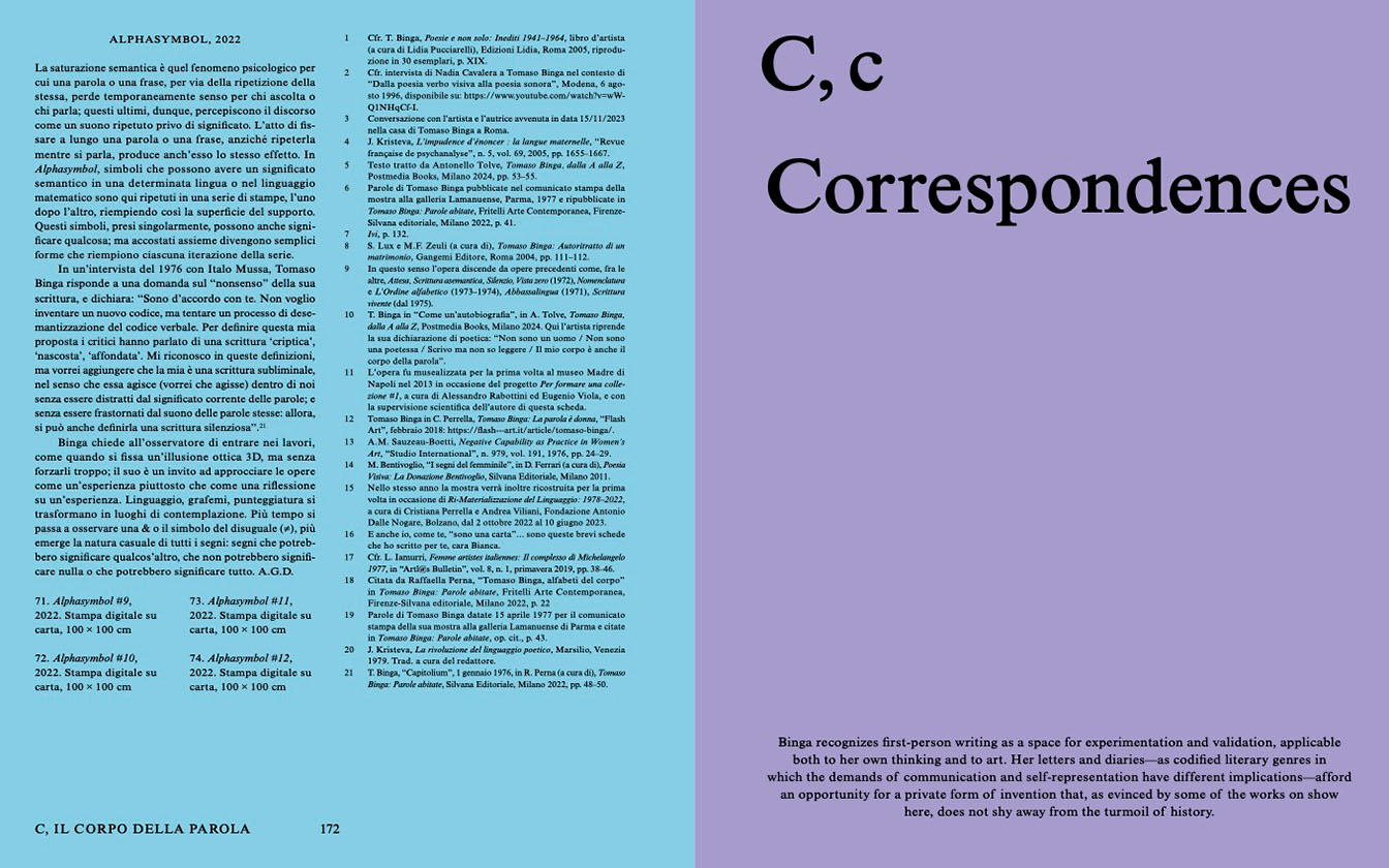 Retraçant les moments clés de la pratique artistique de Tomaso Binga, l'ouvrage est divisé en trois grandes sections. La première, purement textuelle, comprend des textes d'Eva Fabbris, Daria Khan, Quinn Latimer, Lilou Vidal et Stefania Zuliani, ainsi qu'une conversation entre l'artiste elle-même et Luca Lo Pinto. La deuxième partie rassemble une série de courts textes critiques qui proposent une analyse approfondie d'œuvres uniques et de petits ensembles d'œuvres de Tomaso Binga. Ces contenus sont subdivisés en six catégories (Agora, Biographies, the Corporeal Nature of the Word, Correspondences, Geographies, Vaginal Value) afin de permettre d'approfondir les principaux domaines d'intérêt de la pratique de Tomaso Binga dans l'ordre chronologique. Marc Bembekoff, Barbara Casavecchia, Martina Cavalli, Chiara Costa, Anna Cuomo, Valérie Da Costa, Allison Grimaldi Donahue, Daria Khan, Émilie Notéris, Raffaella Perna, Antonello Tolve et Andrea Viliani apportent ainsi des contributions critiques. La troisième et dernière partie est consacrée aux poèmes visuels de l'artiste. Chaque poème est accompagné d'une traduction en anglais, dans plusieurs cas publiée ici pour la première fois.