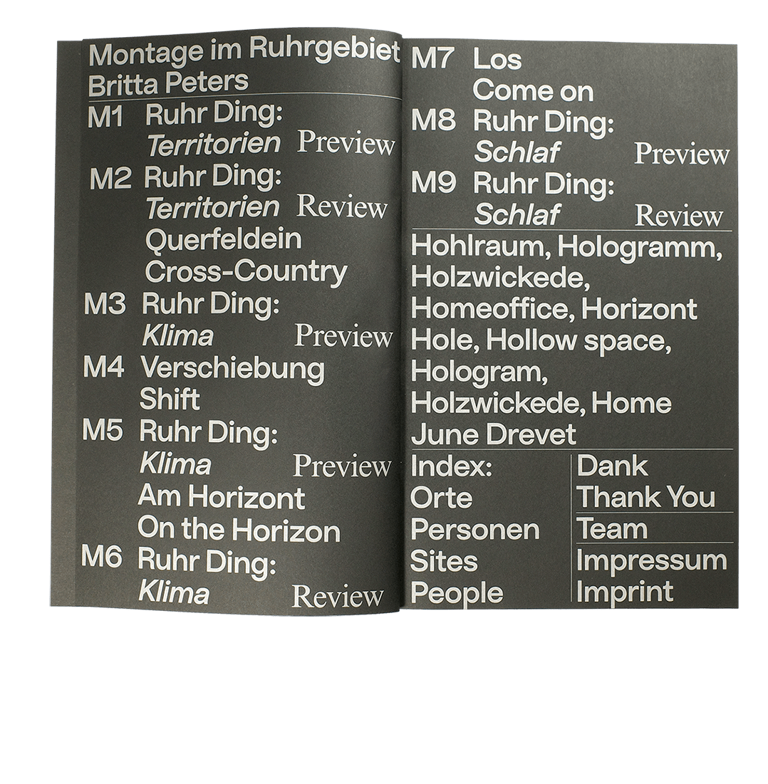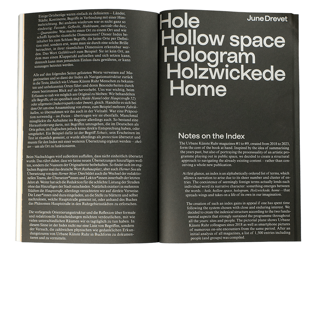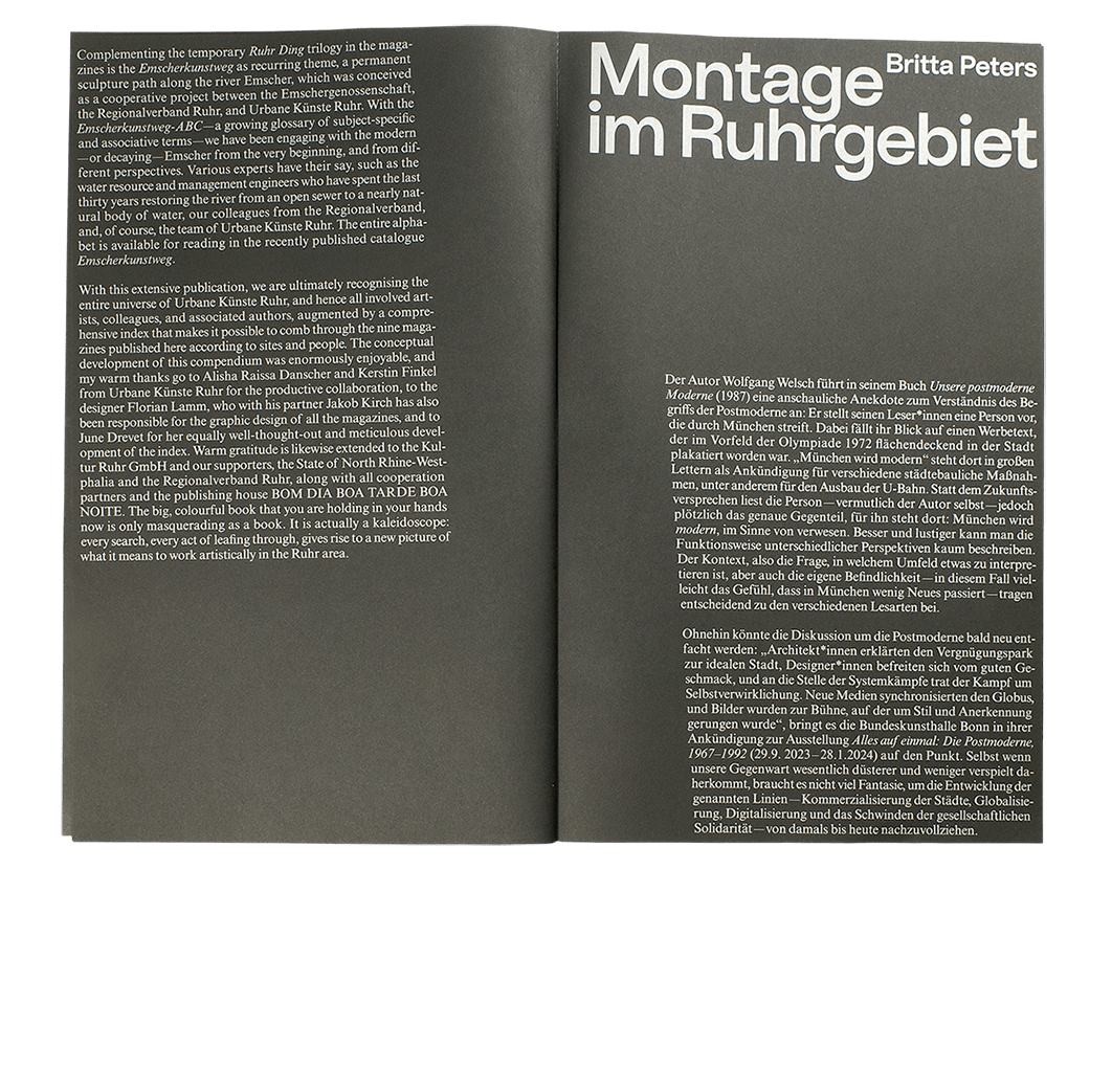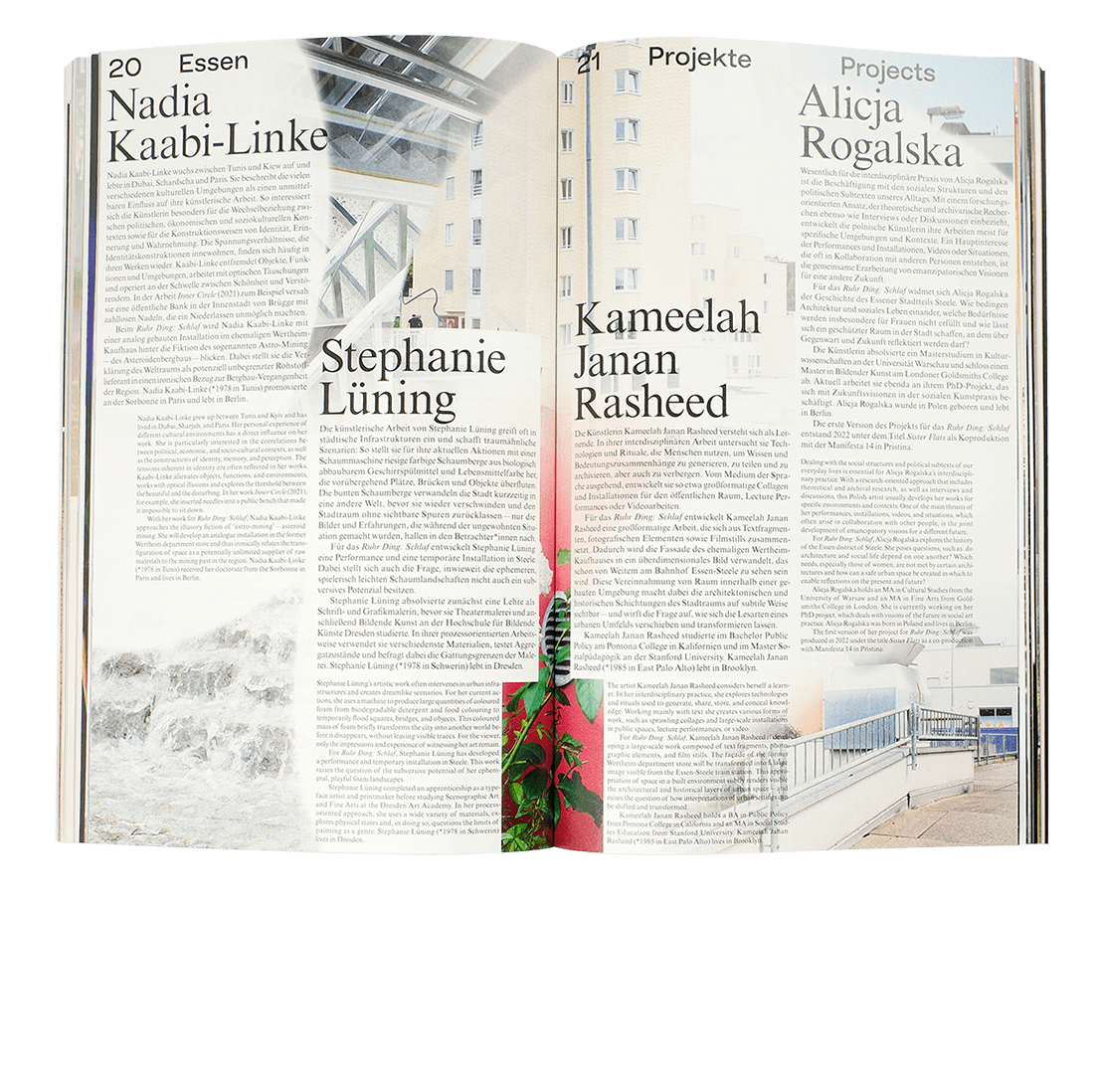 Le recueil des neuf numéros imprimés du magazine Urbane Künste Ruhr parus entre 2019 à 2023, constituant une publication expérimentale qui documente les projets de l'institution sur l'ensemble de la période. Urbane Künste Ruhr y explore les particularités de la région de la Ruhr et la relation entre l'art et le public de diverses manières - sous la forme de contributions académiques, d'essais et de contributions culturelles de nombreux auteurs et artistes.