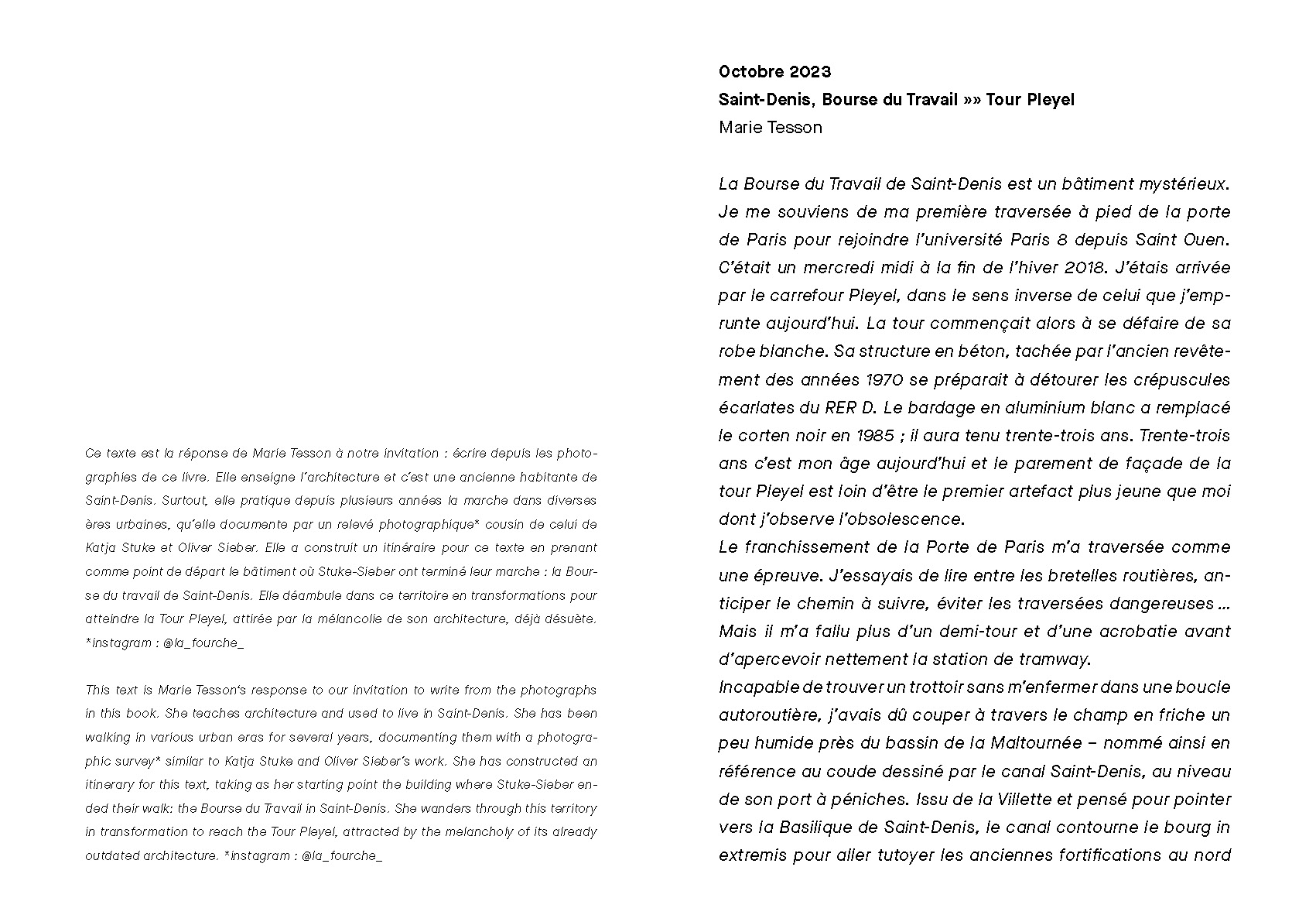 Le texte qui accompagne ce livre est le fruit d'une autre errance, celle de Marie Tesson, de Saint-Denis jusqu'à la Tour Pleyel. Prolongeant ainsi la réflexion sur ce qui se cache sous les multiples strates architecturales de la mégapole.