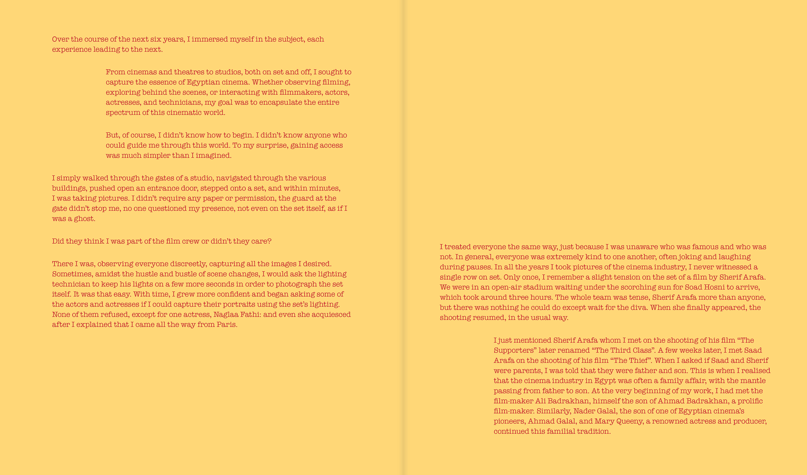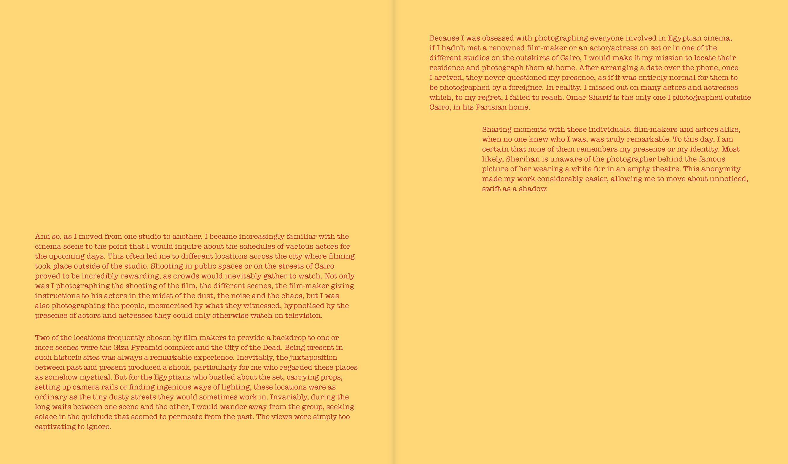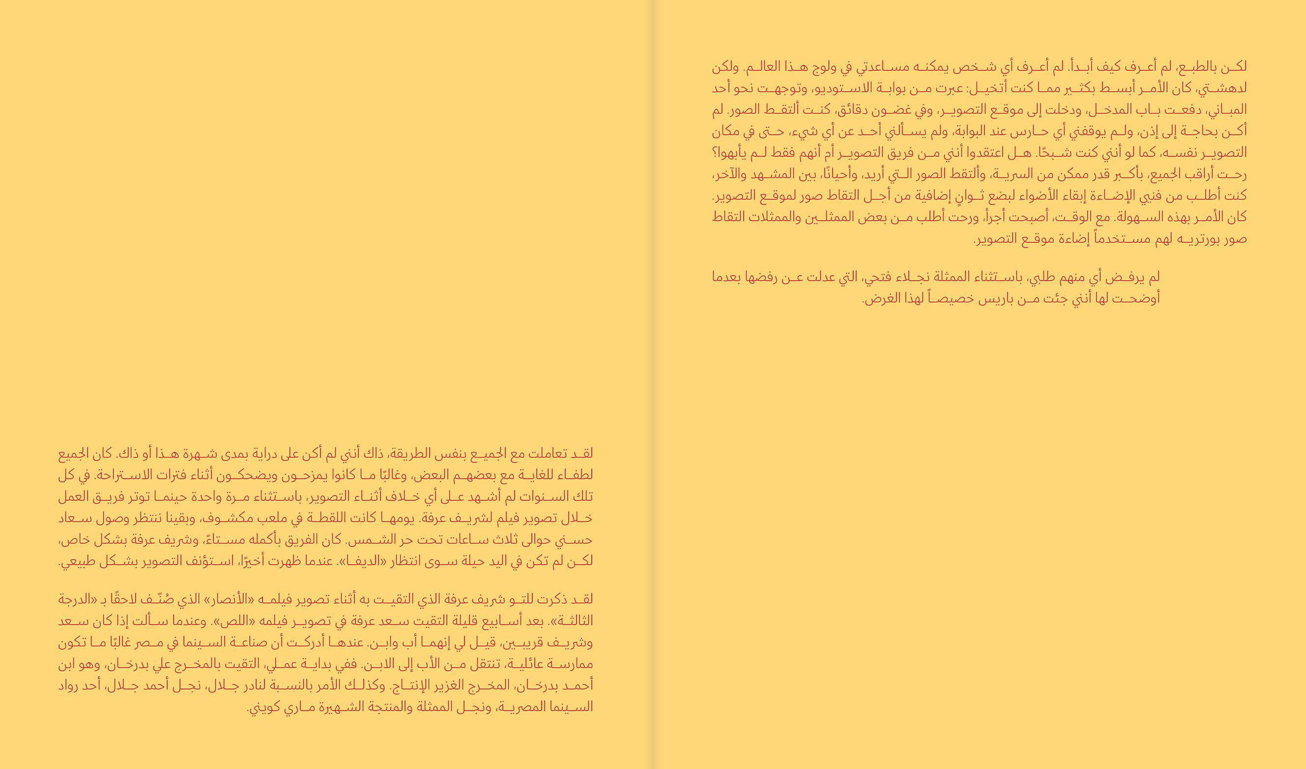 Des cinémas et théâtres aux studios, sur le plateau comme en dehors, l'éminent photographe Fouad ElKoury a cherché à capturer l'essence du cinéma égyptien. Qu'il s'agisse d'observer le tournage, d'explorer les coulisses ou d'interagir avec des cinéastes, des acteurs, des actrices et des techniciens, son objectif était de résumer tout le spectre de ce monde cinématographique.