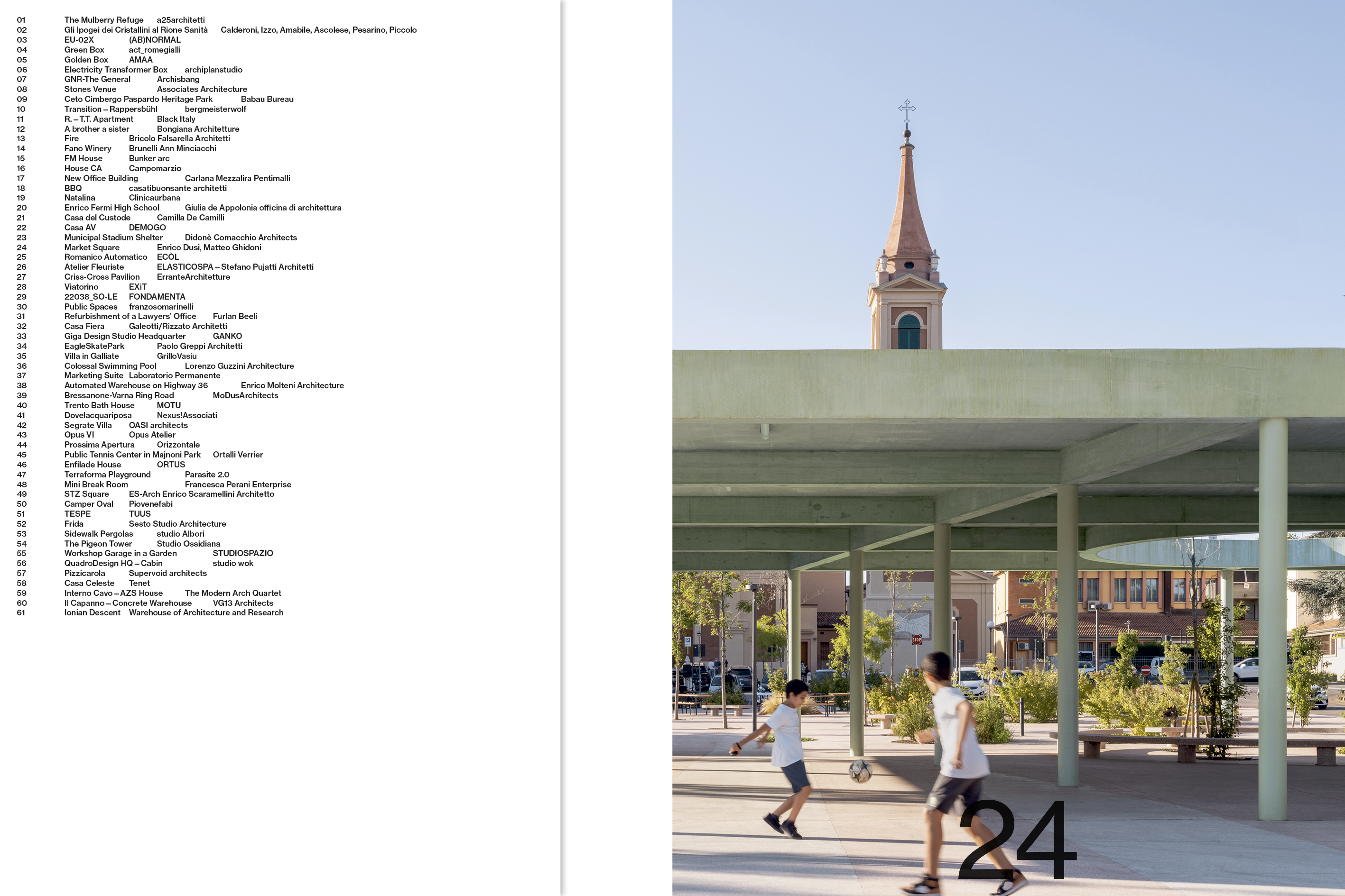 Avec a25architetti, Alberto Calderoni, Ferruccio Izzo, Luigiemanuele Amabile, Marianna Ascolese, Salvatore Pesarino, Gianluca Piccolo, (AB)NORMAL, act_romegialli, AMAA, archiplanstudio, Archisbang, Associates Architecture, Babau Bureau, bergmeisterwolf, Black Italy, Bongiana Architetture, Bricolo Falsarella Architetti, Brunelli Ann Minciacchi, Bunker arc, Campomarzio, Carlana Mezzalira Pentimalli, casatibuonsante architetti, Clinicaurbana, Giulia de Appolonia officina di architettura, Camilla De Camilli, DEMOGO, Didonè Comacchio Architects, Enrico Dusi, Matteo Ghidoni, ECÒL, ELASTICOSPA—Stefano Pujatti Architetti, ErranteArchitetture, EXiT, FONDAMENTA, franzosomarinelli, Furlan Beeli, Galeotti/Rizzato Architetti, GANKO, Paolo Greppi Architetti, GrilloVasiu, Lorenzo Guzzini Architecture, Laboratorio Permanente, Enrico Molteni Architecture, MoDus Architects, MOTU, Nexus!Associati, OASI Architects, Opus Atelier, Orizzontale, Ortalli Verrier, ORTUS, Parasite 2.0, Francesca Perani Enterprise, ES-Arch Enrico Scaramellini Architetto, Piovenefabi, TUUS, Sesto Studio Architecture, studio Albori, Studio Ossidiana, Studiospazio, studio wok, Supervoid architects, Tenet, The Modern Arch Quartet, VG13 Architects, Warehouse of Architecture and Research.