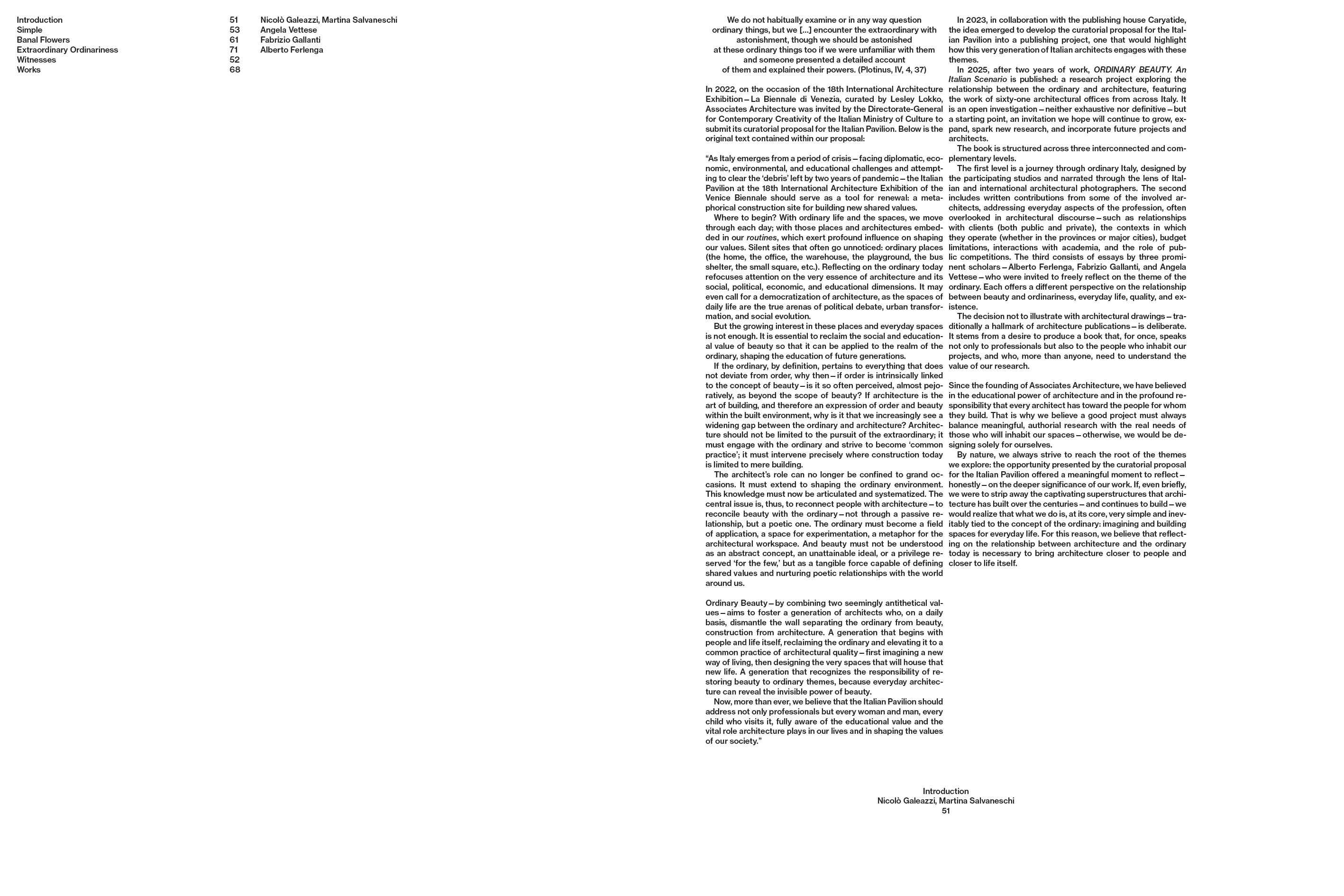Ordinary Beauty, en combinant deux mots aux valeurs apparemment antithétiques, vise à mettre en lumière une génération d'architectes italiens qui, jour après jour, démantèle le mur érigé entre « ordinaire » et « beauté », « construction » et « architecture ». Partant des gens et de la vie, ils ont réhabilité le concept d'ordinaire, l'élevant à une pratique régulière de qualité architecturale, en imaginant d'abord une nouvelle manière de vivre, puis le contenant de cette nouvelle vie. Une génération qui a reconnu la responsabilité de ramener la beauté dans les questions ordinaires, car l'architecture ordinaire peut révéler le pouvoir invisible de la beauté.