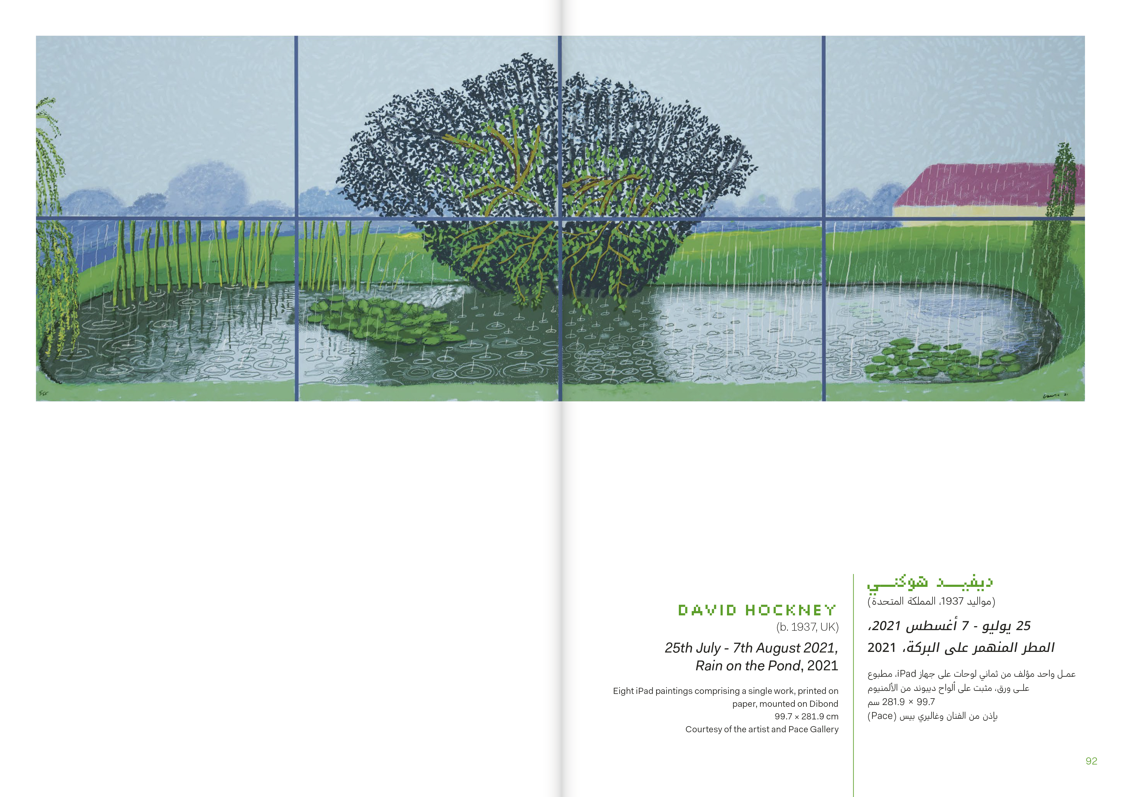 Avec Ibrahim Abumsmar, Mahdi Aljeraibi, Turki Alqahtani, Omar Alzahrani, Mohammed Chrouro, Ayman Yossri Daydban, Eiman Elgibreen, Mounir Fatmi, Saeed Gamhawi, Samia Halaby, David Hockney, Soufiane Idrissi, Ziad Kaki, Khaled Makhshoush, Ahmed Mater, Bennett Miller, Nam June Paik, John Salvest, Faisal Samra, Ania Soliman.