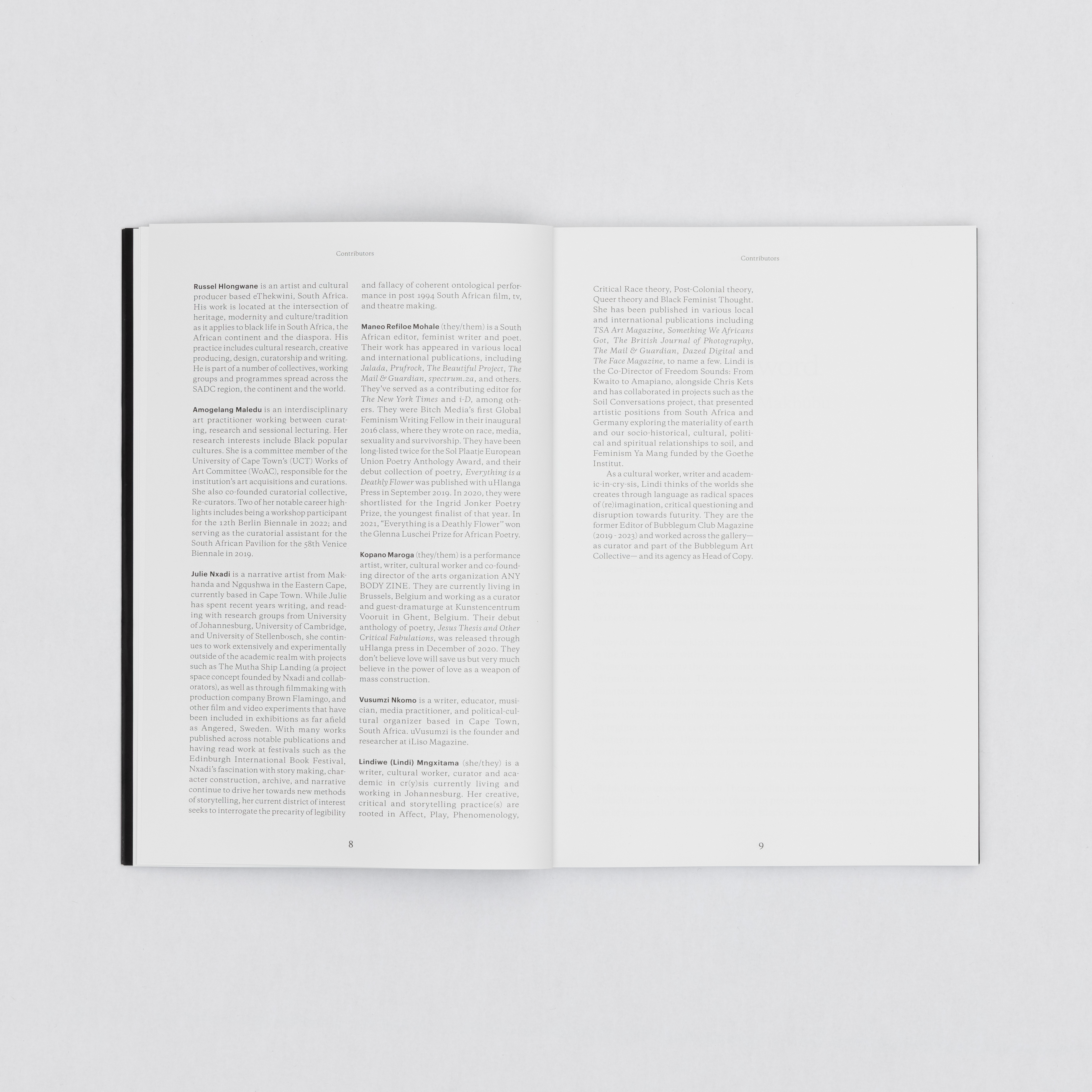Contributions de Thulile Gamedze, Russel Hlongwane, Nomusa Makhubu, Amogelang Maledu, Kopano Maroga, Lindiwe Mngxitama, Maneo Mohale, Vusumzi Nkomo, Julie Nxadi and Luvuyo Equiano Nyawose.