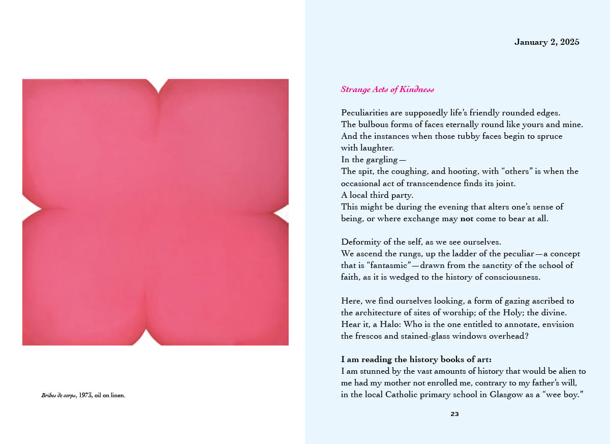 Pour Caland, le corps est un élément obsessionnel constant et un objet d'investigation centrifuge. Ses compositions érotiques sur papier, ses collages expressifs, ses autoportraits et ses célèbres peintures « Bribes de corps » manifestent l'image composite d'un corps en perpétuel mouvement, qui refuse d'être contenu par la logique ou l'idéologie, un moi qui n'est pas prescrit par les autres mais qui est au contraire ouvert à toutes les possibilités de la vie, aux individus et aux interprétations.