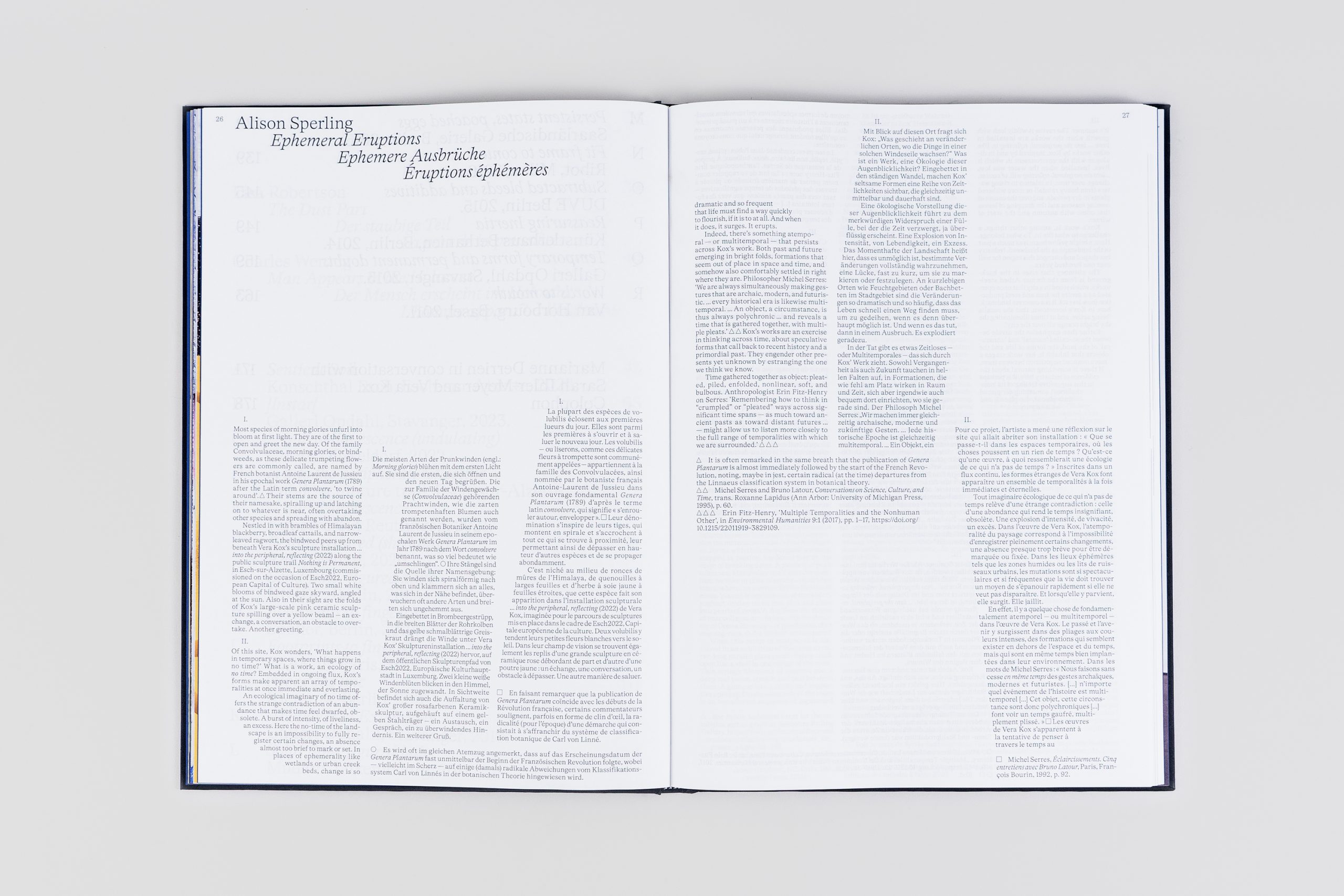 Into est la première monographie de Vera Kox, couvrant plus de 10 ans de pratique multidisciplinaire de l'artiste. Elle est publiée à l'occasion de son exposition personnelle Sentient Soil à la Konschthal Esch. Vera Kox réfléchit à l'impact humain sur les écologies post-industrielles et à leurs traces tangibles, envisageant une transition d'une perspective centrée sur l'homme à une vision du monde multi-espèces. Dans sa pratique sculpturale, elle reconnaît l'action inhérente au matériau lui-même, en mettant l'accent sur la céramique.