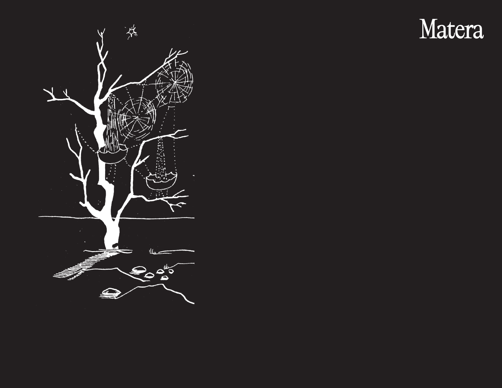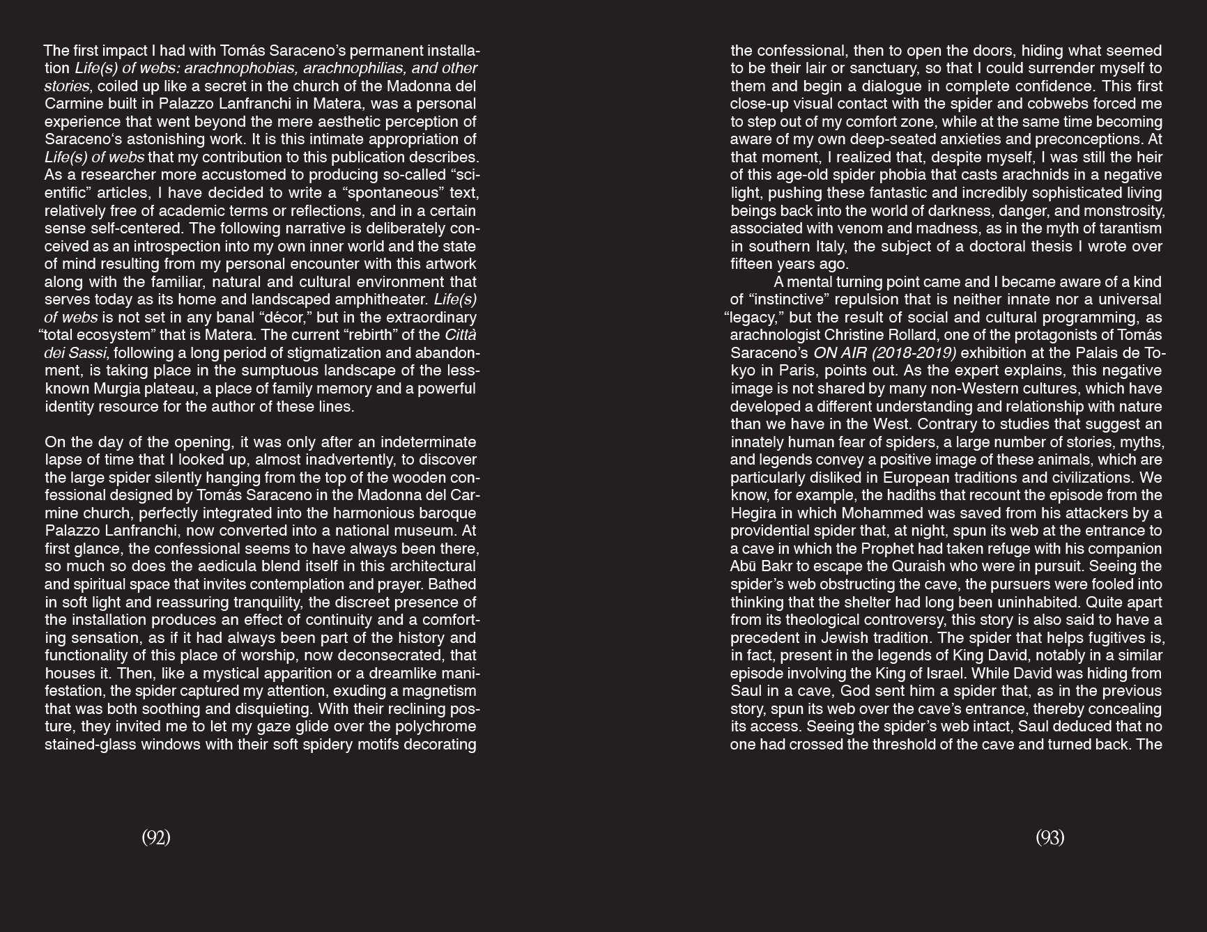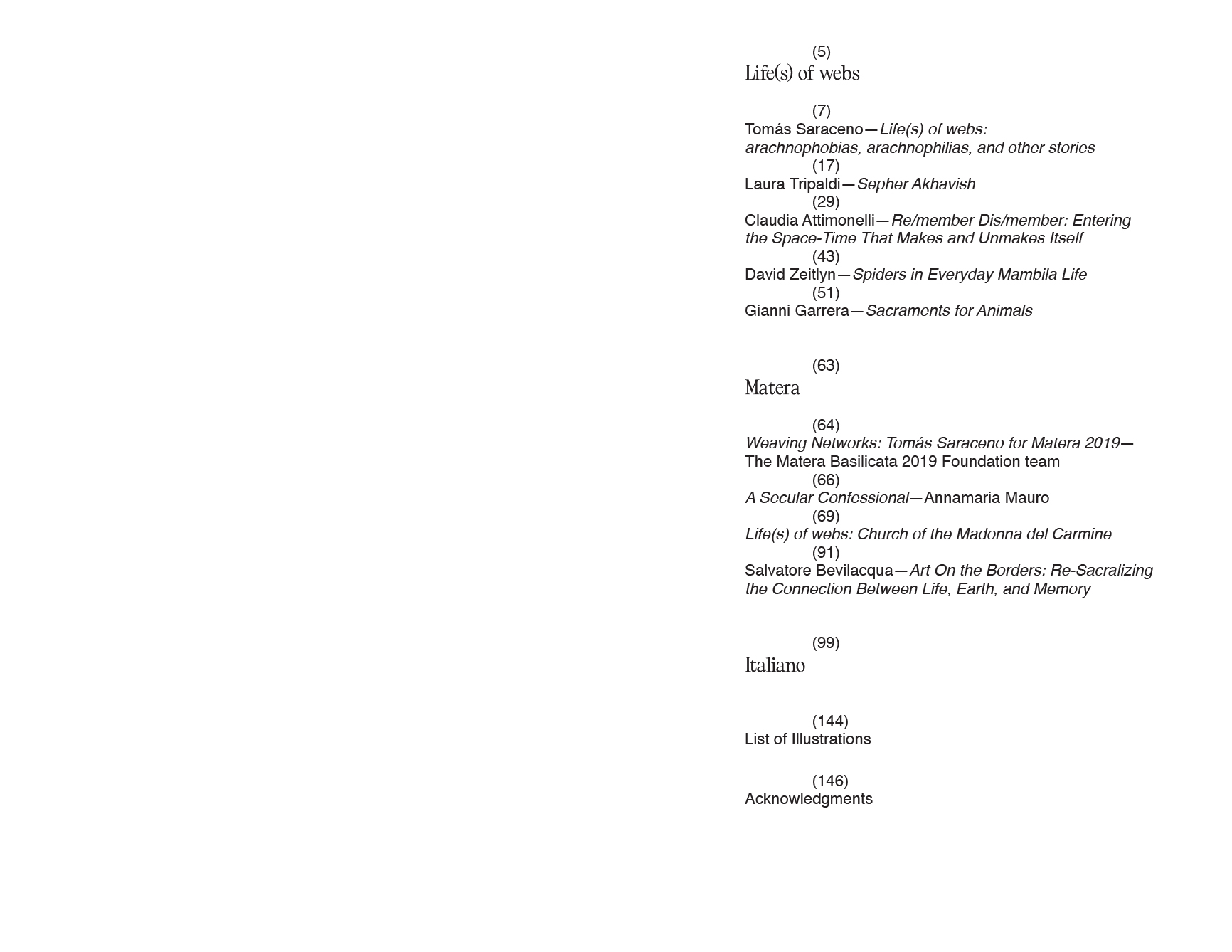 Publié à l'occasion de l'installation permanente éponyme réalisée par Tomás Saraceno dans l'église de la Madonna del Carmine dans le musée national de Matera, cet ouvrage rassemble des essais sur le rôle des araignées et des toiles dans différentes cultures, dans une perspective inter-espèces, ainsi qu'une section d'images en couleur consacrée à l'œuvre de Matera.