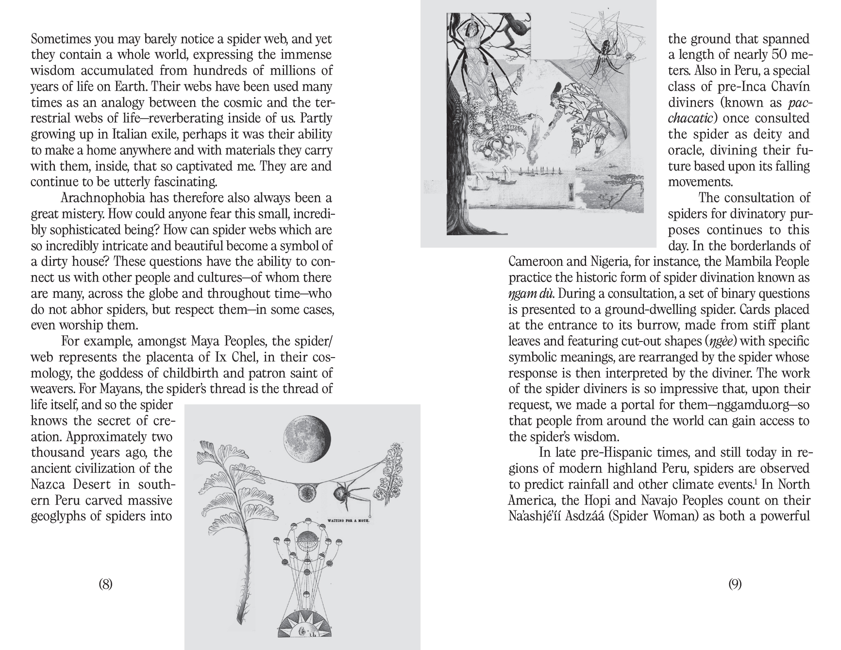 Arachnophobia has therefore also always been a great mystery to me. How could anyone fear this small, incredibly sophisticated being? These questions have led me on a path to connect with other people and cultures like myself—of whom there are many, across the globe and throughout time—who do not abhor spiders, but respect them—in some cases, even worship them. »