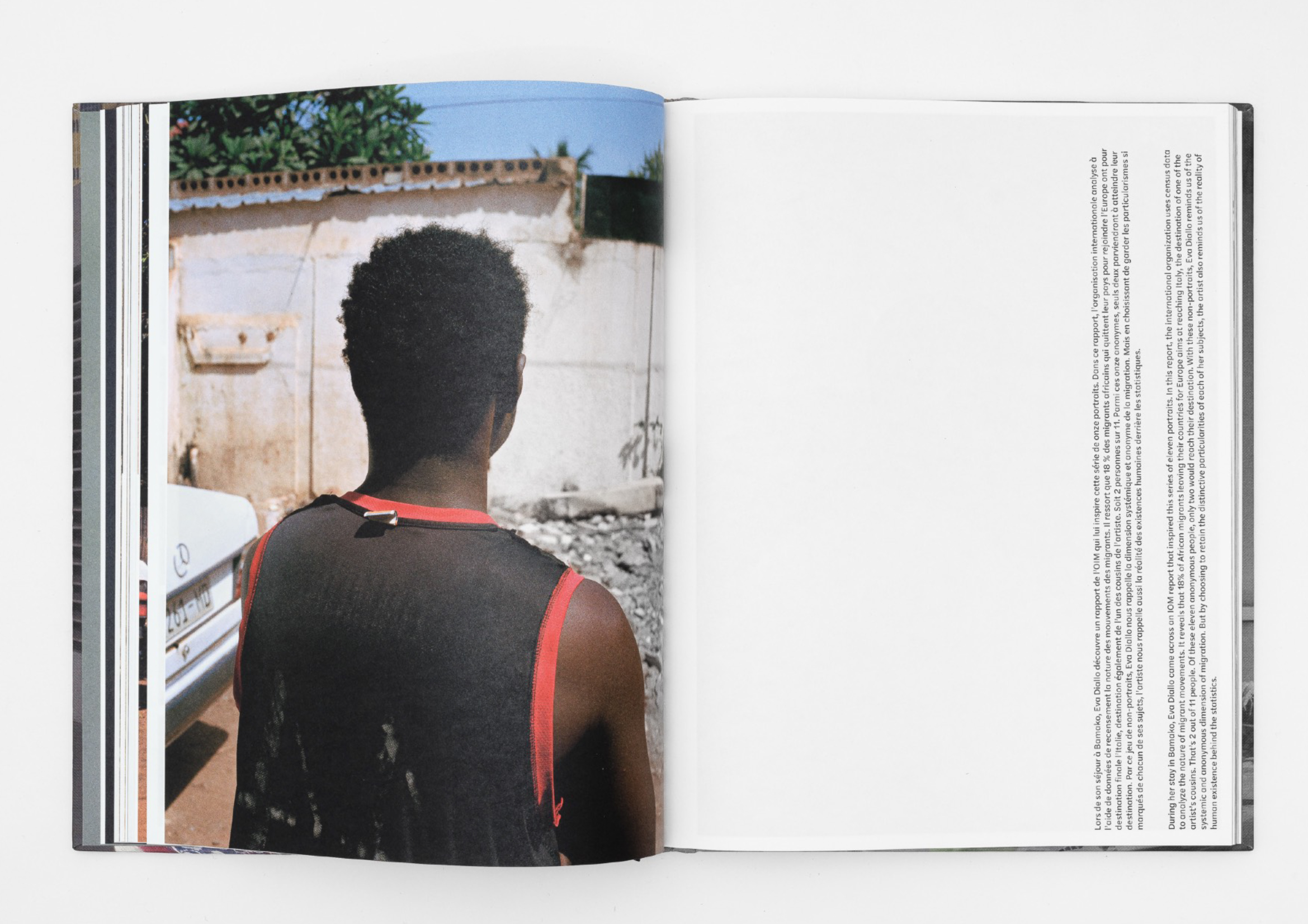 Eva Diallo (née en 1996 à Lausanne, vit et travaille à Dakar) est une photographe suisse-sénégalaise. Ses narrations visuelles se développent autour d'une esthétique du fragment et de l'anecdote. L'artiste évolue à la marge du sujet capturant moments et détails qui concourent à une compréhension sensible des enjeux esthétiques. Face à la question de comment représenter une expérience aussi complexe que celle de la migration, Eva Diallo choisit d'évoluer à la frontière de l'art et du documentaire. Son travail sériel tisse des réseaux de sens qui se font écho d'une œuvre à l'autre et qui imposent de prendre le temps de lire ce que l'on voit. À la consommation hâtive des images souvent générées autour de ces sujets d'actualité, Eva Diallo préfère l'exercice poétique du déchiffrement comme une incitation à l'imagination, seule capable d'appréhender avec richesse et loin des clichés, les multiples facettes de nos vécus contemporains.