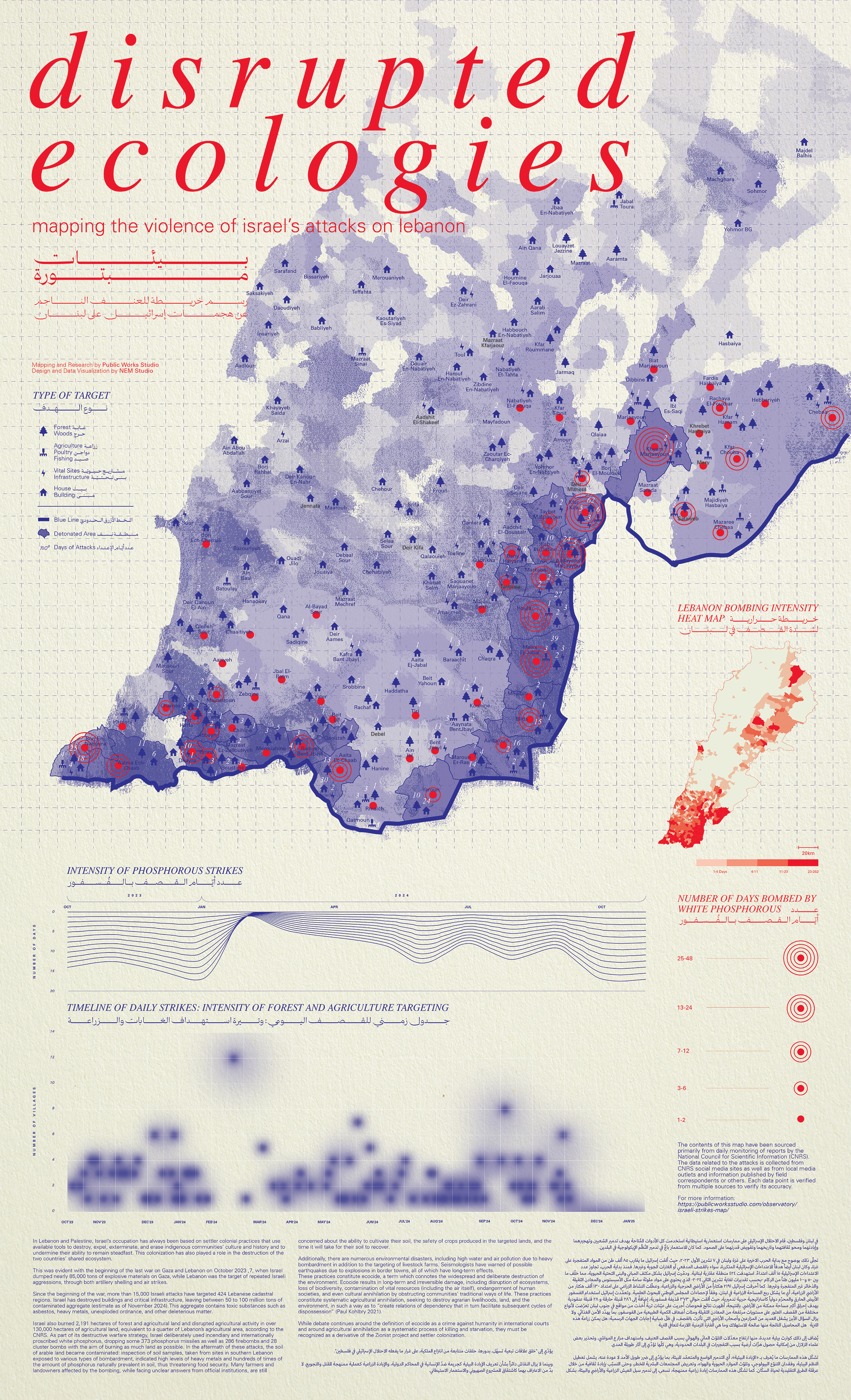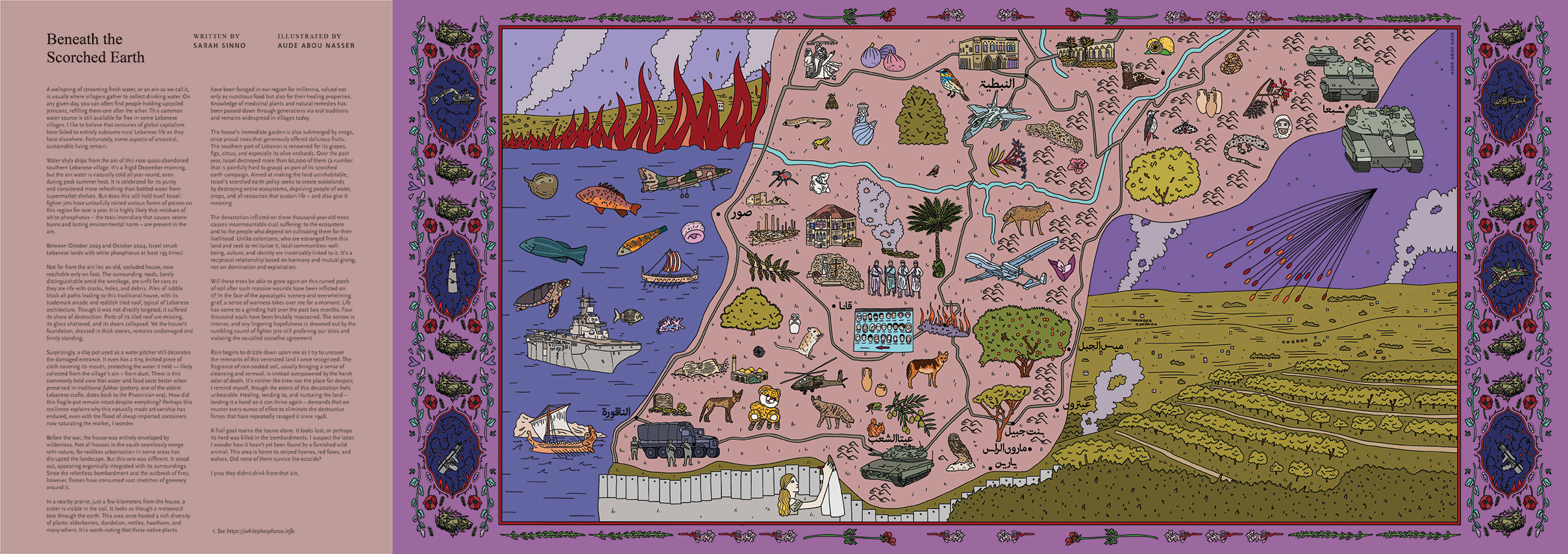 Ce catalogue associe analyses d'experts, récits personnels et perspectives variées sur la destruction, la régénération et la coexistence. De la restauration écologique à l'architecture régénérative en passant par la préservation de la biodiversité libanaise, il souligne l'urgence d'une relation symbiotique entre l'humain et la nature. En contre-cartographiant la destruction environnementale, en réfléchissant aux impacts de la guerre moderne et en adoptant des solutions innovantes, cet ouvrage collectif envisage un héritage pour les générations futures – ancré dans la résilience, l'apprentissage et l'espoir.