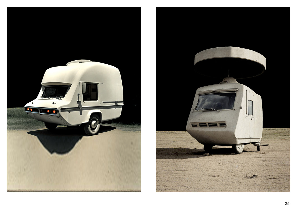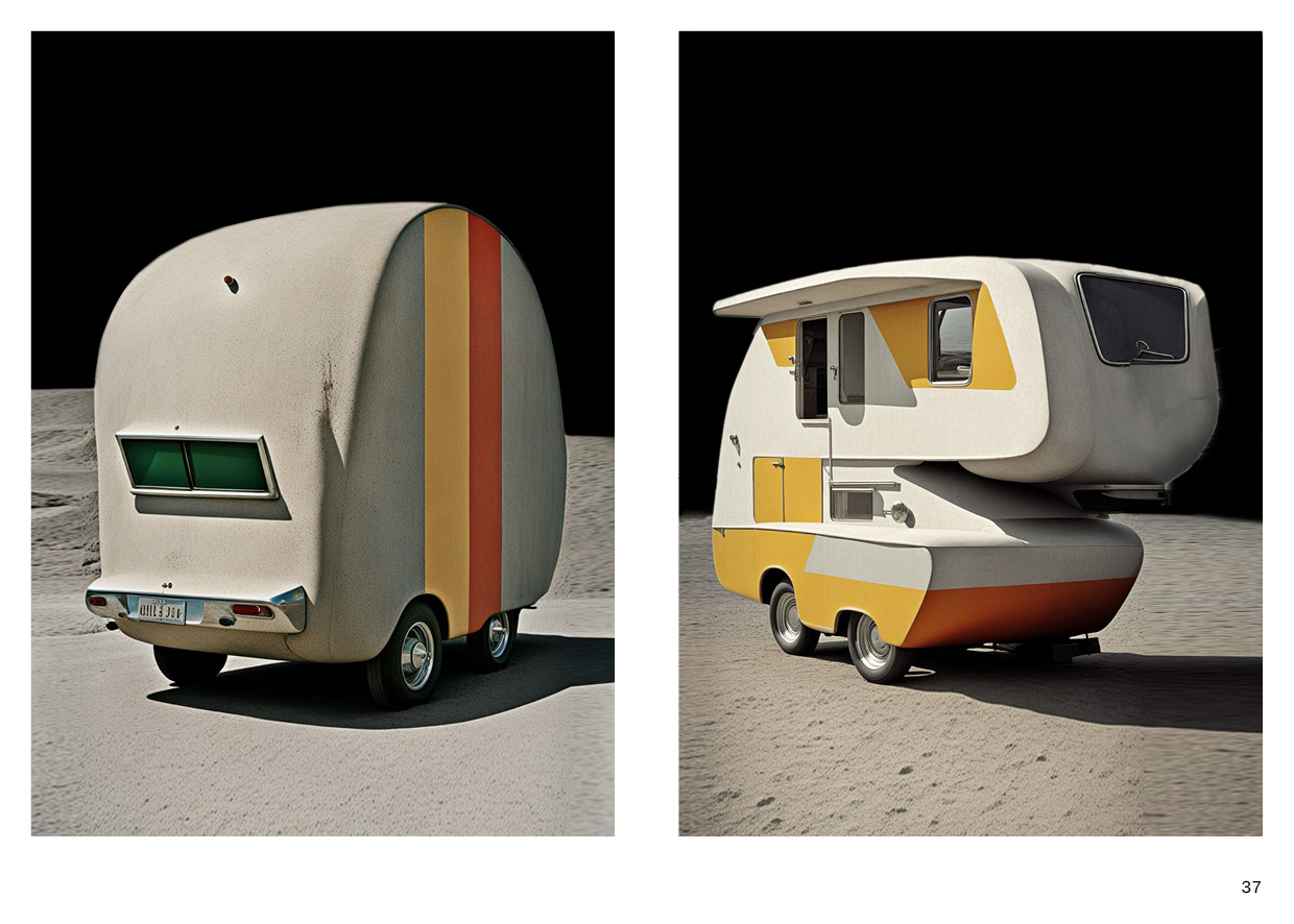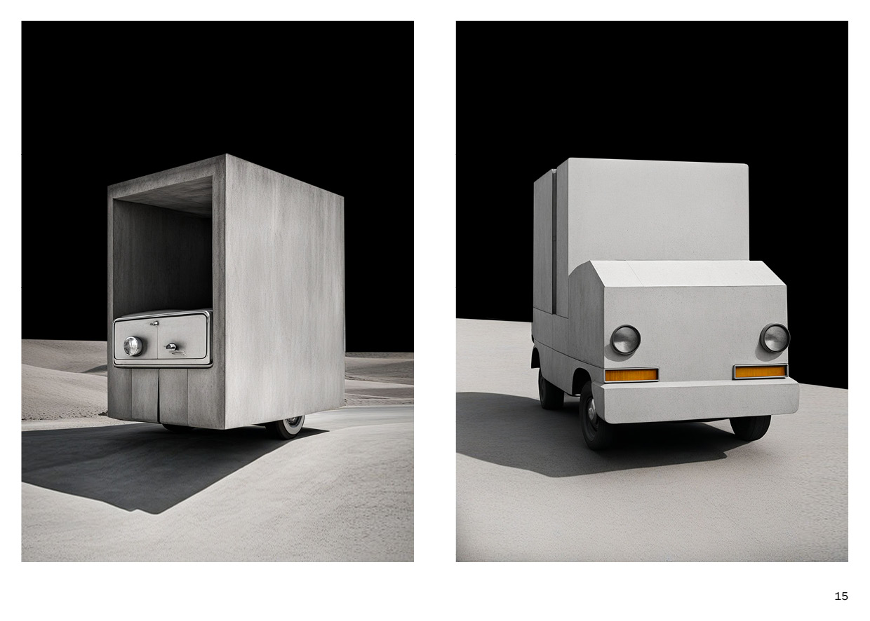 Ces multiples références nourrissent le travail de cette édition et se traduisent visuellement par des images mettant en scène des véhicules en béton. Ces images adoptent une esthétique brute, vintage et lunaire : des voitures, caravanes, camping-cars ou tracteurs réalisés en béton, présentés sur fond noir, soulignant leur robustesse et leur simplicité. Ces objets monolithiques expriment une tension entre passé et futur, entre rudesse et finesse, entre usage et objets manifestes, illustrant comment le béton peut inspirer l'histoire et l'imaginaire du design.