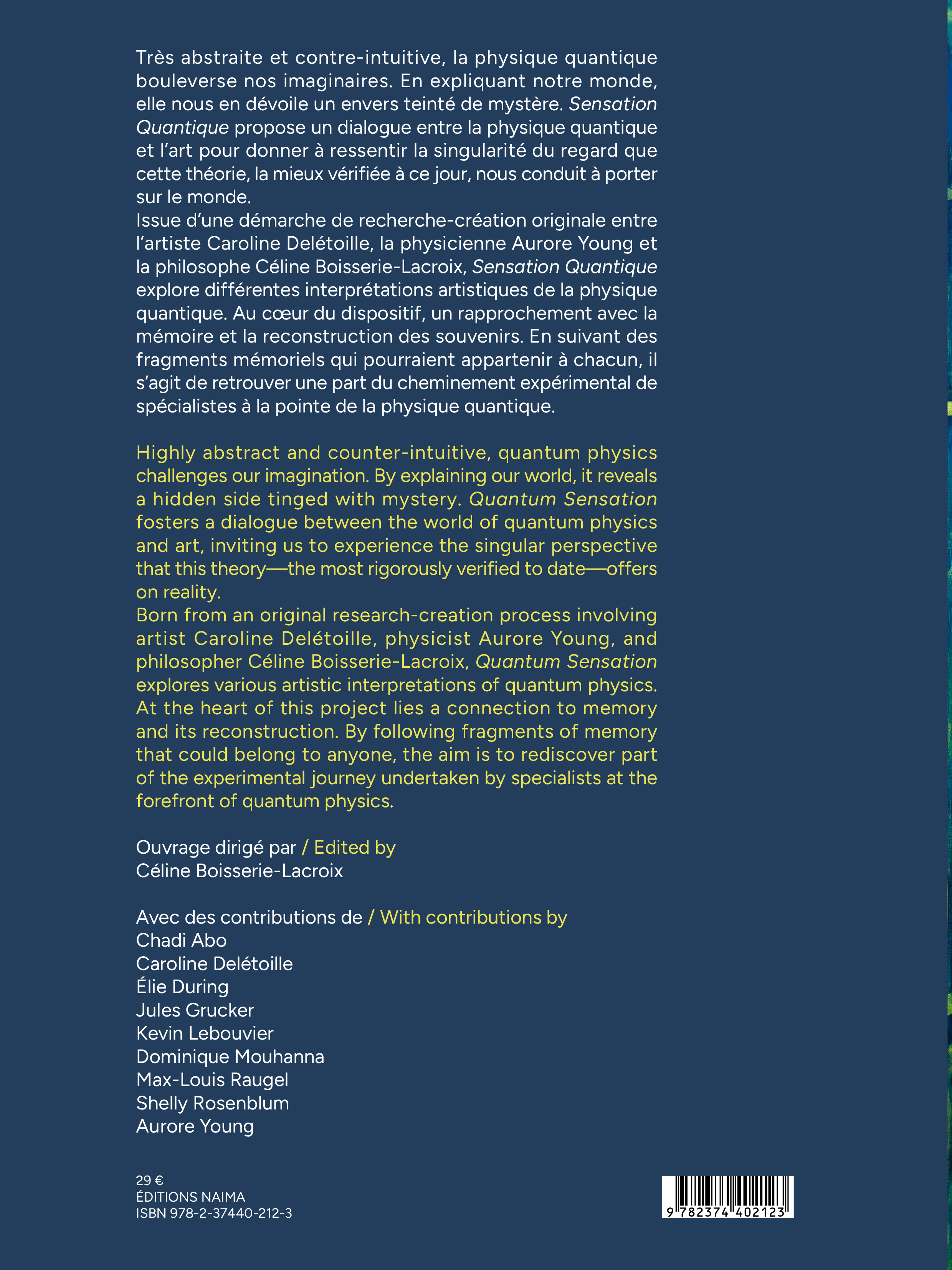 Issue d'une démarche de recherche-création originale entre l'artiste Caroline Delétoille, la physicienne Aurore Young et la philosophe Céline Boisserie-Lacroix, Sensation Quantique explore différentes interprétations artistiques de la physique quantique. Au cœur du dispositif, un rapprochement avec la mémoire et la reconstruction des souvenirs. En suivant des fragments mémoriels qui pourraient appartenir à chacun, il s'agit de retrouver une part du cheminement expérimental de spécialistes à la pointe de la physique quantique.