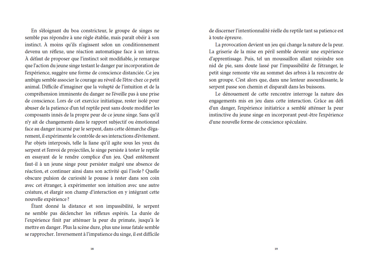 A partir de l'observation d'une société de singes capucins et d'expériences de pensée empruntées au théâtre, Zaven Paré tente de démonter les pièges de l'anthropomorphisation, dans une attention qui cherche à préserver le caractère irréductible d'une coprésence interspecifique.