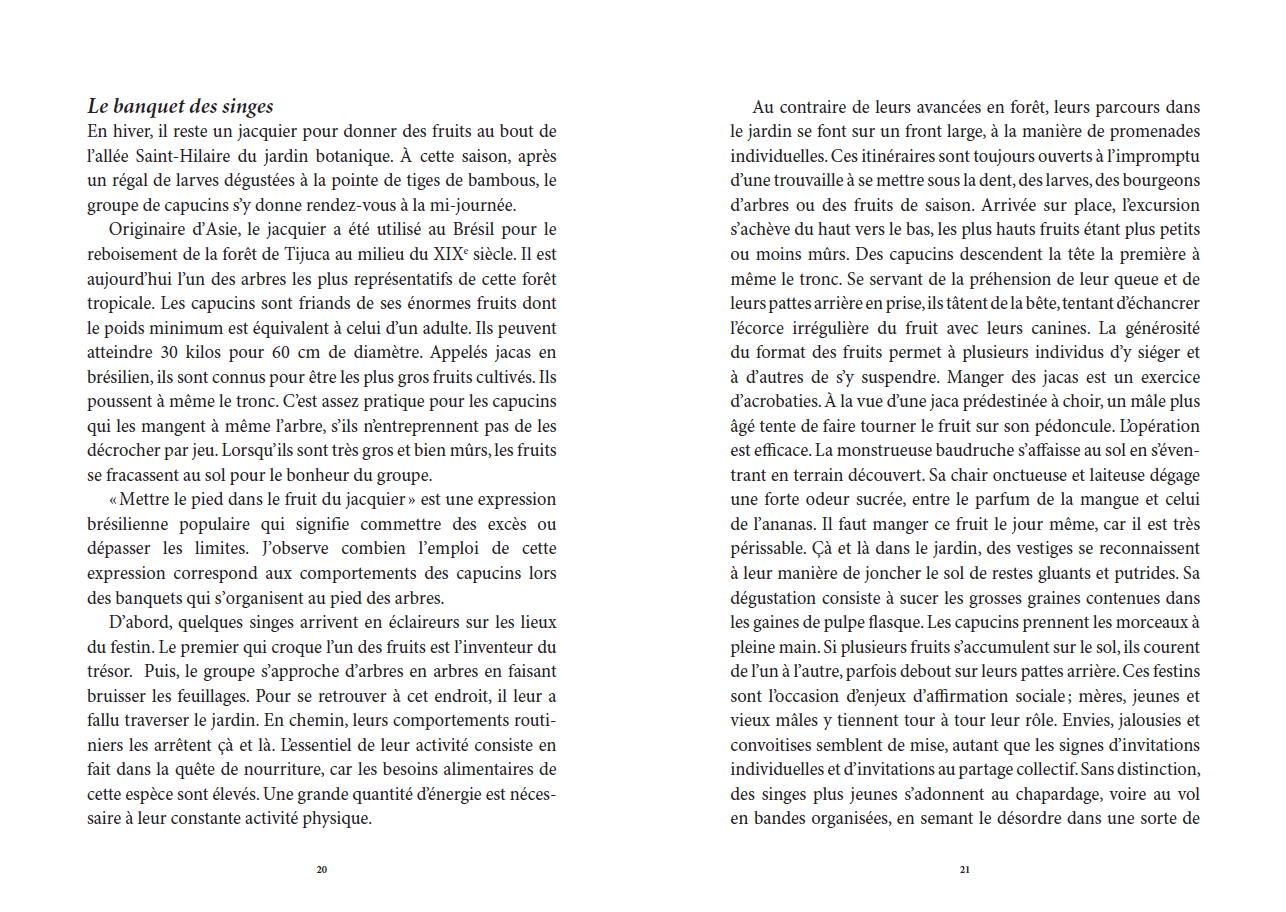 La description d'une vingtaine de singes capucins fréquentant la forêt du jardin botanique de Rio de Janeiro les place tels les personnages d'un spectacle de la nature. De sa position d'observateur, Zaven Paré ne retient que quelques scènes uniques ou qui se répètent dans cette société de singes : le comportement d'un jeune ; un banquet ; l'occasion où le groupe trouve des noix, ou l'achèvement d'une journée. Successivement, il s'agit d'une scène d'apprentissage, d'une scène de partage, de la répétition d'un geste ou de comportements de détachement.